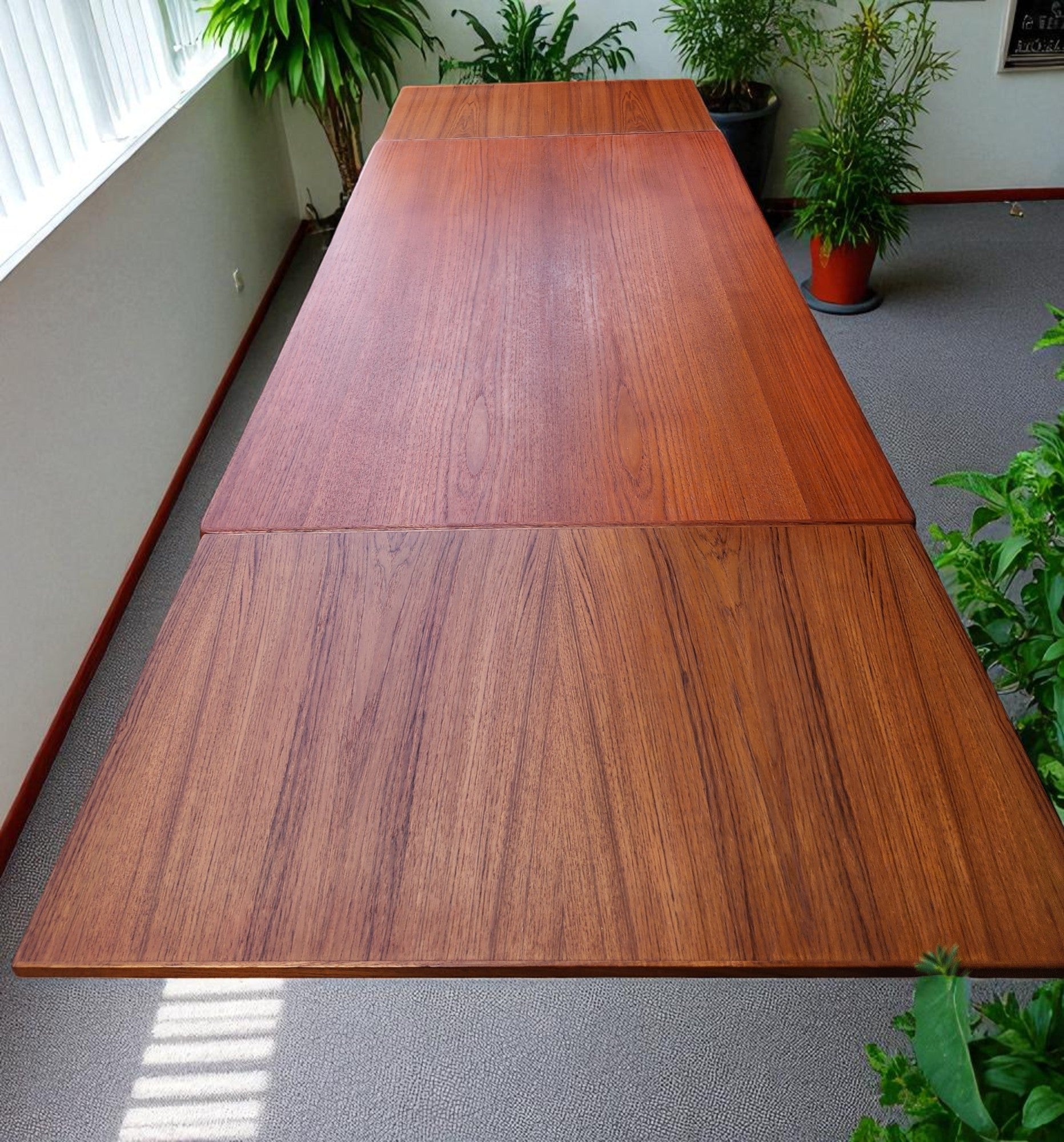 This exquisite Danish Mid Century Modern extension dining table is one of the largest draw-leaf table we have ever seen. Made of teak with a gorgeous grain has been completely stripped, sanded, and refinished with Danish oil to perfection.