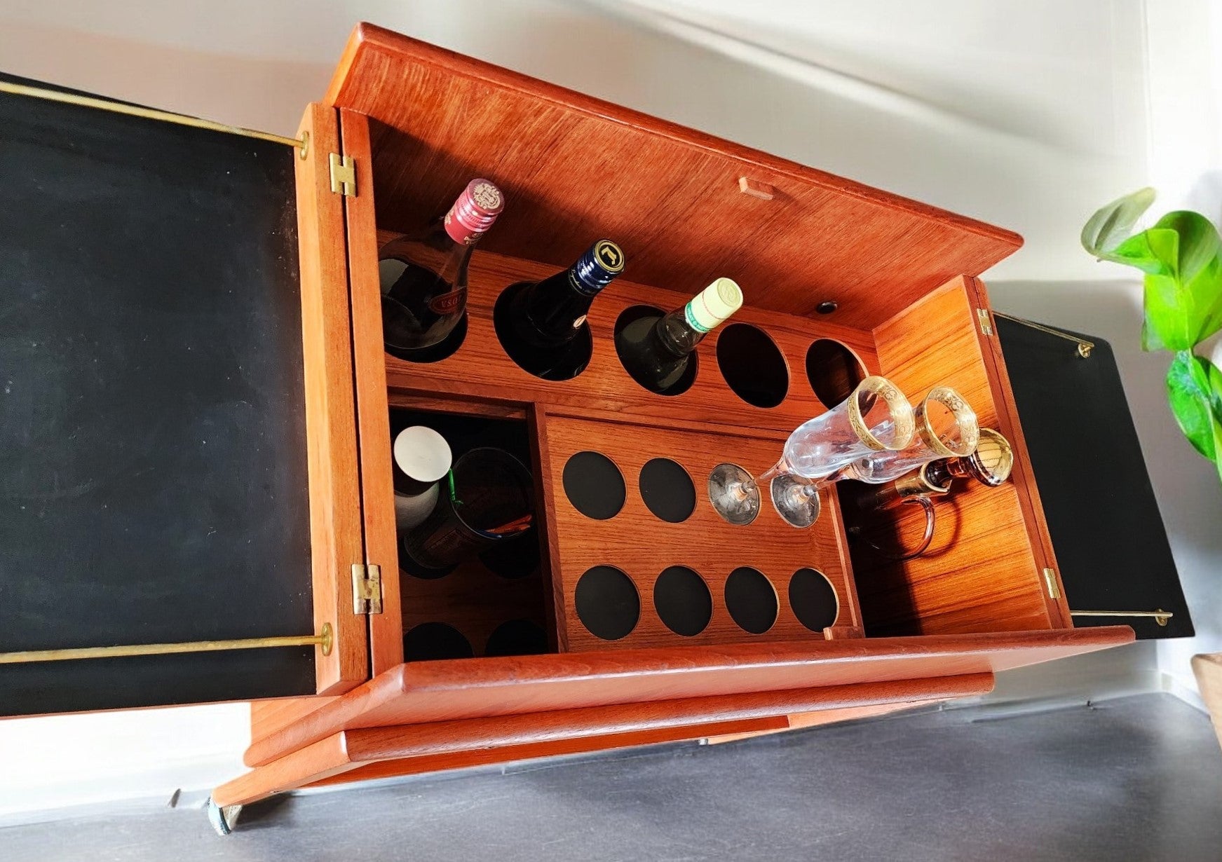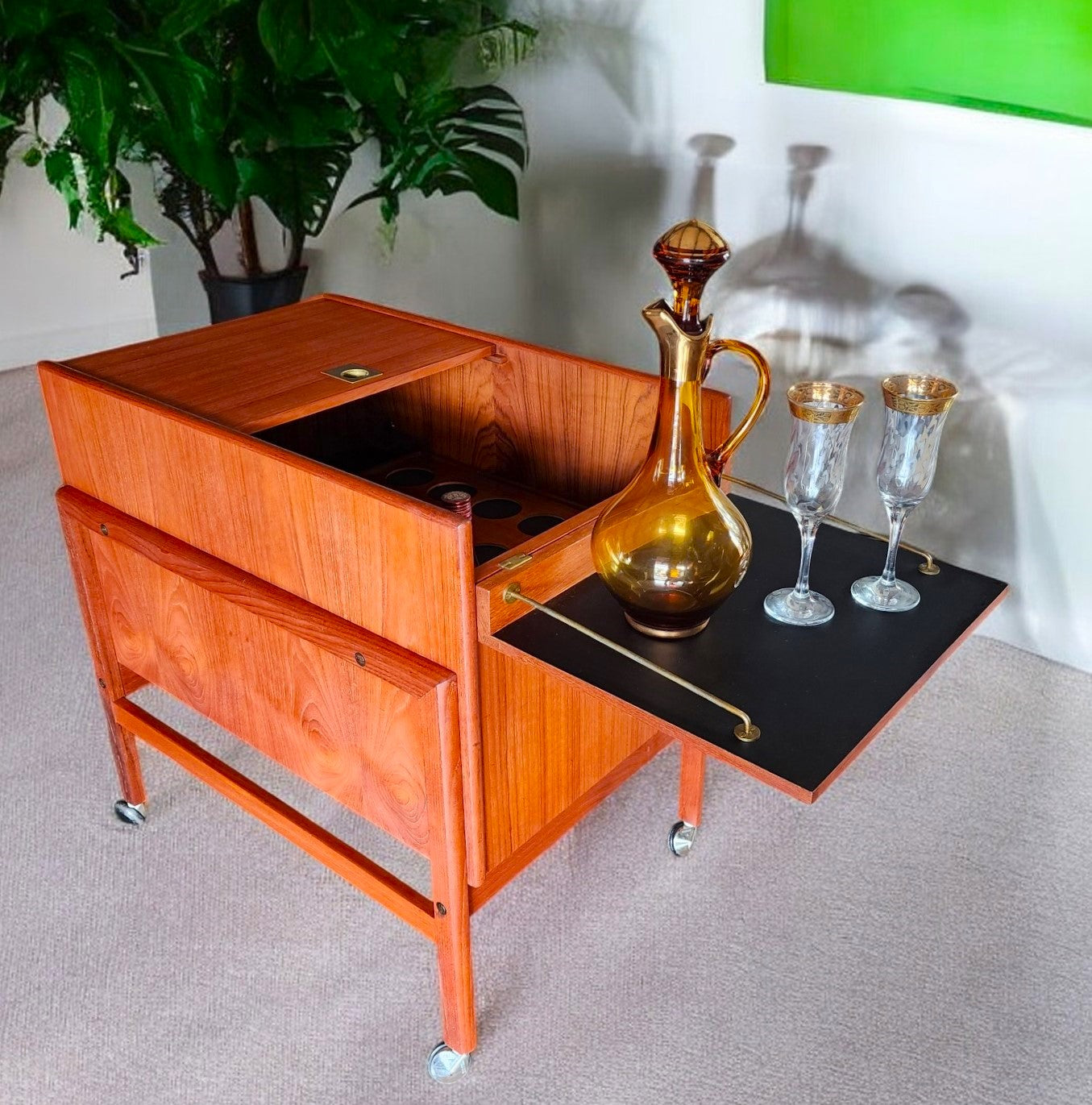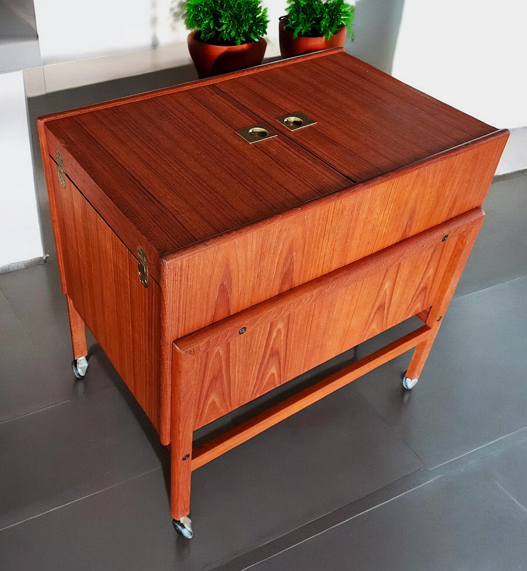 For sale, we have this cool vintage Danish Mid Century Modern teak folding bar cabinet on wheels with brass hardware by Andreas Hansen for Arrebo Møbler. Made in Denmark, 1960’s.