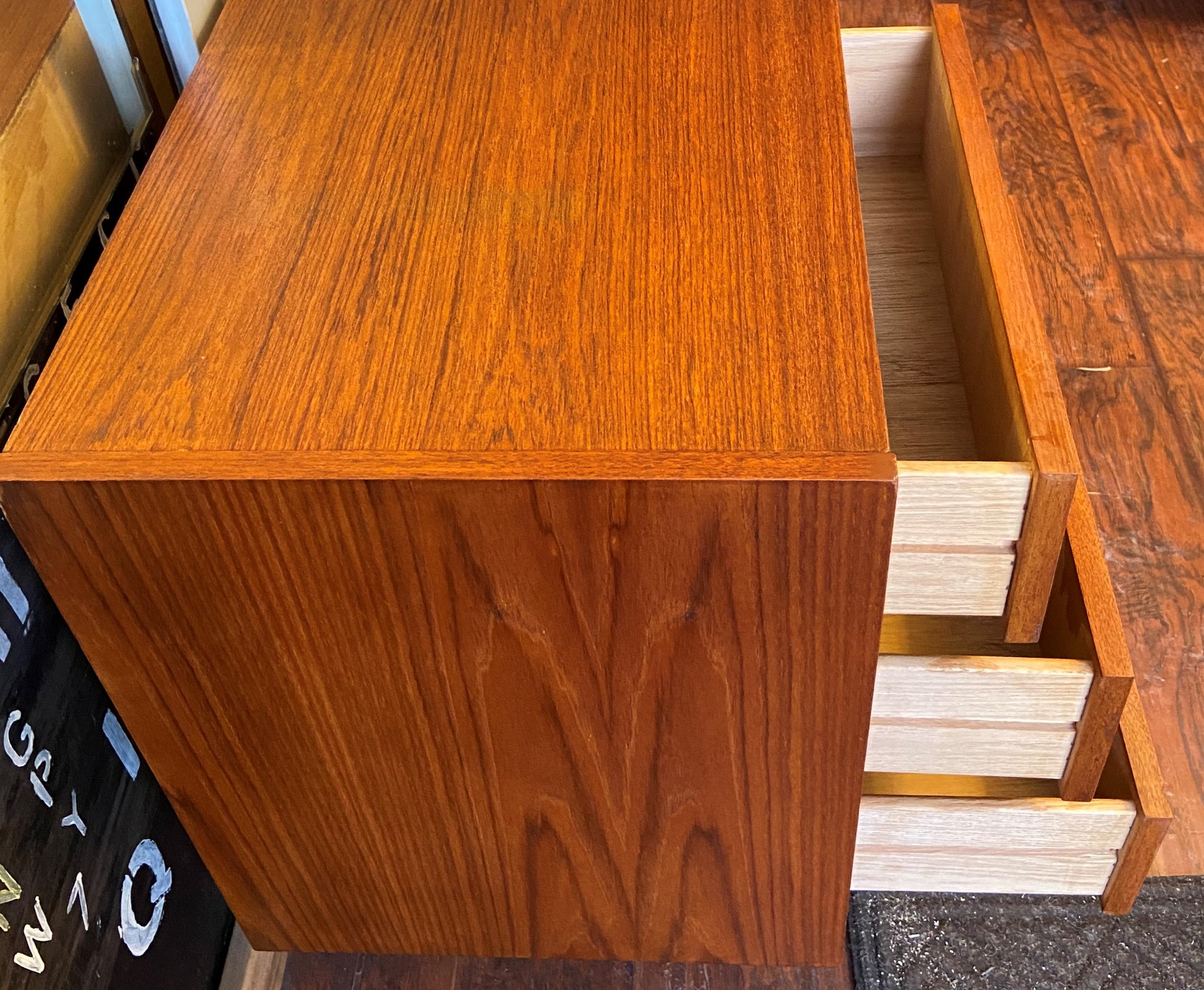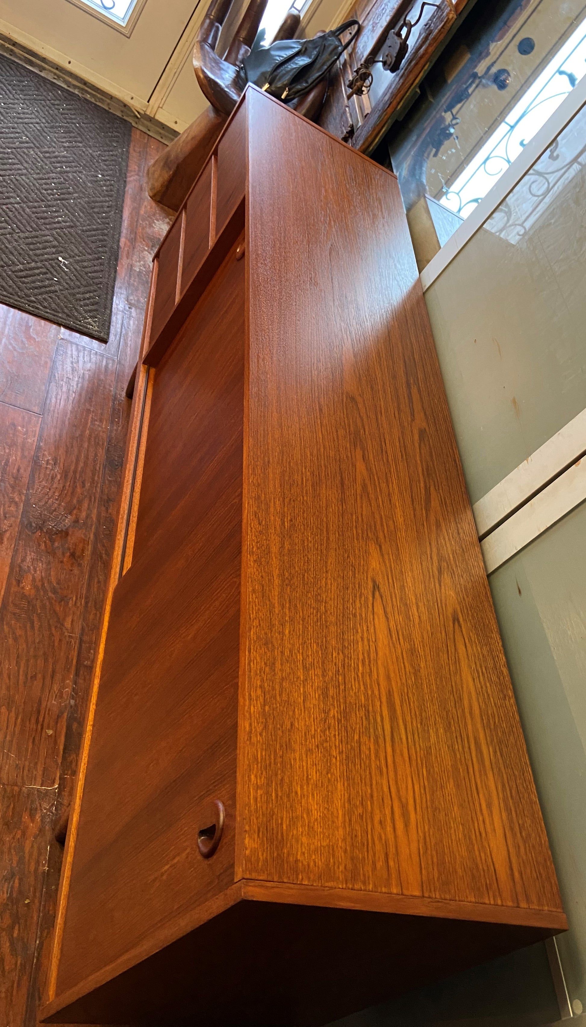 This beautiful Danish Mid Century Modern teak sideboard has been stripped, sanded and refinished with Danish oil to magazine worthy new look. The top is the same color as the front, not lighter.