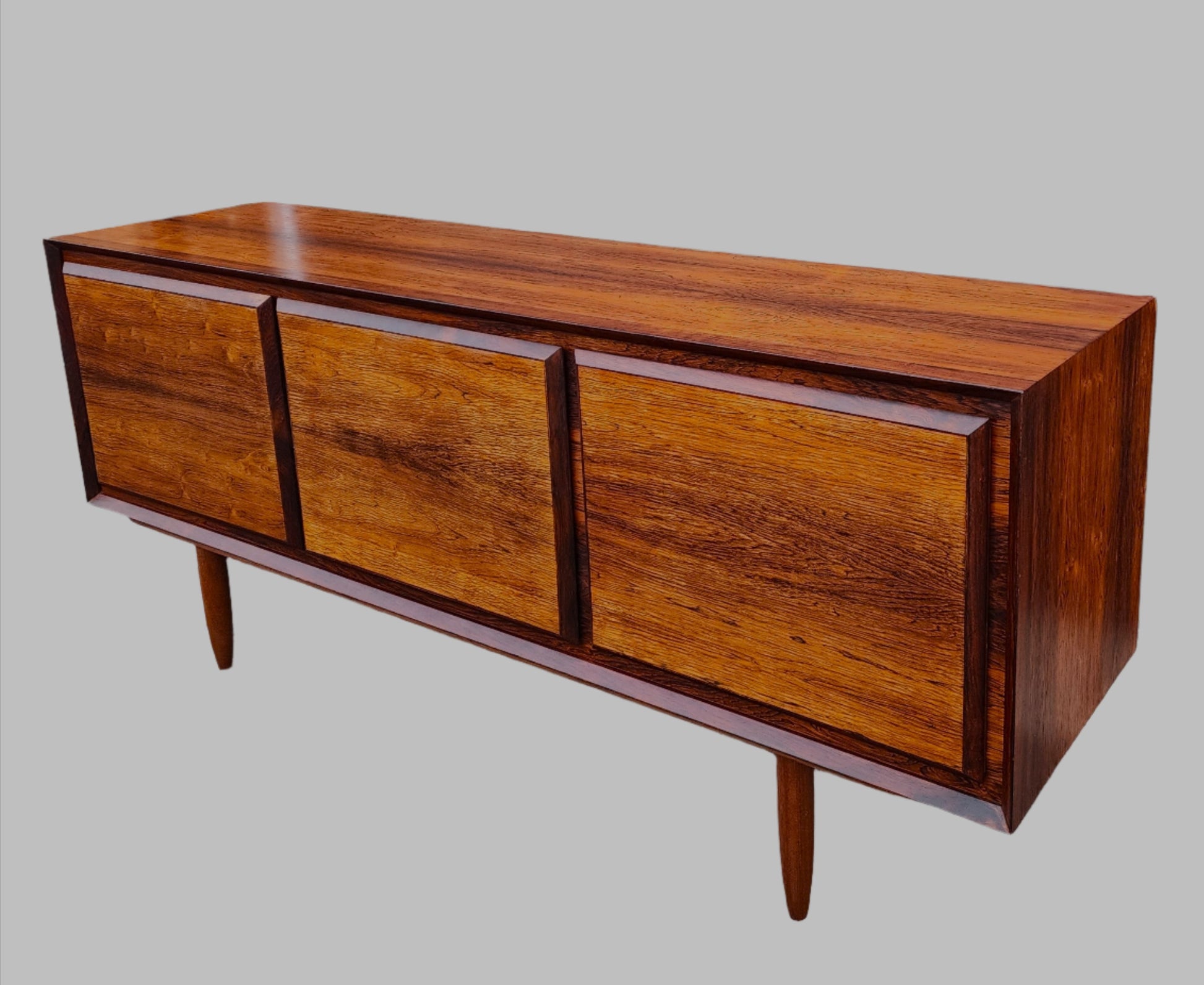 For sale is an exquisite Danish Mid-Century Modern credenza/ sideboard/ TV Media Console or Buffet with a serious designer swank made of gorgeous Brazilian rosewood. The piece offers not only lots of storage but also lots of visual delight that will last.