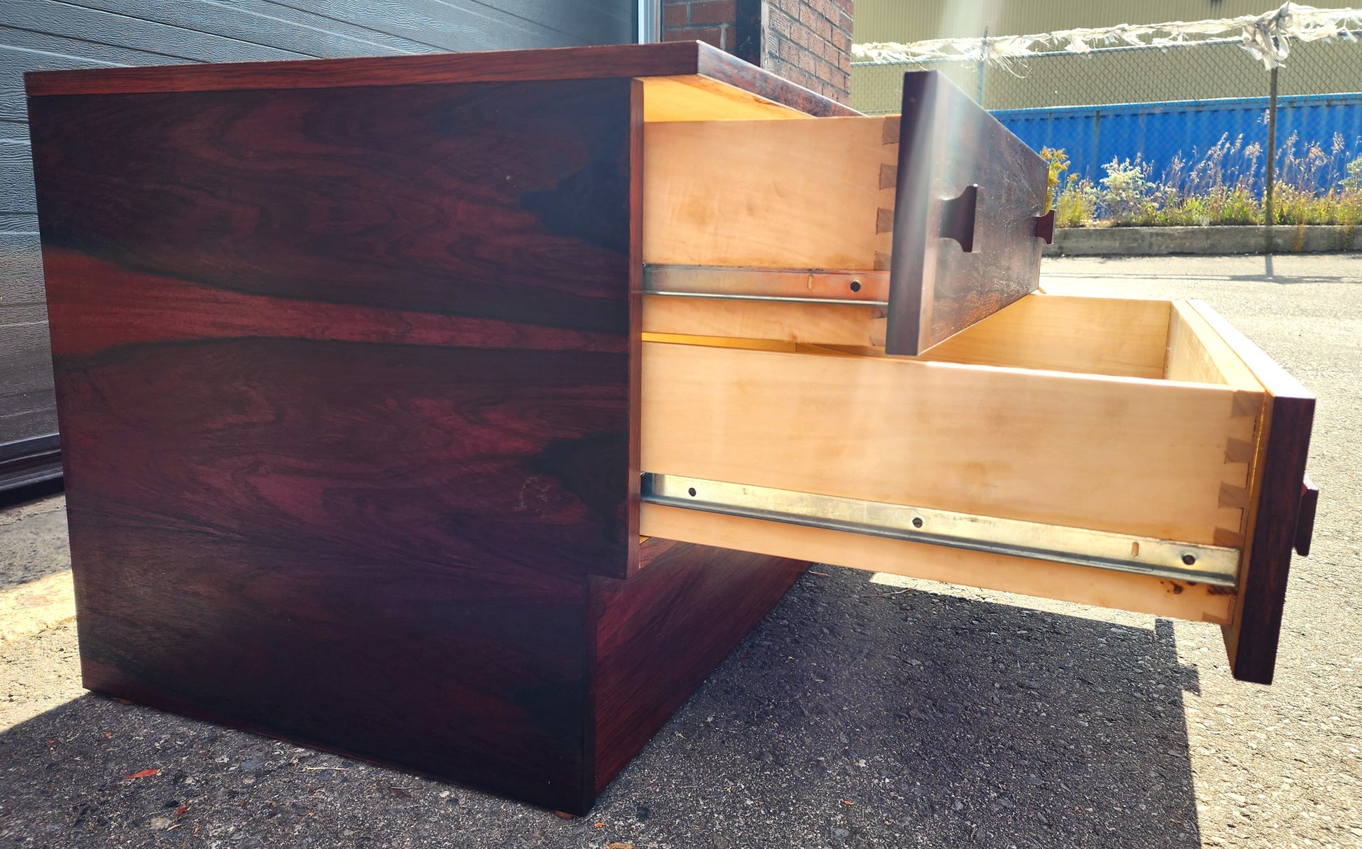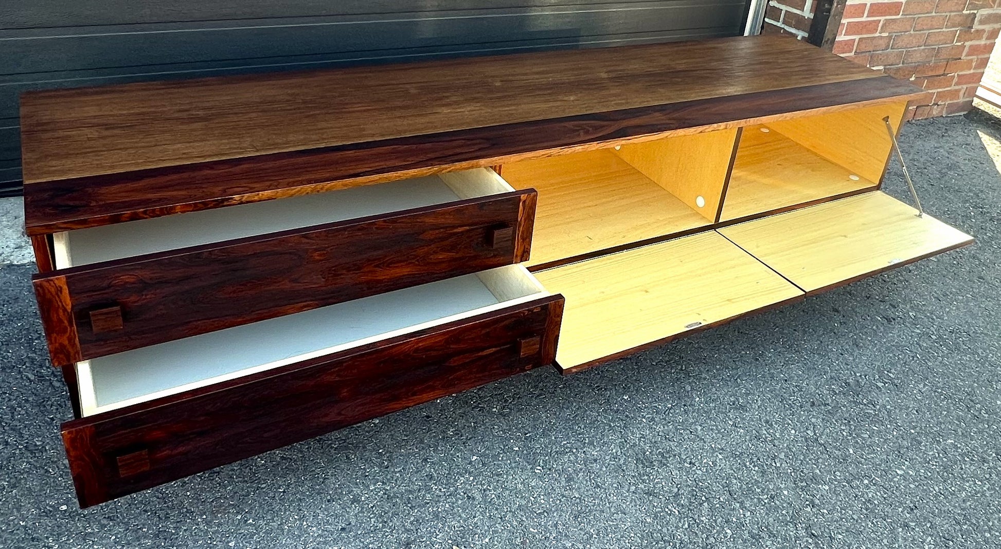 For sale, we have a beautifully designed & crafted long, wide, and low Danish Mid Century Modern rosewood cabinet with 2 cupboards with drop-down doors and a bank of 2 large dovetailed rosewood drawers. The second photo shows its coloring the best; it is how it will look in your room.