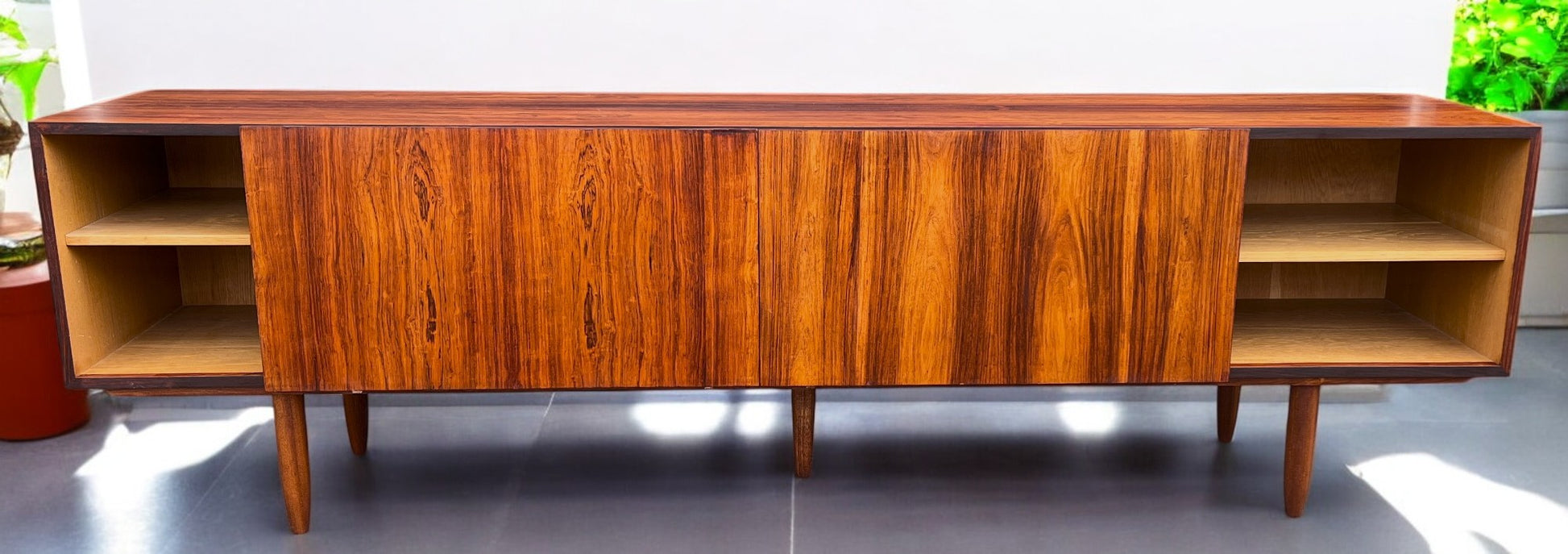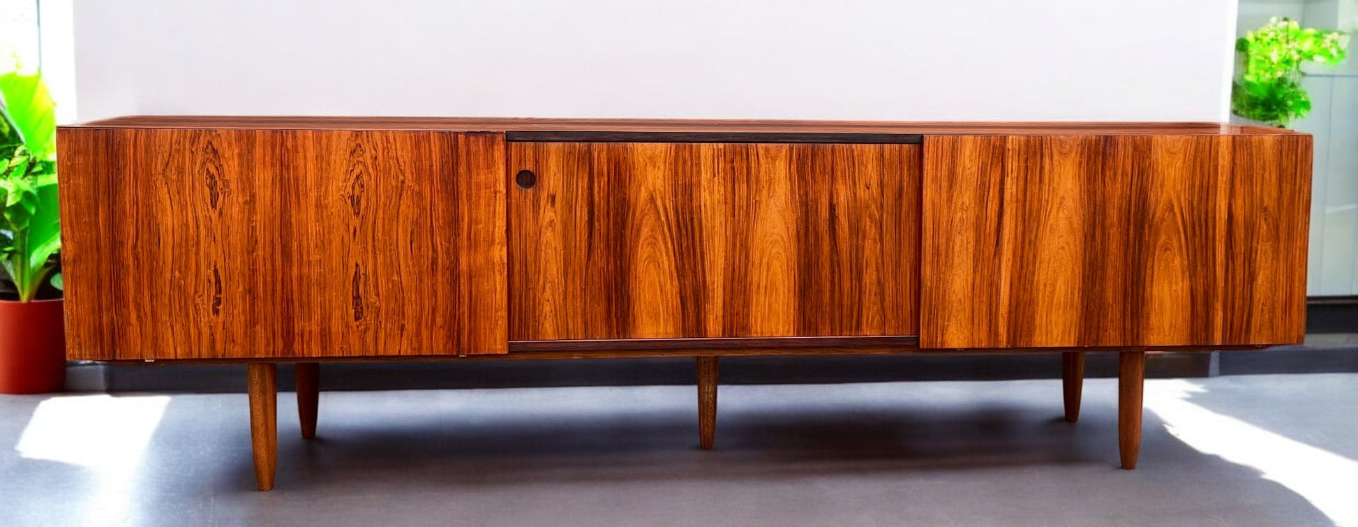 For sale, we have a long, wide, and low Danish Mid Century Modern rosewood console with 3 sliding doors standing on 5 tapered legs. There are 3 compartments behind the sliding doors; two have removable shelves, and the middle one has 2 shallow drawers.
