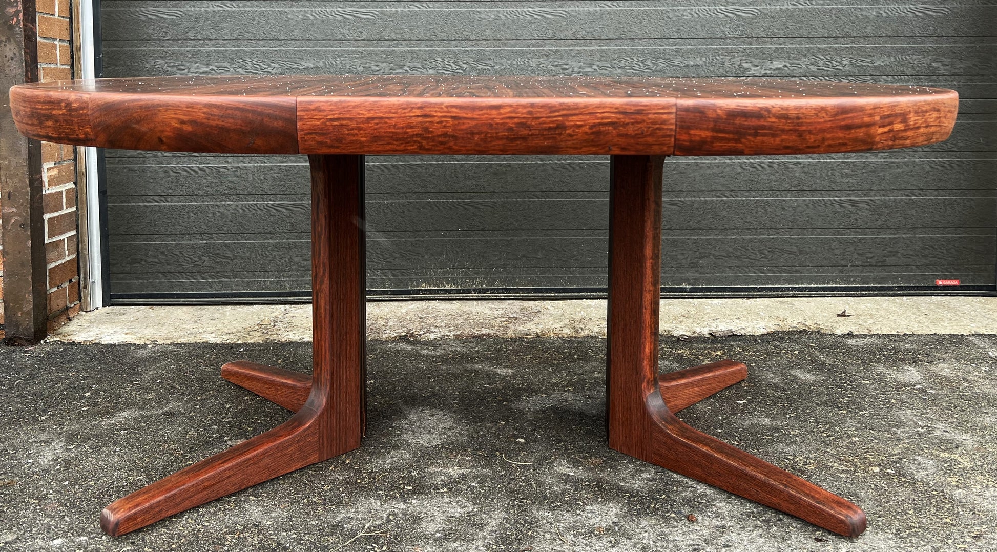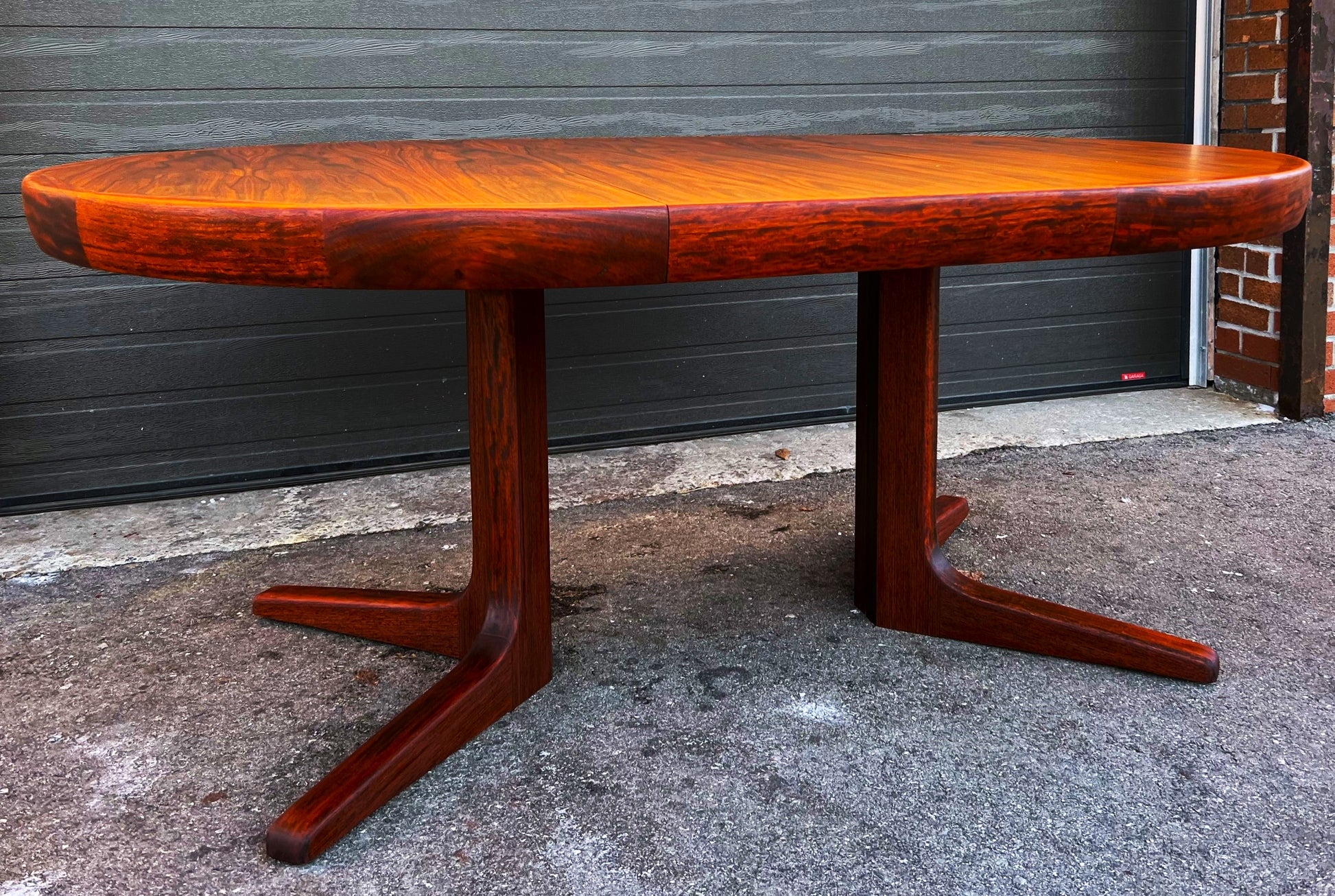 This splendid Danish Mid Century Modern split pedestal rosewood dining table with 1 extension leaf has been completely stripped, sanded, and refinished with Danish oil to great condition. A few tiny blemishes (repair spots) might be visible on very close inspection ( zoom in on the close-up photo). Please note, the table looks much nicer in person, the color is much deeper and vibrant and redder.