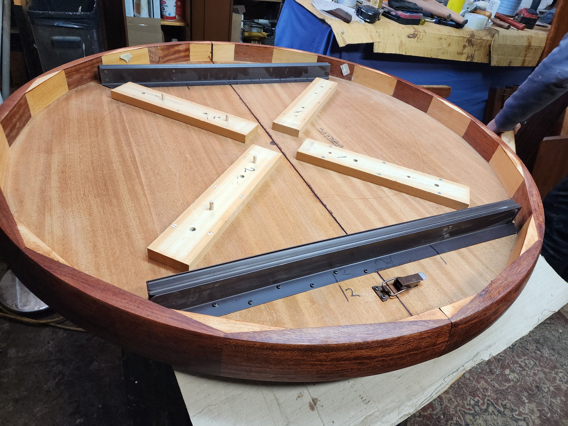 Especially strong and sturdy, it features beautiful rosewood grain and sculptural edges and pedestal legs for comfortable seating. The locks keep the leaf in place.