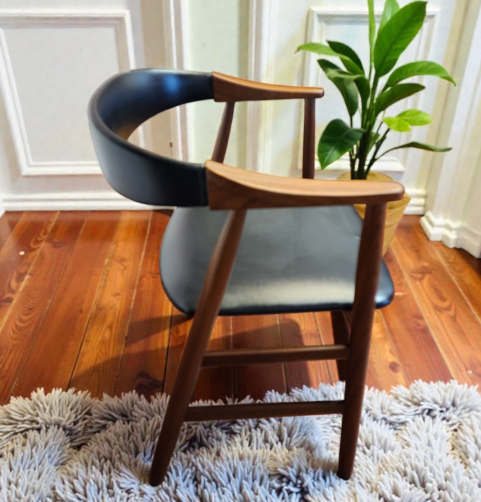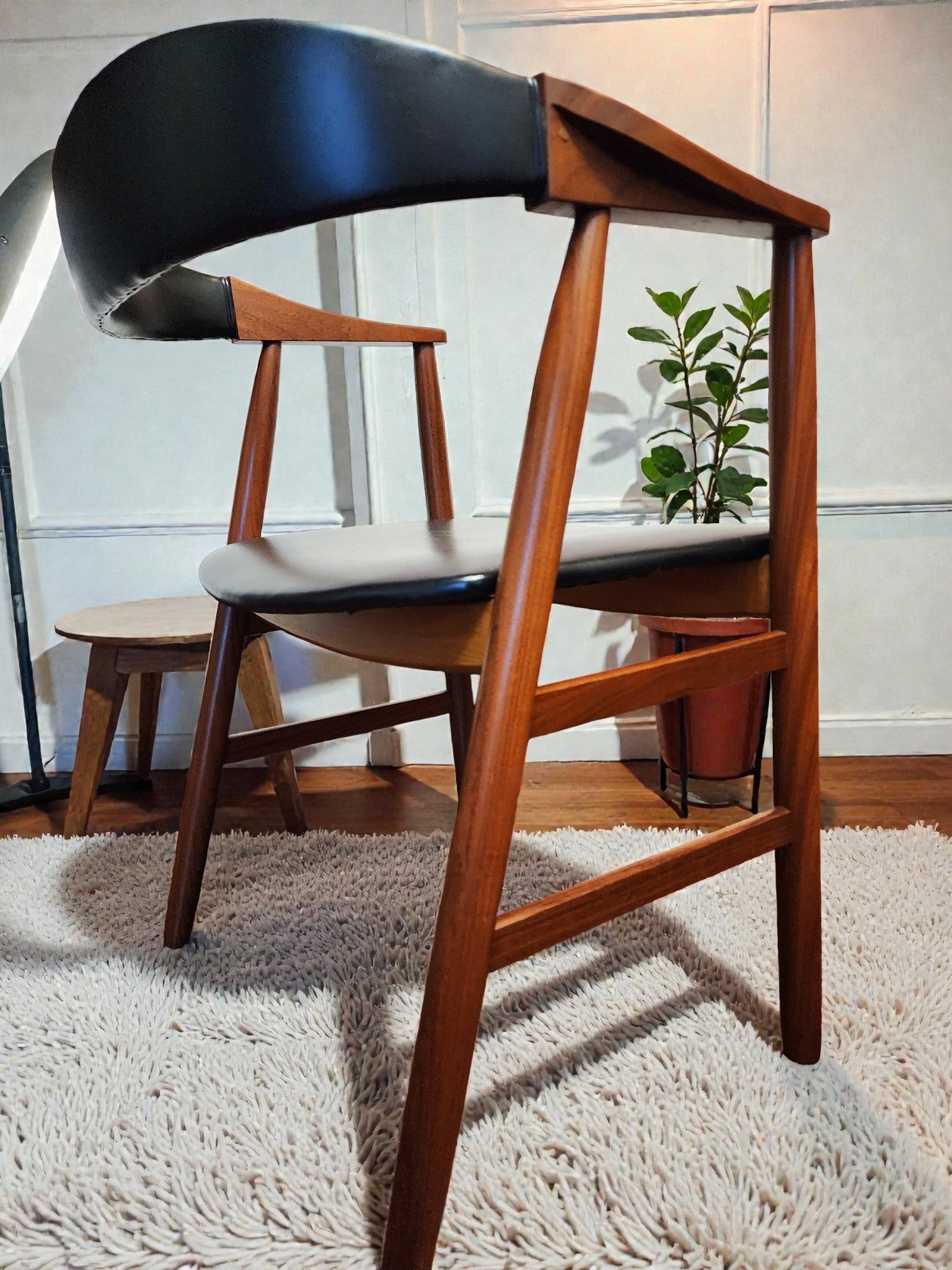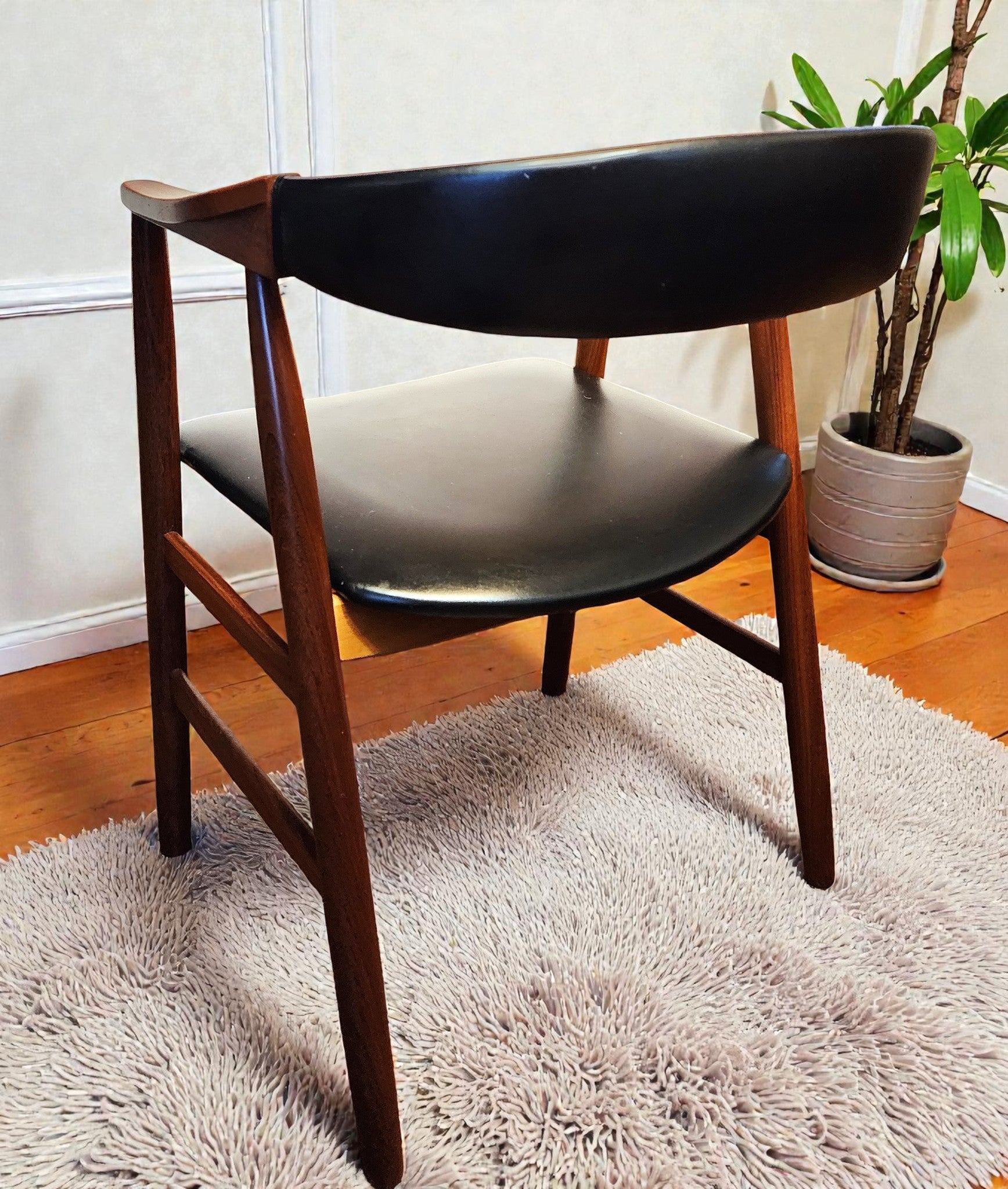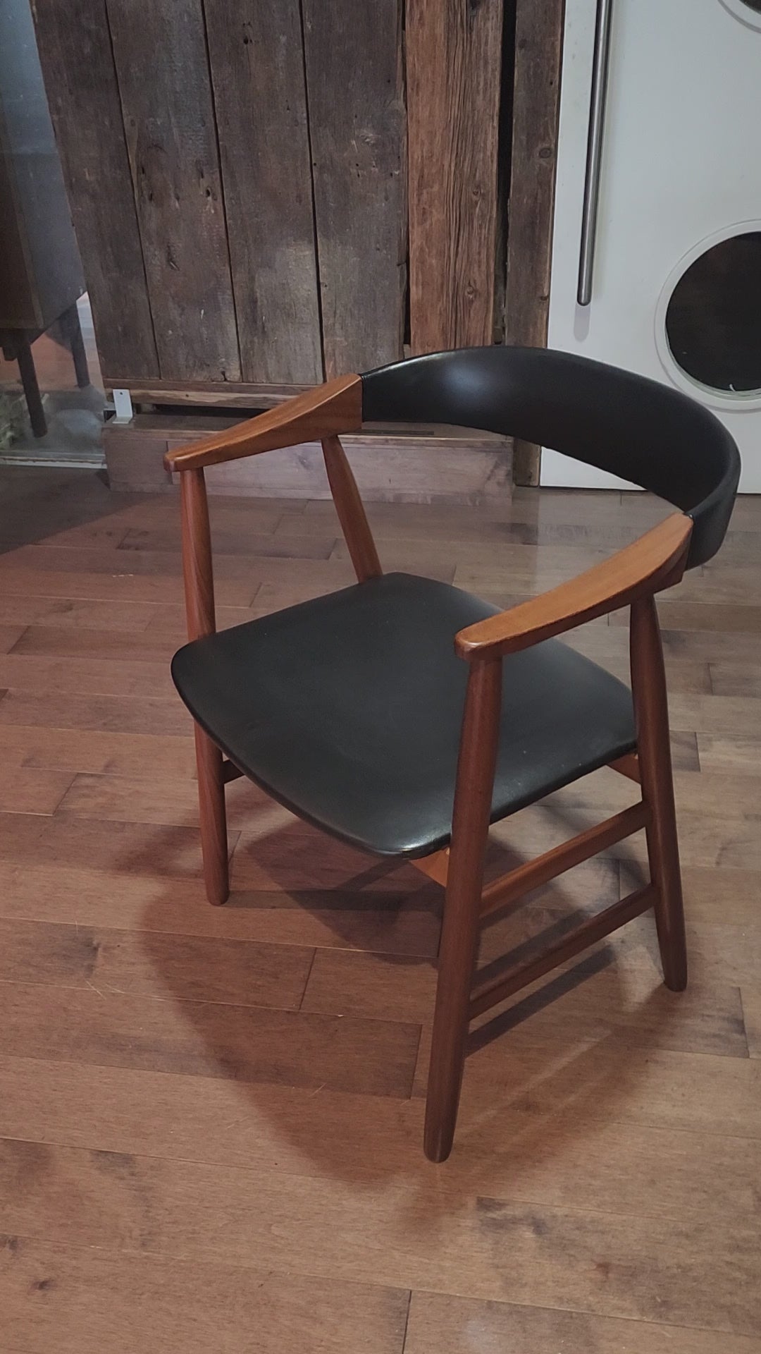 We stripped, sanded, and refinished the wooden frame with Danish oil, and the original black leather-like upholstery is in good shape.