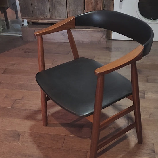 For sale, we have this exquisite vintage Danish Mid Century Modern teak dining armchair by Thomas Harlev. This beautiful, streamlined vintage chair features gleaming, solid teak frame, deeply curved back support, and uniquely formed armrests.