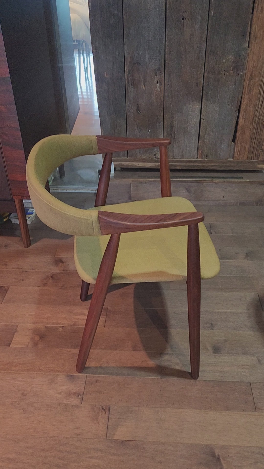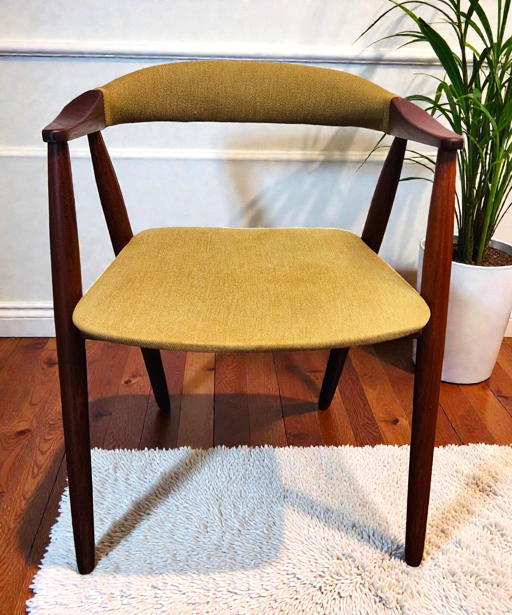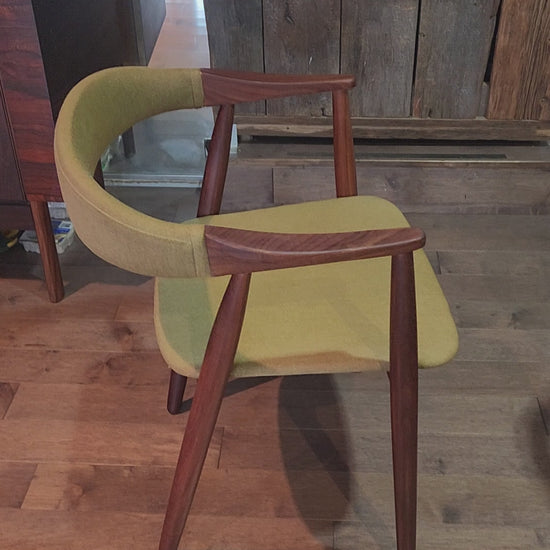 For sale, we have this exquisite vintage Danish Mid Century Modern teak dining armchair by Thomas Harlev. This beautiful, streamlined vintage chair features gleaming, solid afromosia frame, deeply curved back support, and uniquely formed armrests.
