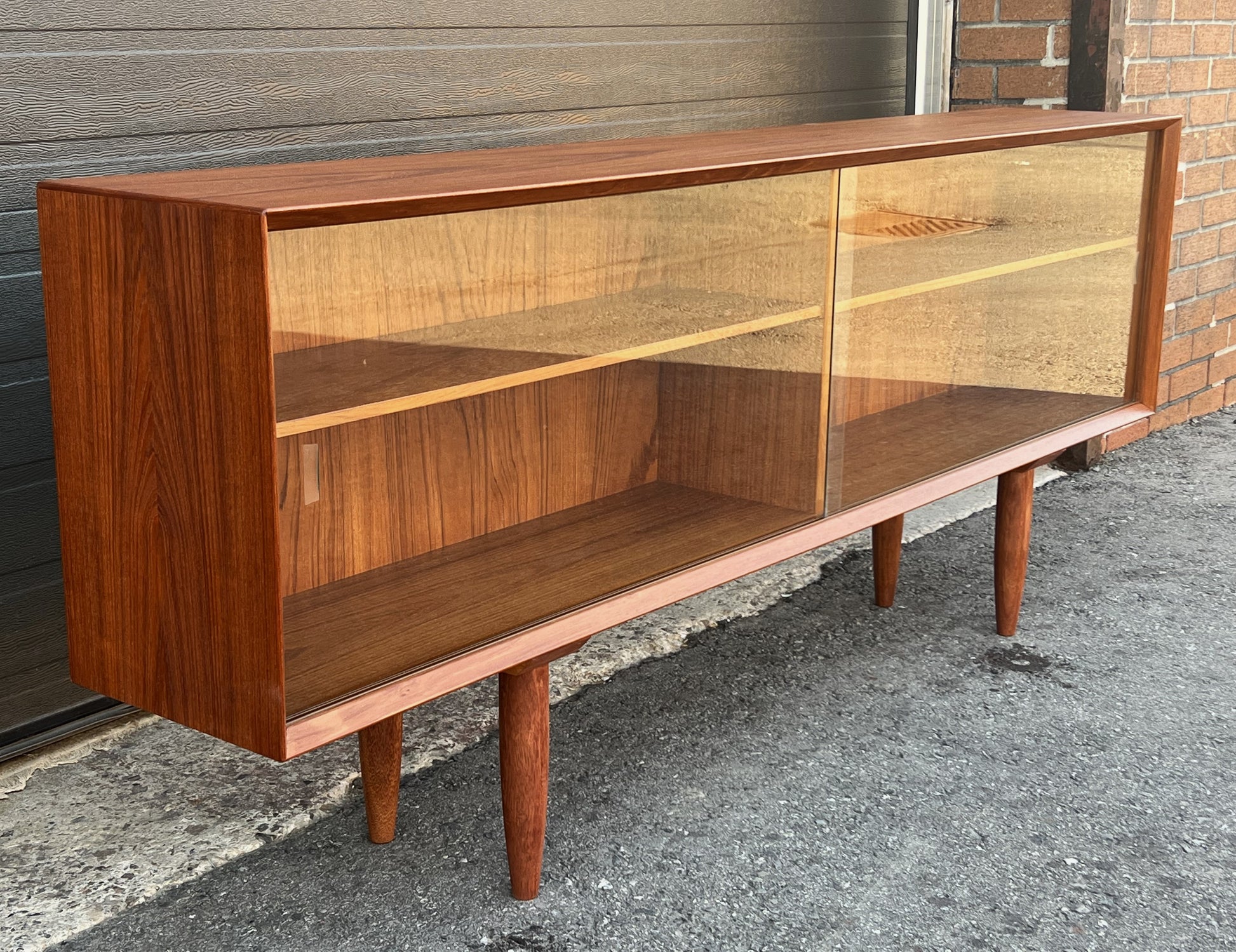 For sale, we have this sleek vintage Danish Mid Century Modern teak bookcase/display or media console with sliding glass doors. It has been stripped, sanded, and refinished to great like-new condition.