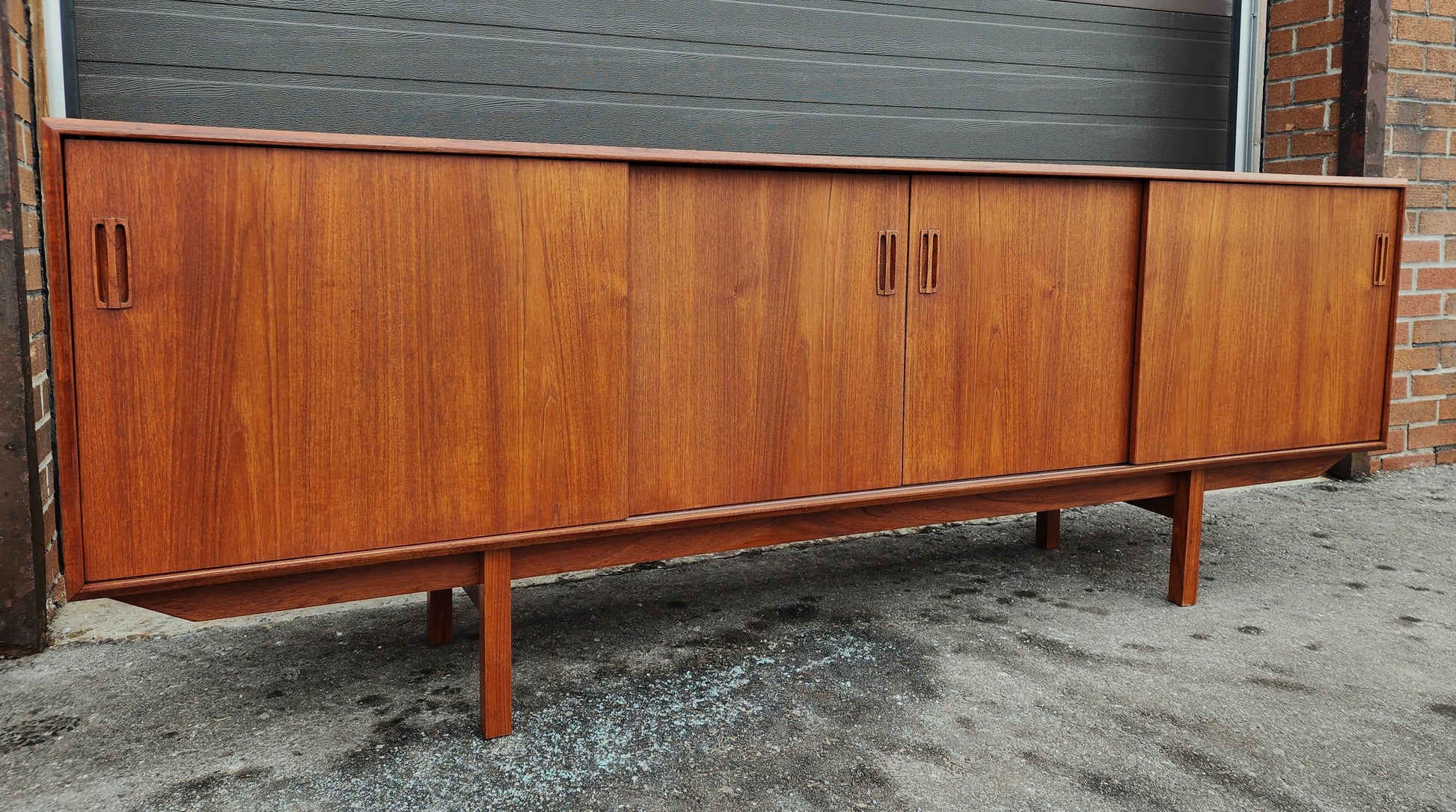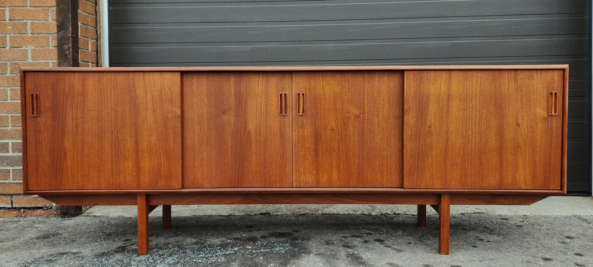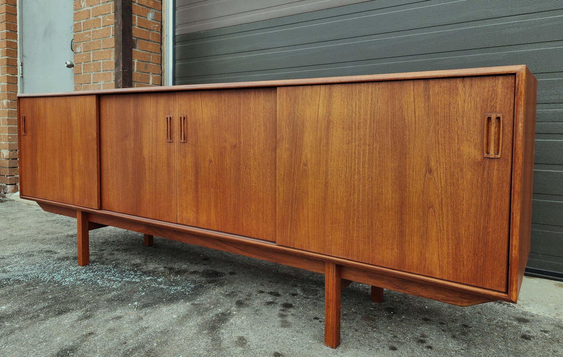 Impressive vintage Danish Mid Century Modern teak sideboard/credenza has been completely stripped, sanded, and refinished with Danish oil to like new condition.