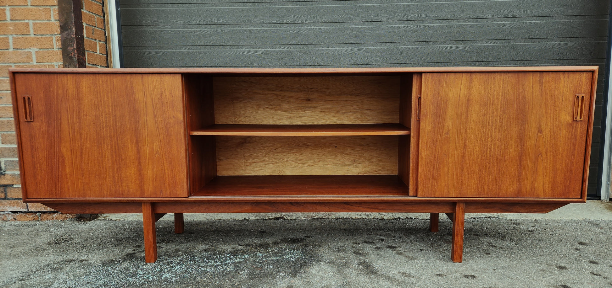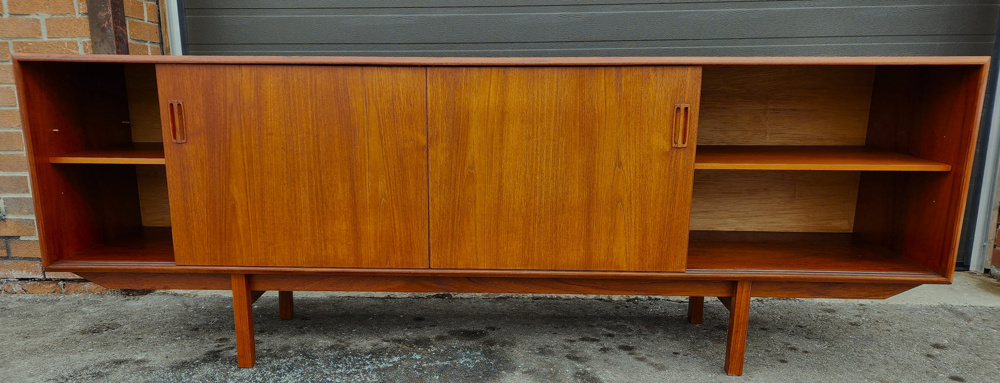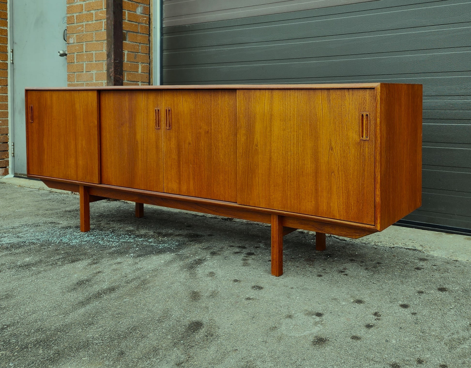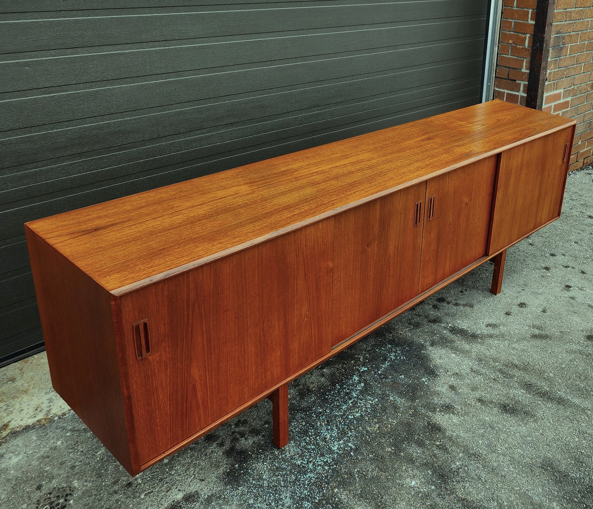 Impressive vintage Danish Mid Century Modern teak sideboard/credenza has been completely stripped, sanded, and refinished with Danish oil to like new condition.