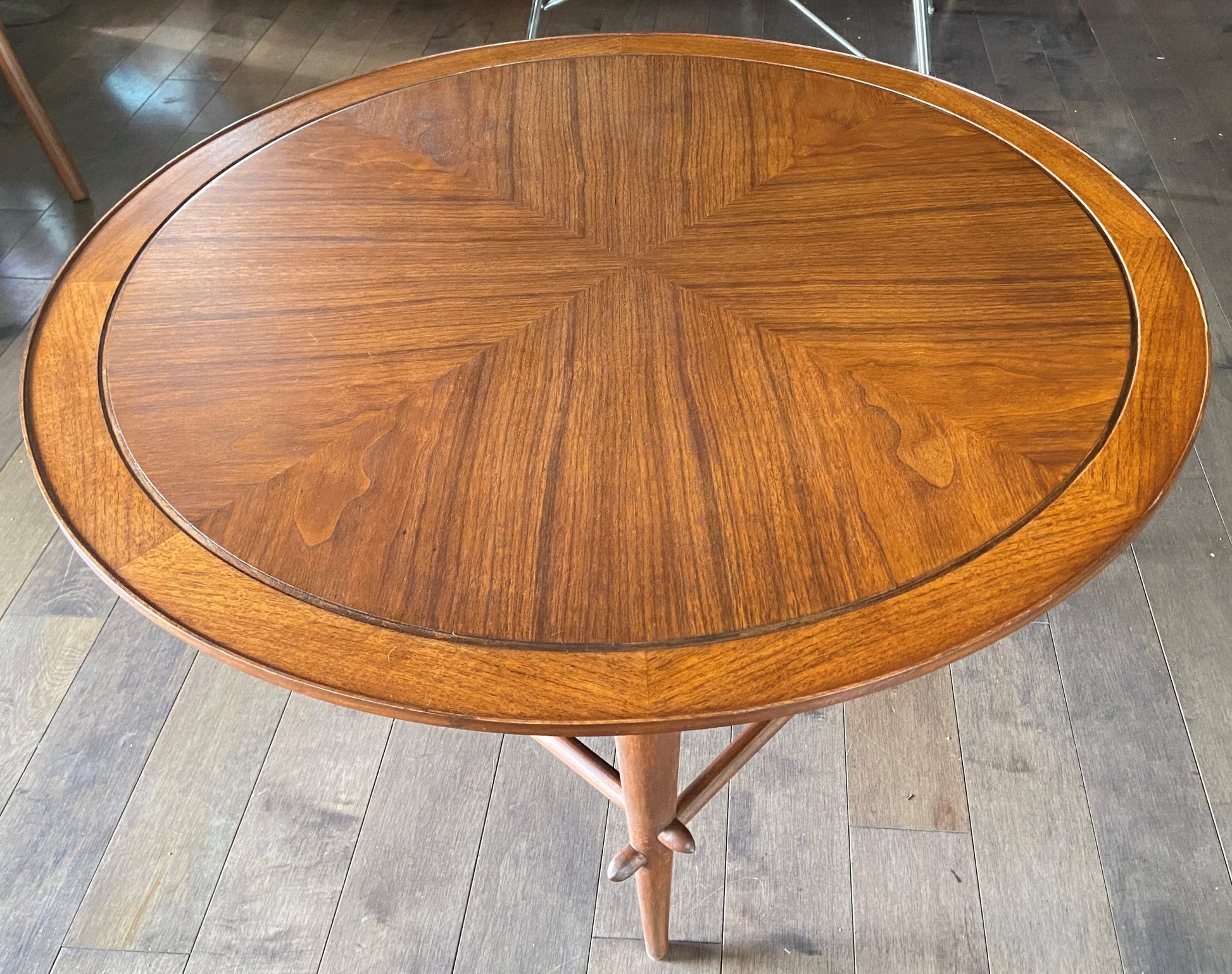 A true mid-century modern gem, this beautiful walnut coffee table by Lane Furniture is stylish and sleek. This round coffee table was designed for the Copenhagen collection and features decorative patterned table top and beautiful walnut grain. It rests atop tapered legs supported by tapered stretchers. The piece is marked Lane to the underside along with “Style No. 863” and “Serial No. 833056”