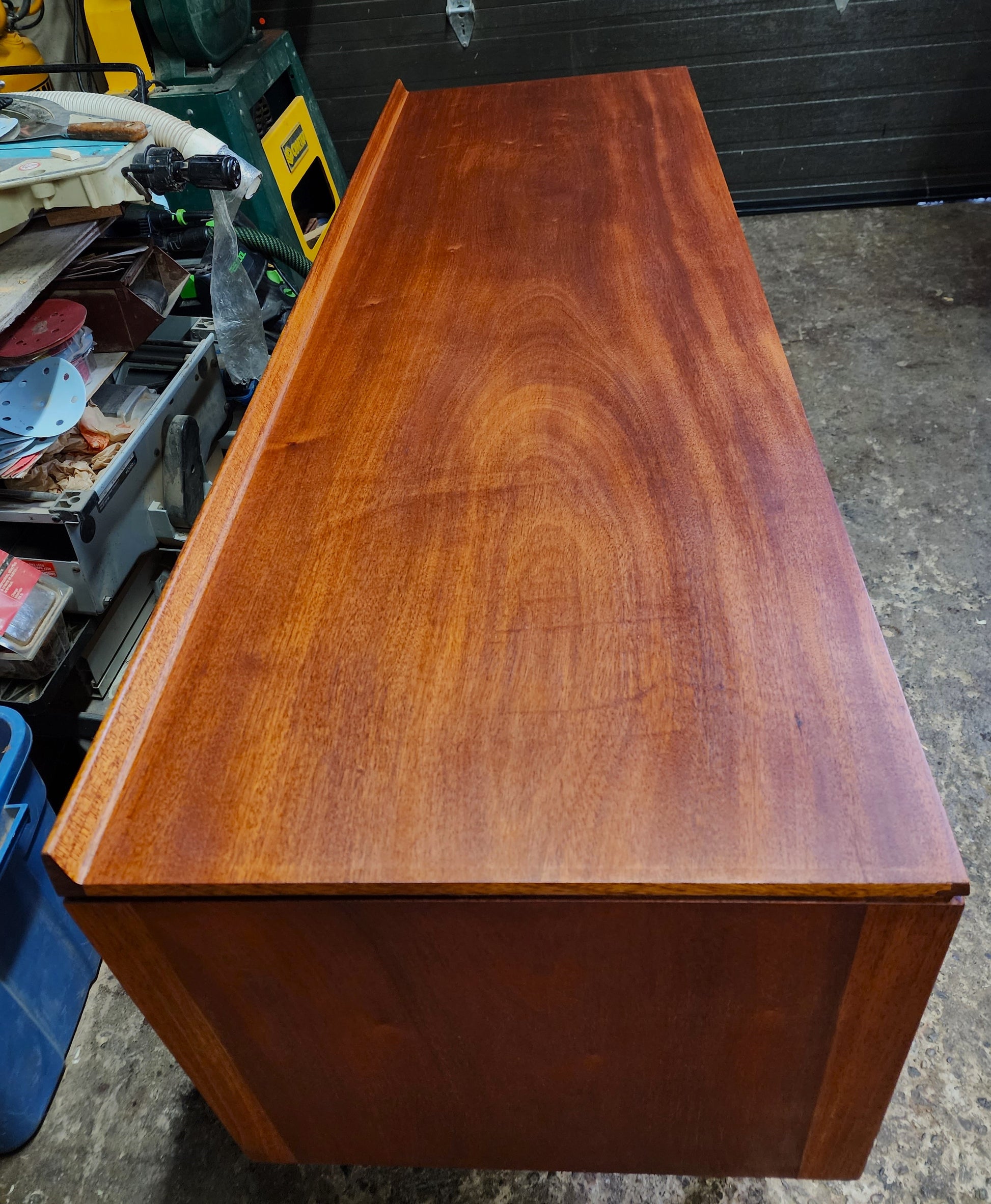 The sideboard has been stripped, sanded and refinished with Danish oil to almost like new condition with just a few minor blemishes on top.