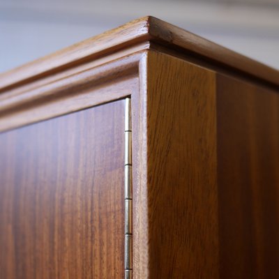 There are 2 large compartments behind hinged teak doors (each has an adjustable shelf) and a middle bank of clean wooden drawers that slide easily.