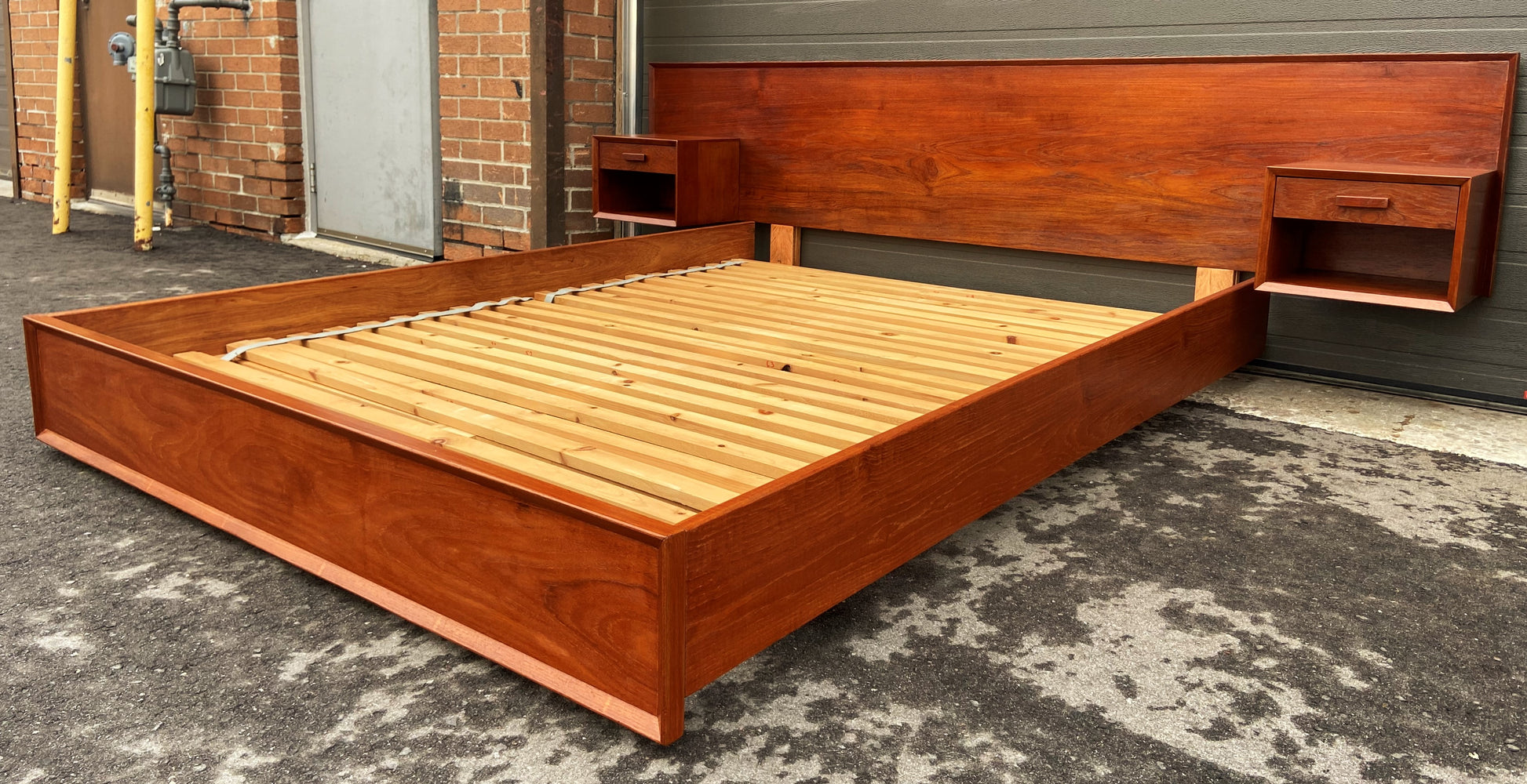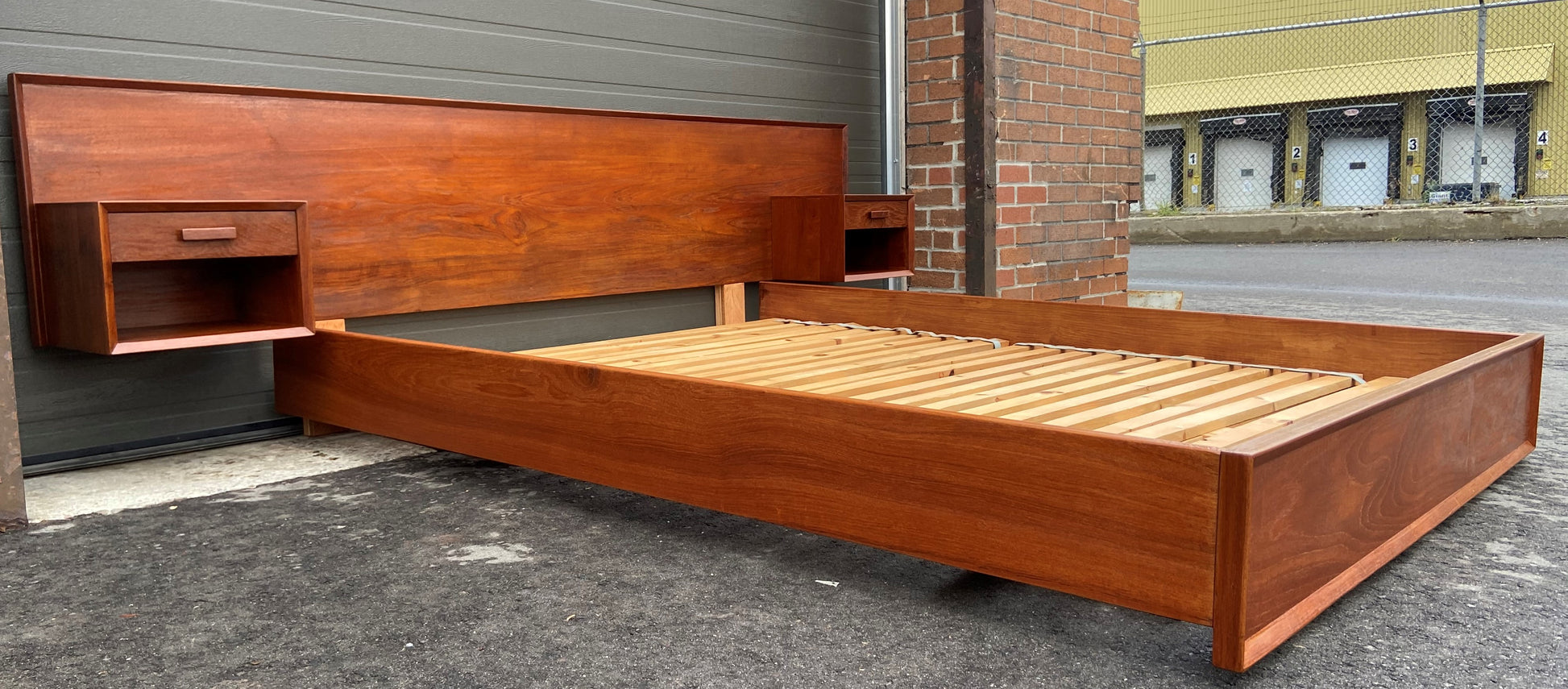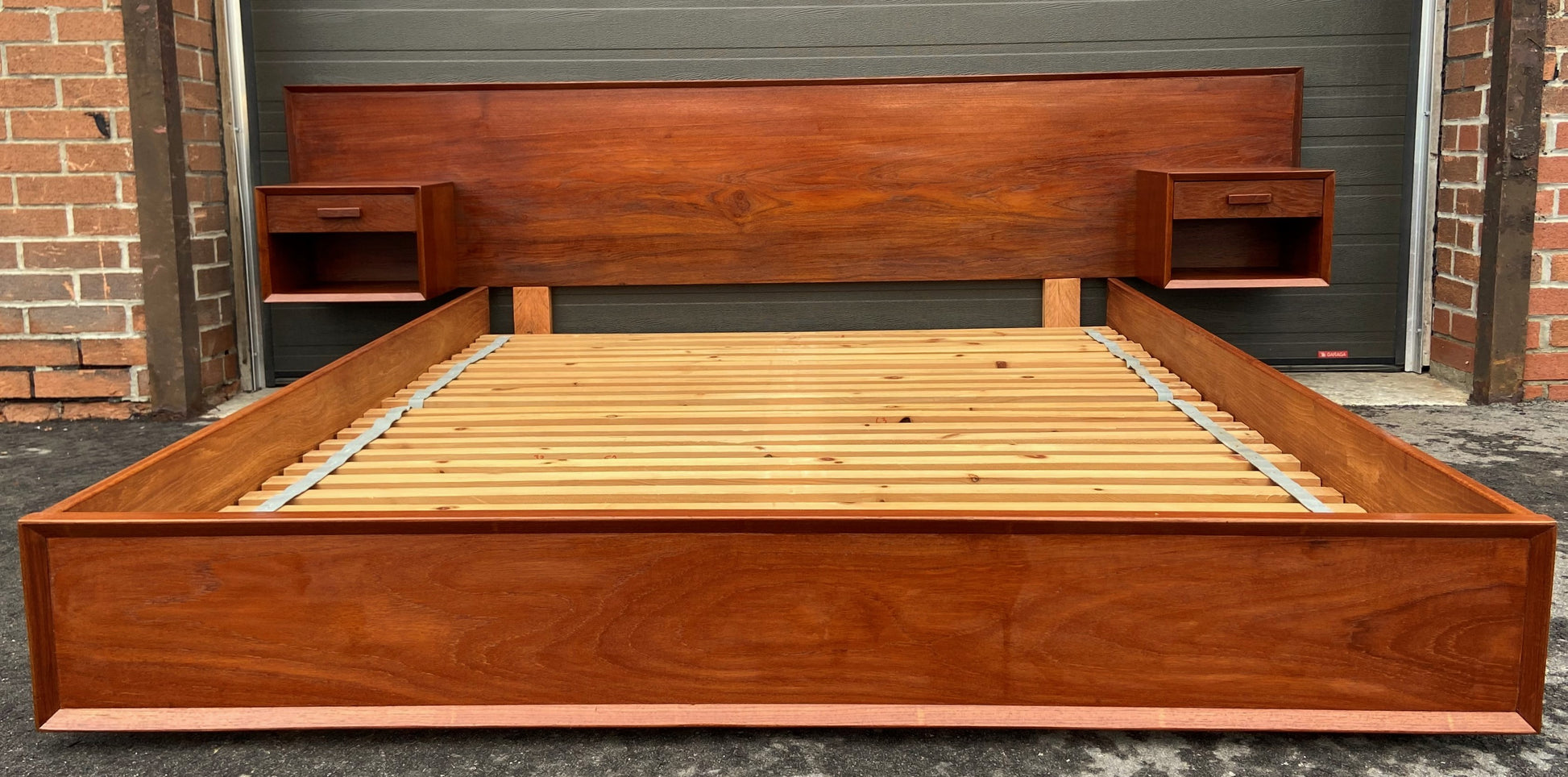REFINISHED MCM SOLID Teak Platform Bed w floating nightstands Queen, PERFECT