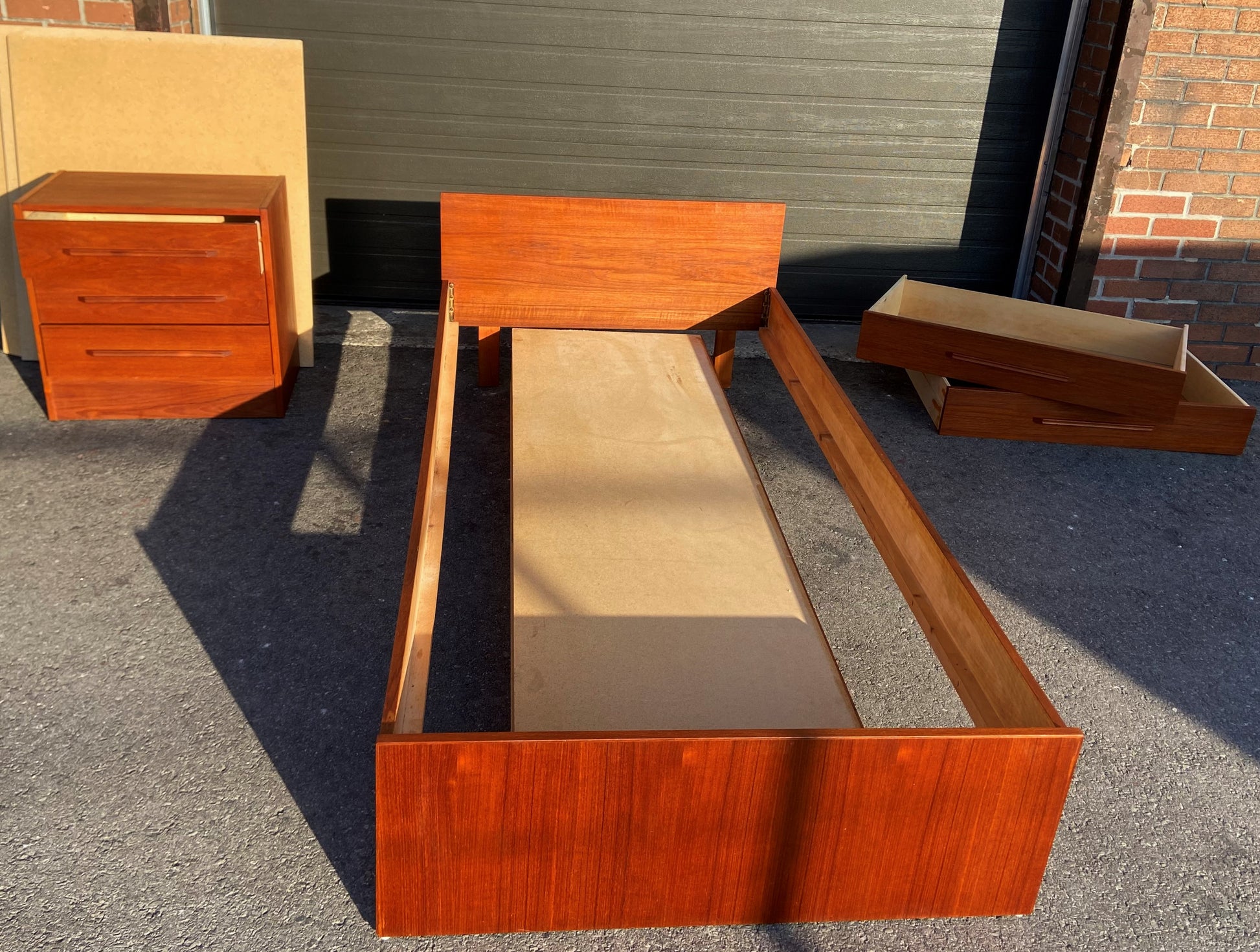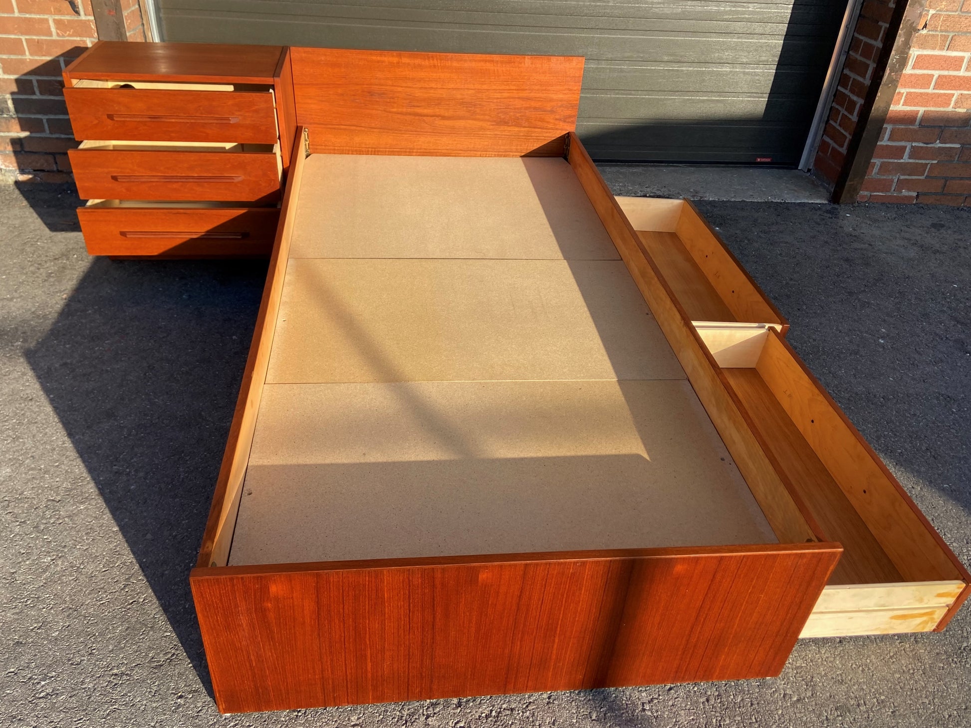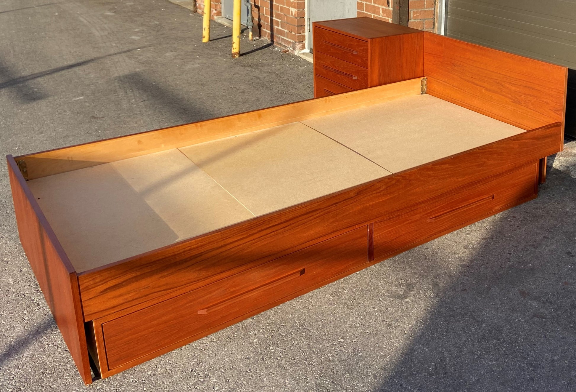 Lovely vintage Mid-Century Modern teak single/ twin platform bed with two storage drawers and a nightstand. All components have been stripped, sanded, and refinished to almost new condition.