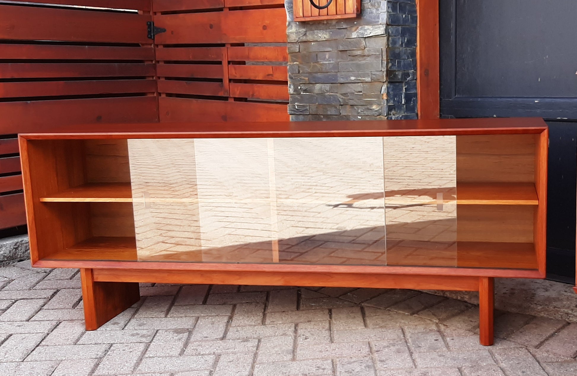 This versatile vintage Mid Century Modern cabinet with 2 sliding glass doors has been stripped, sanded, and refinished with Danish oil to perfect like-new condition.