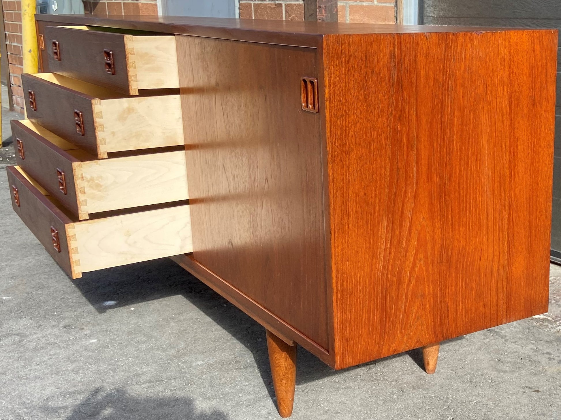 Plenty of space for your dinnerware or media devices in two compartments behind sliding teak doors (adjustable/ removable shelves inside) and in the bank of dovetailed wooden drawers that slide easily.