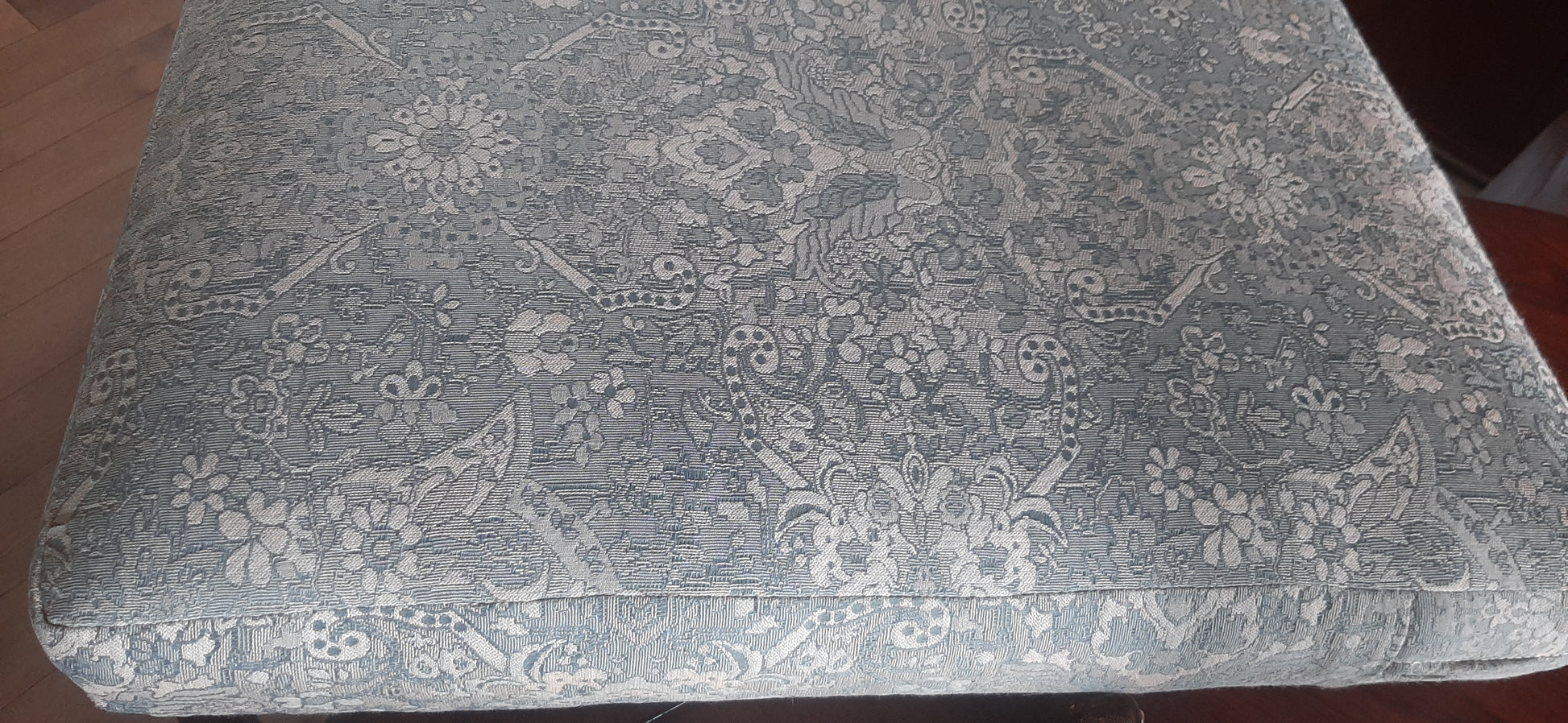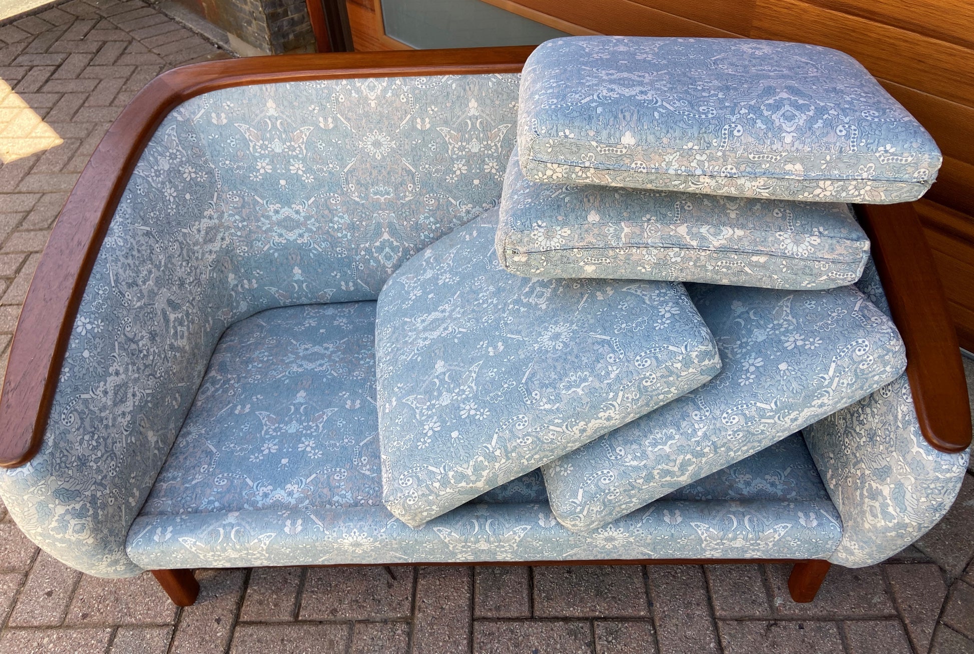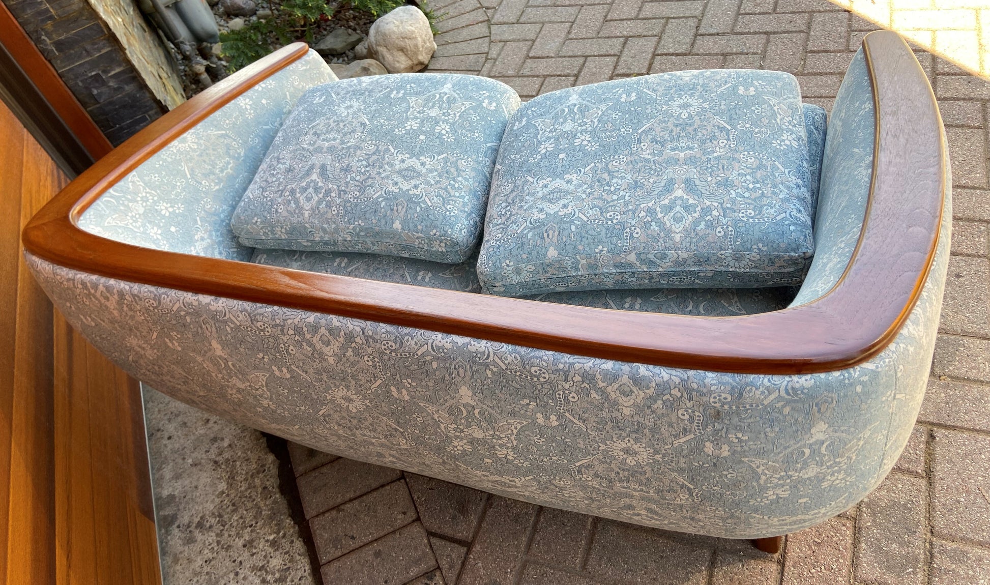Designed to be placed in the center of an open concept home, the back is as beautiful as the front. The sofa is very comfortable and built to last another lifetime; newer woven pale blue upholstery is clean and in perfect condition; cushions are are medium firm.