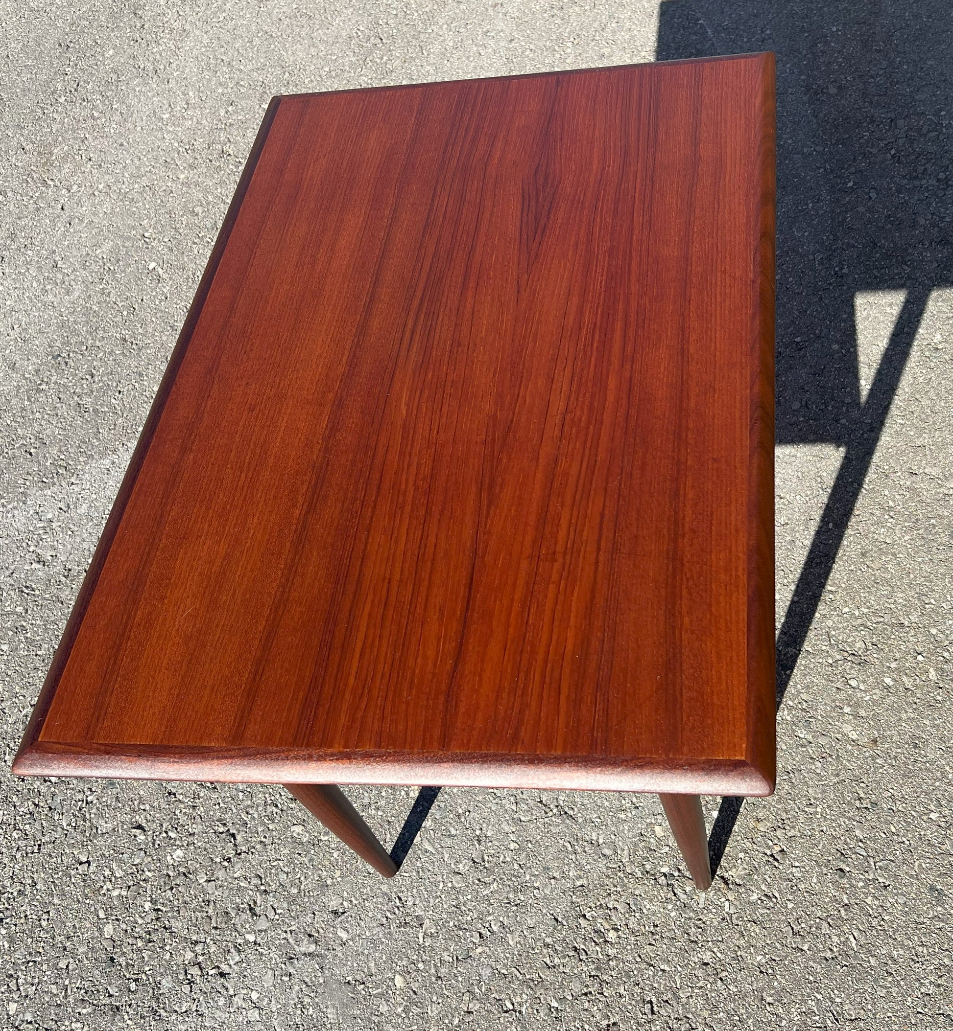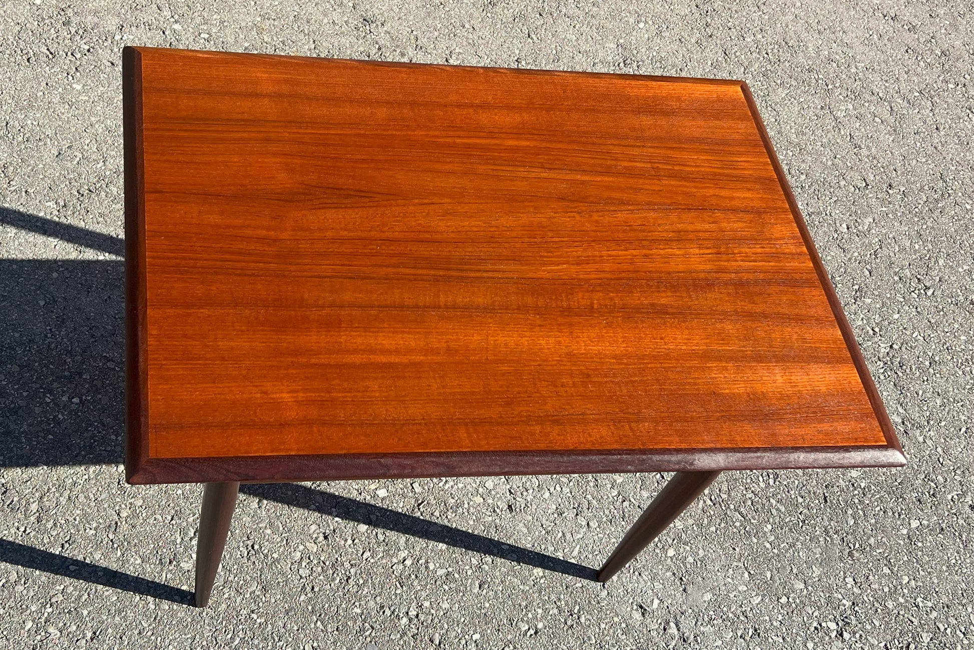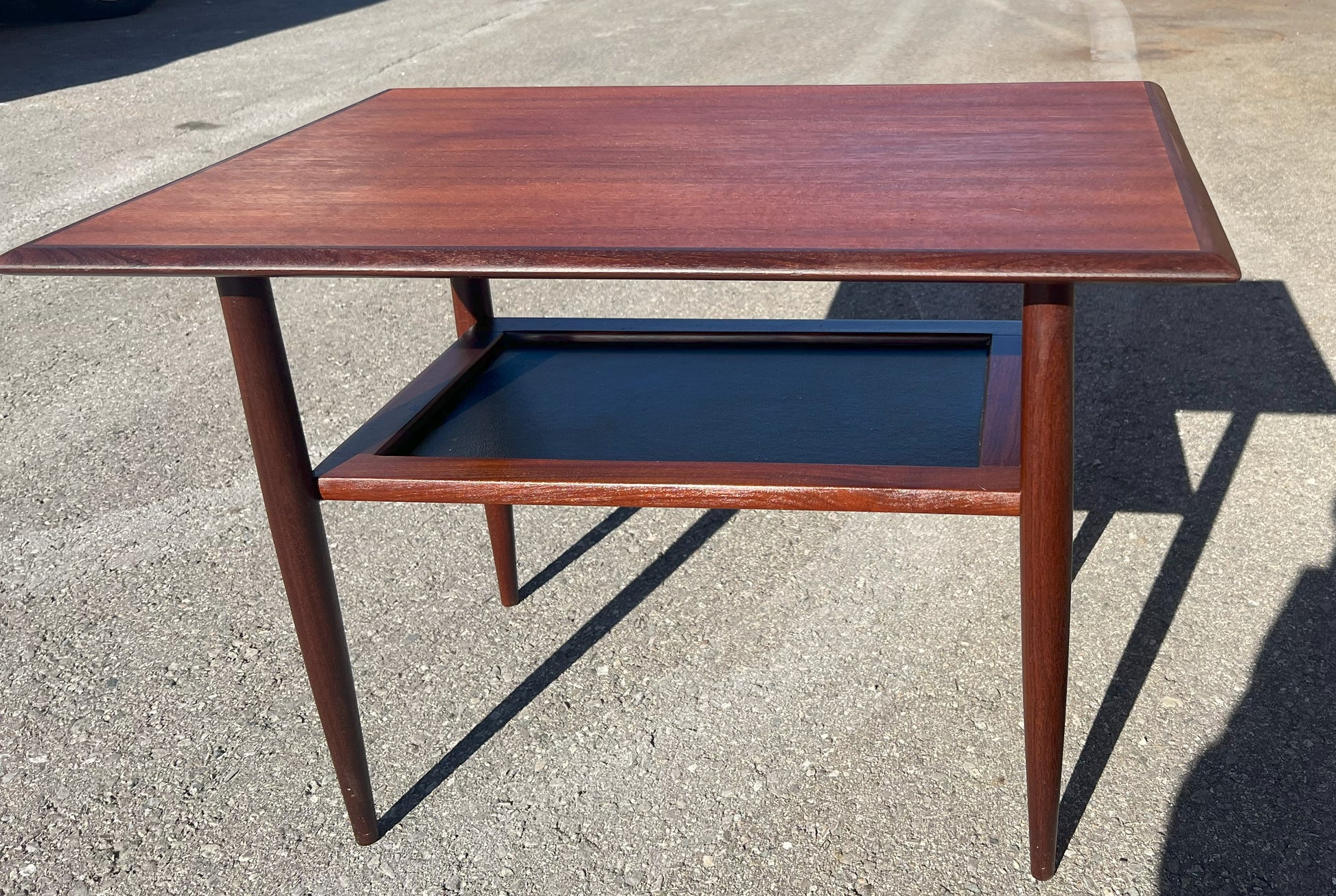 Fos sale. we have an elegant vintage Mid-Century Modern side/ end table by RS Associates, made of beautiful teak wood with contrasting darker edges, a "floating" shelf, and lovely tapered legs.