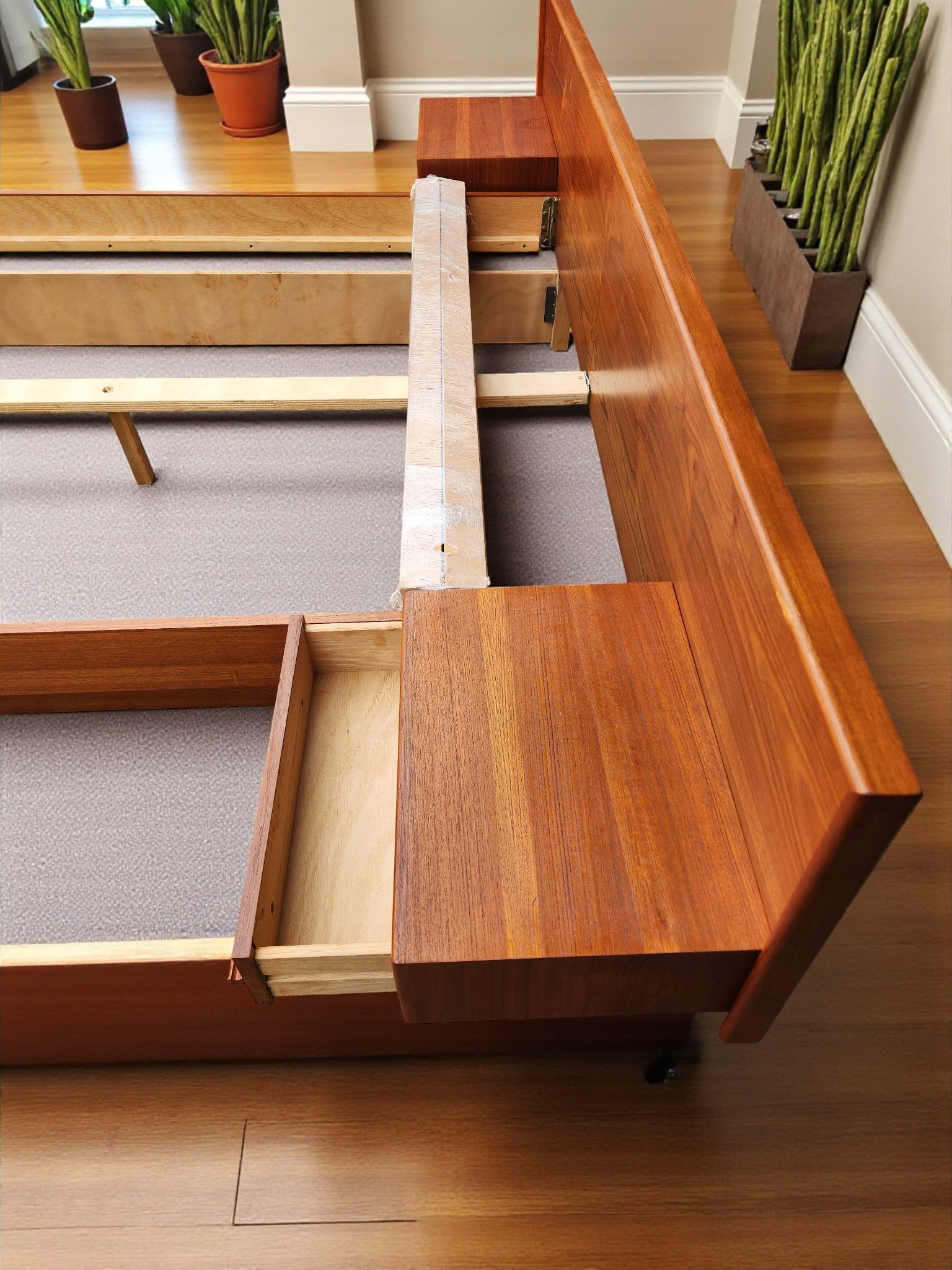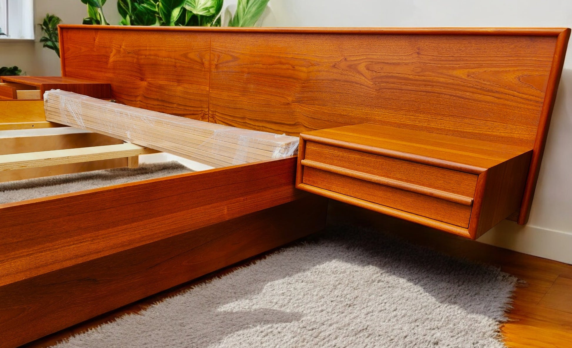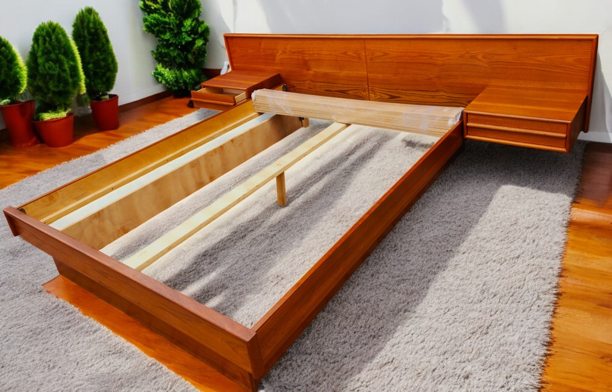 REFINISHED Mid Century Modern Teak Bed w Floating Nightstands Queen