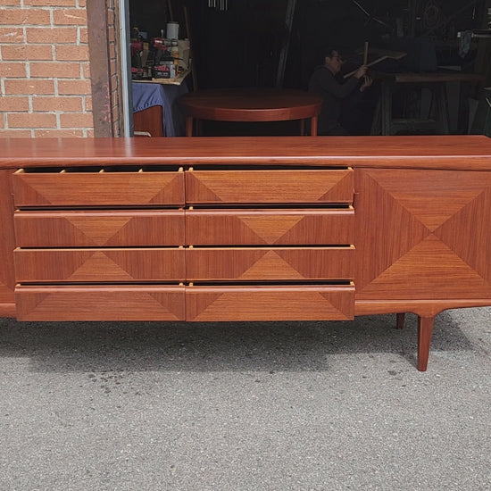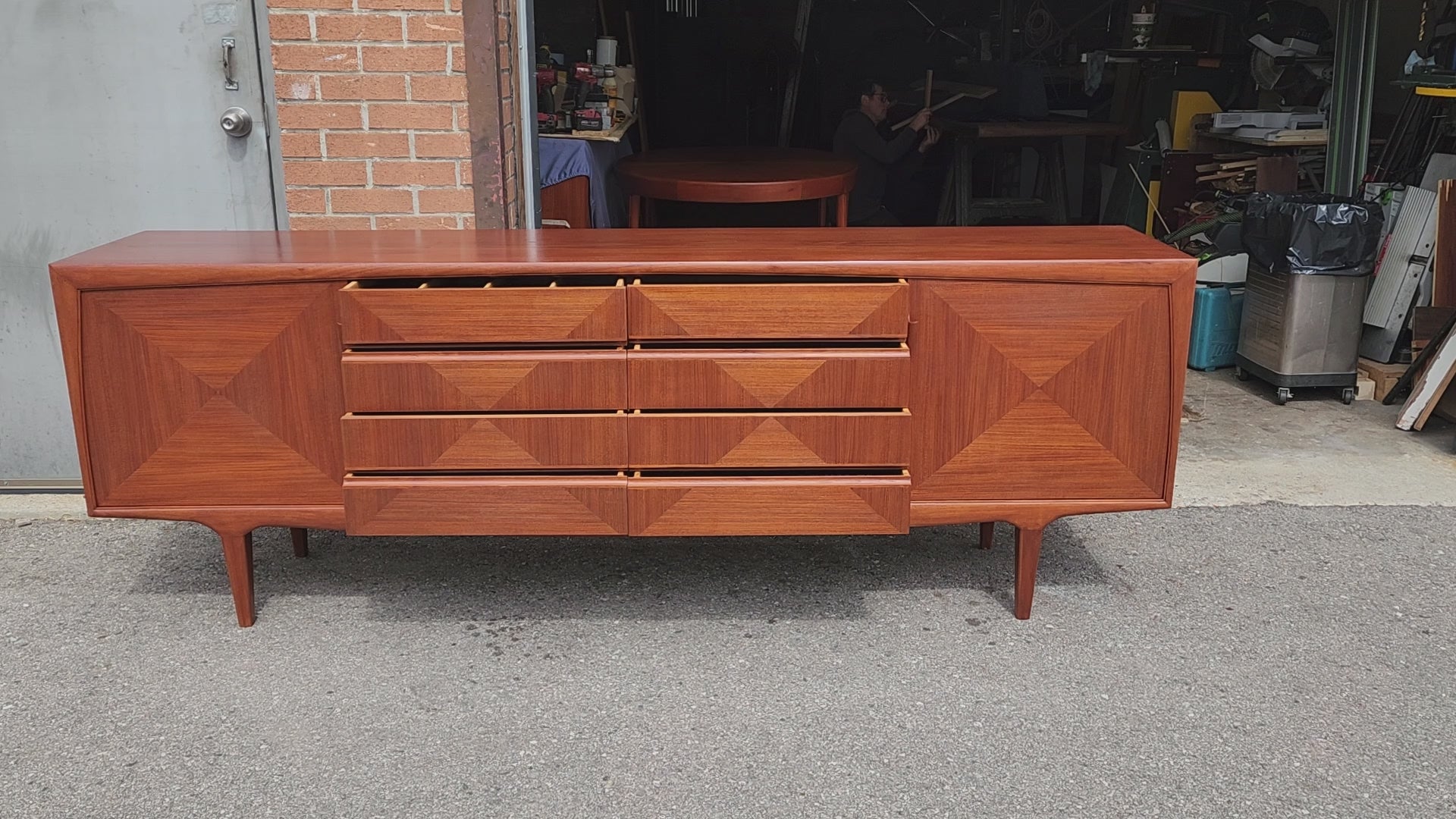 REFINISHED Mid Century Modern Teak Buffet w Geometrical Inlays & Lighting, 94"