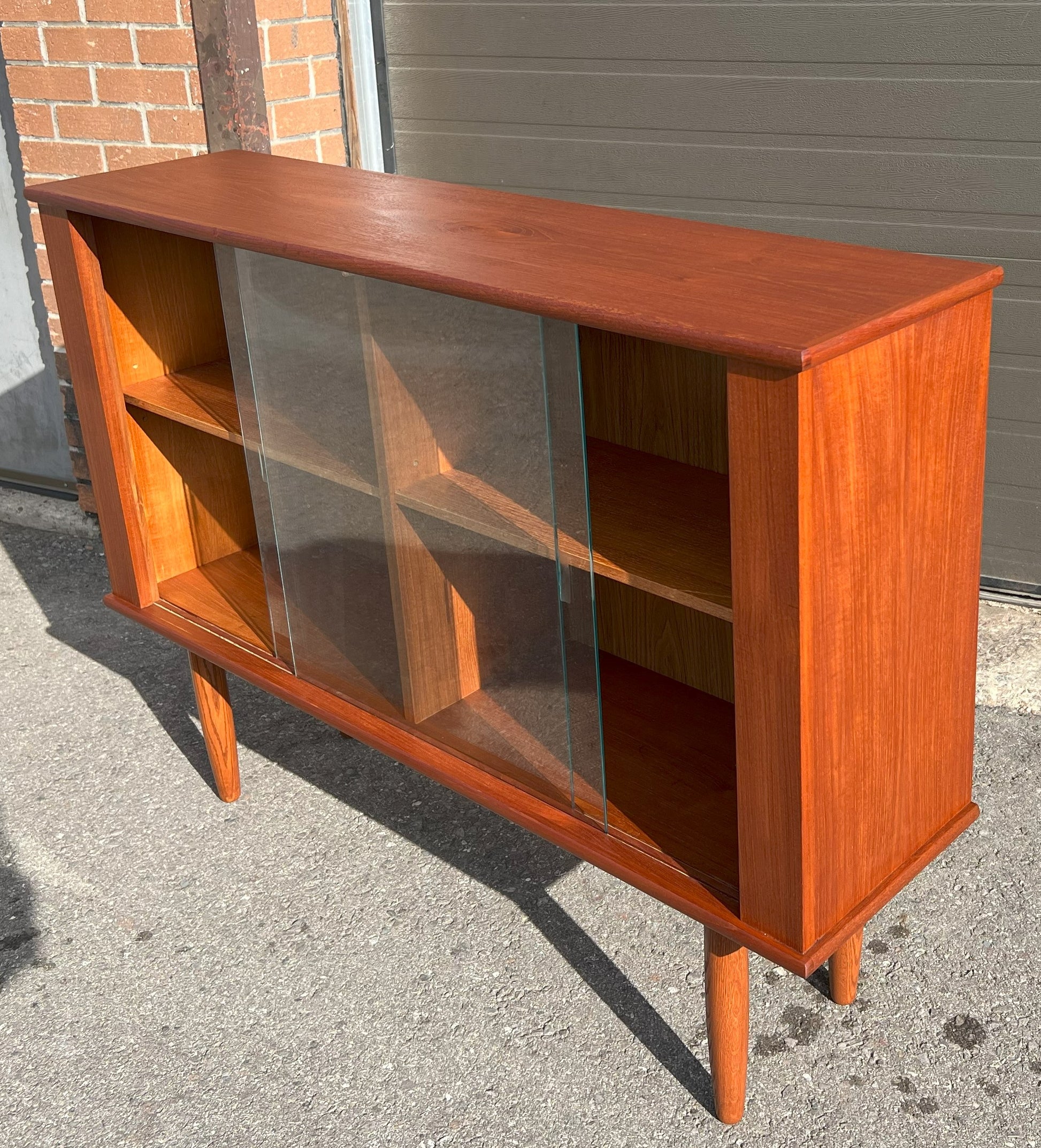 For sale, we have this sleek vintage Mid Century Modern teak bookcase/display with sliding glass doors. It has been stripped, sanded, and refinished to perfect like-new condition.