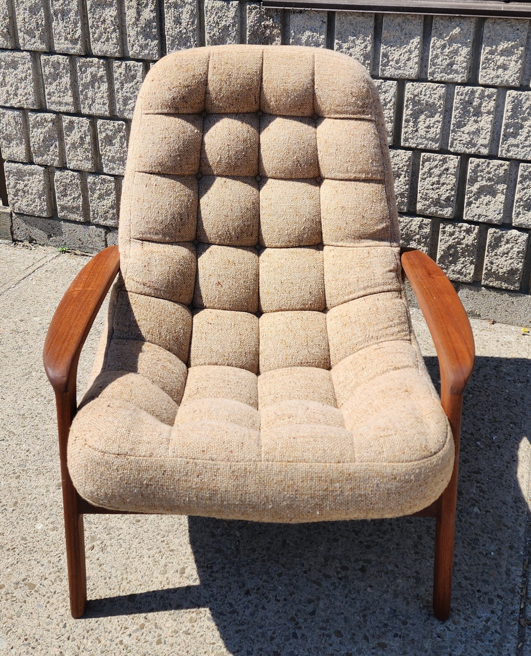 For sale, we have an iconic Mid-Century Modern teak lounge chair known as Scoop, designed by a Danish designer and manufactured by R. Huber & Co. in the late 1960s. It is one of the most comfortable chairs we sat on.