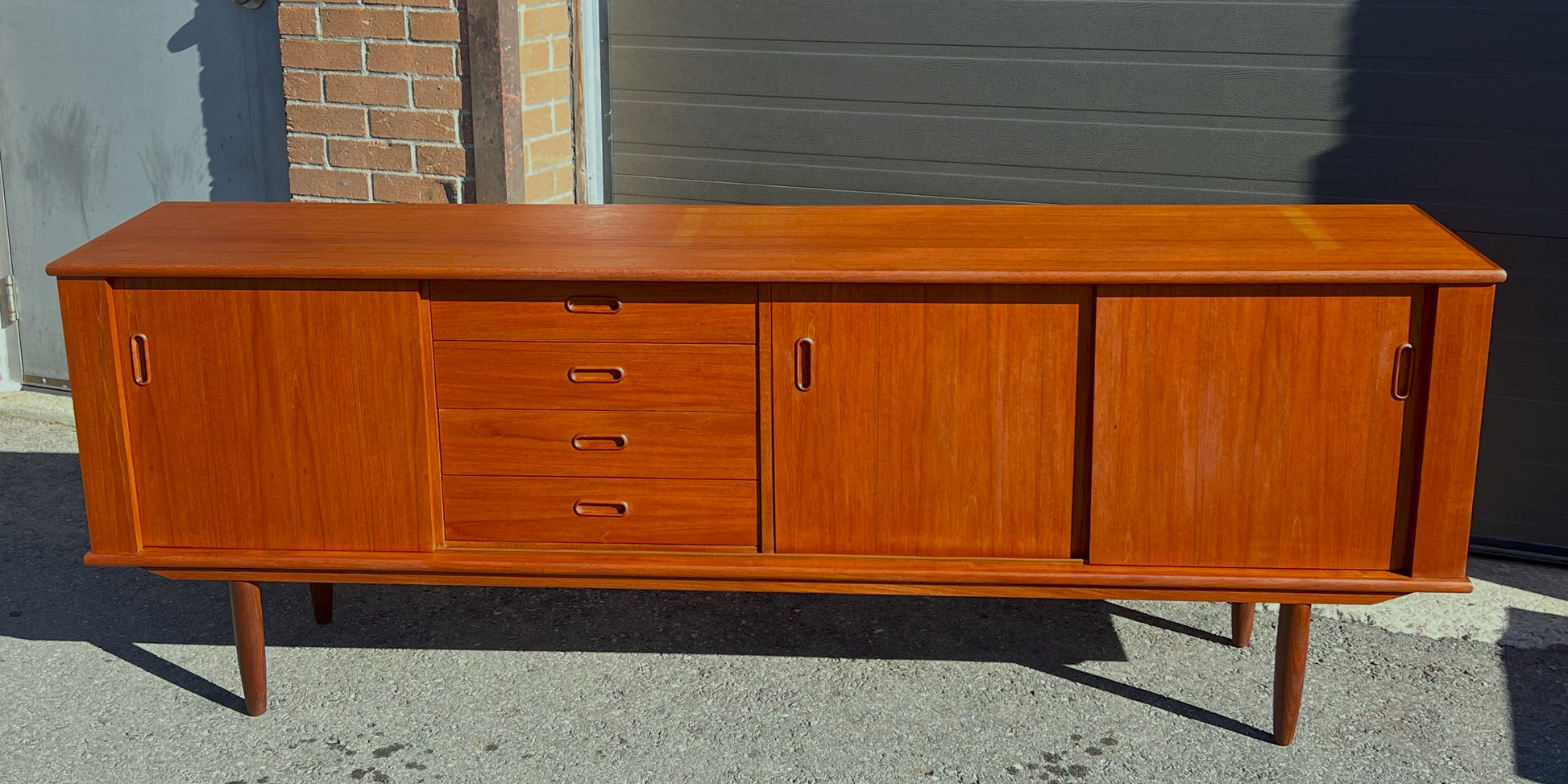For sale, we have this beautiful classic Scandinavian Mid Century Modern teak sideboard buffet TV media console. A very clean piece, both aesthetically and cosmetically, with enough visual flair to excite, but not overstimulate the eye. The credenza has been stripped, sanded, and refinished with Danish oil to like new condition with only lighter lines on the top where the hutch was standing for a long time (in time the color will get more uniform).
