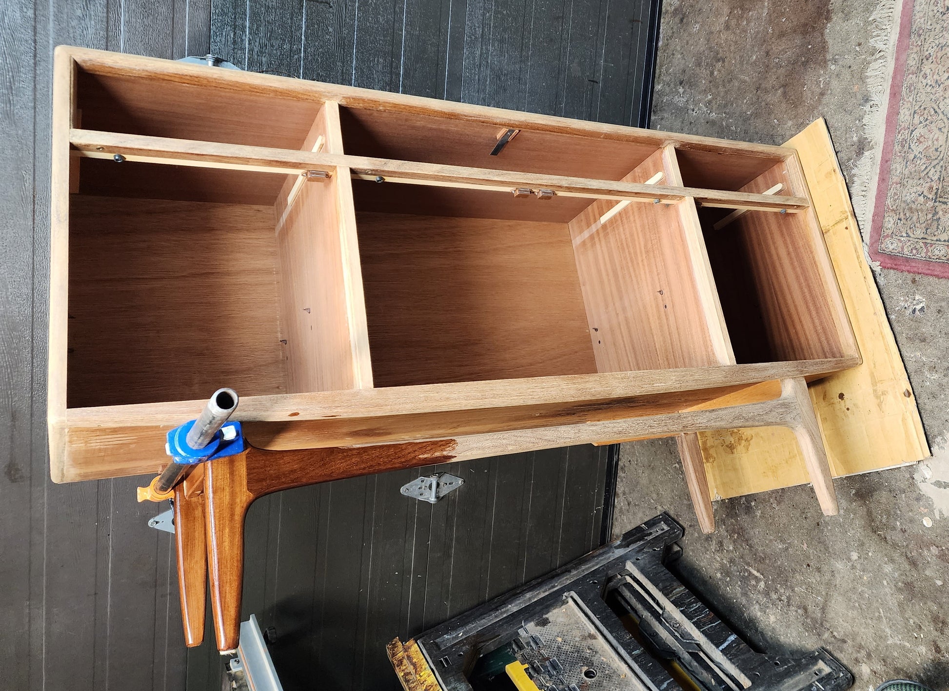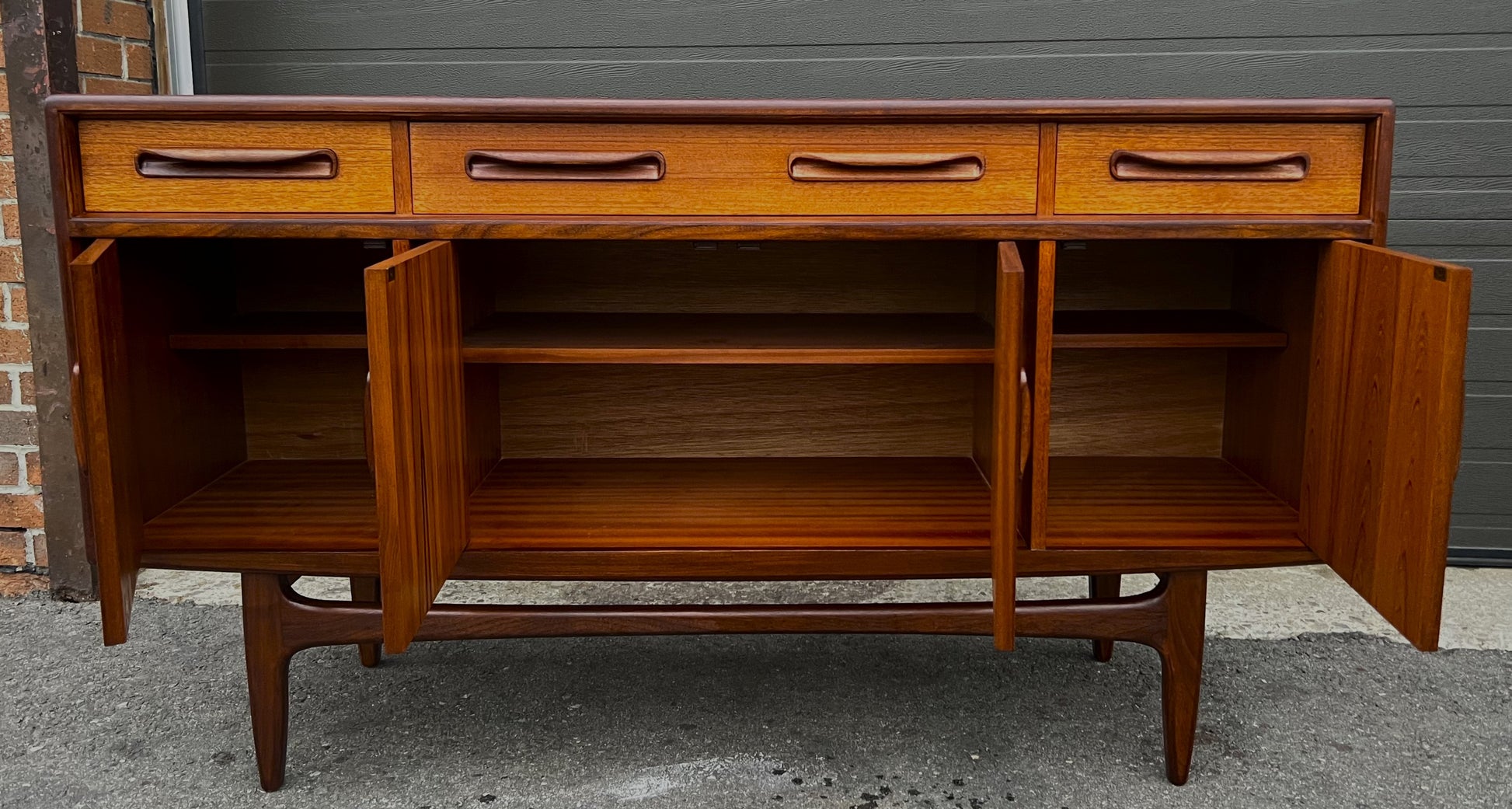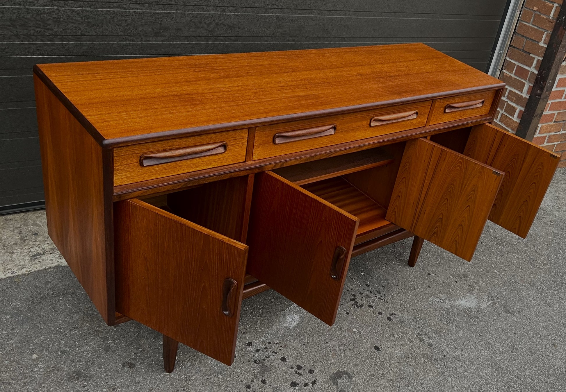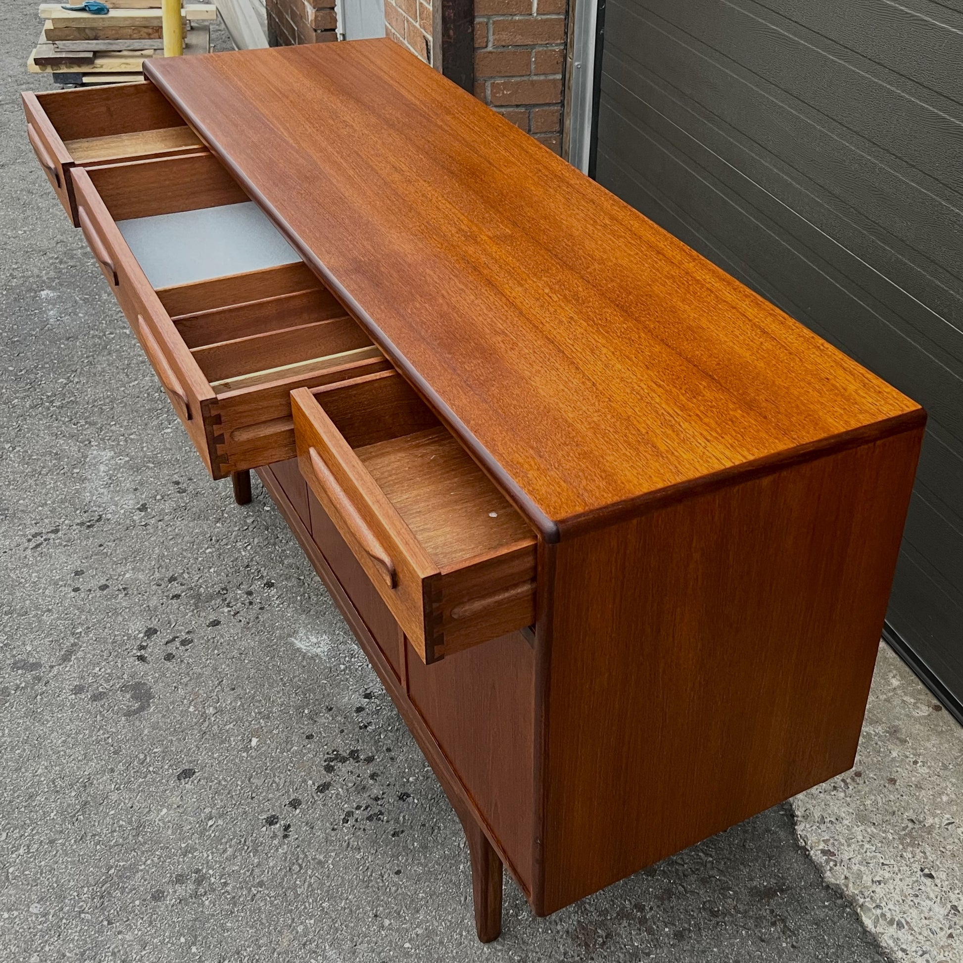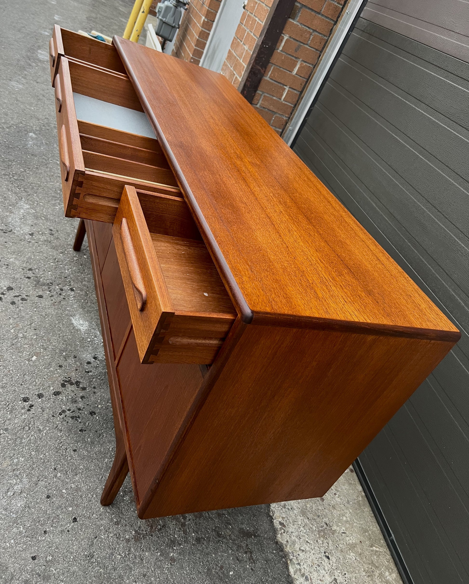 The sideboard features three cupboards behind 4 hinged doors, all with adjustable/ removable shelves inside, that are topped with 4 dovetailed drawers crafted out of solid wood with solid teak drawer fronts. The drawers are clean and slide easily.