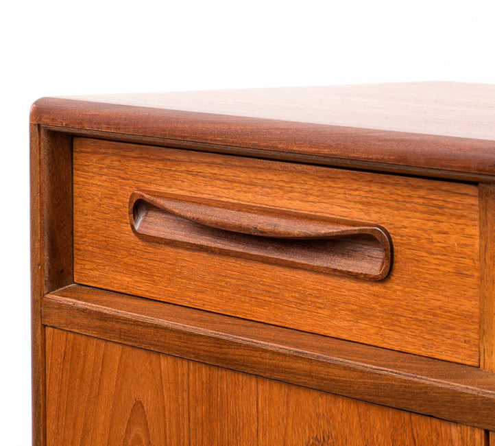 For sale, we have this gorgeous compact Mid Century Modern teak sideboard/ credenza/ buffet designed in 1969 by Victor Bramwell Wilkins for the Fresco range of the prestigious British label Gplan by E Gomme Ltd.