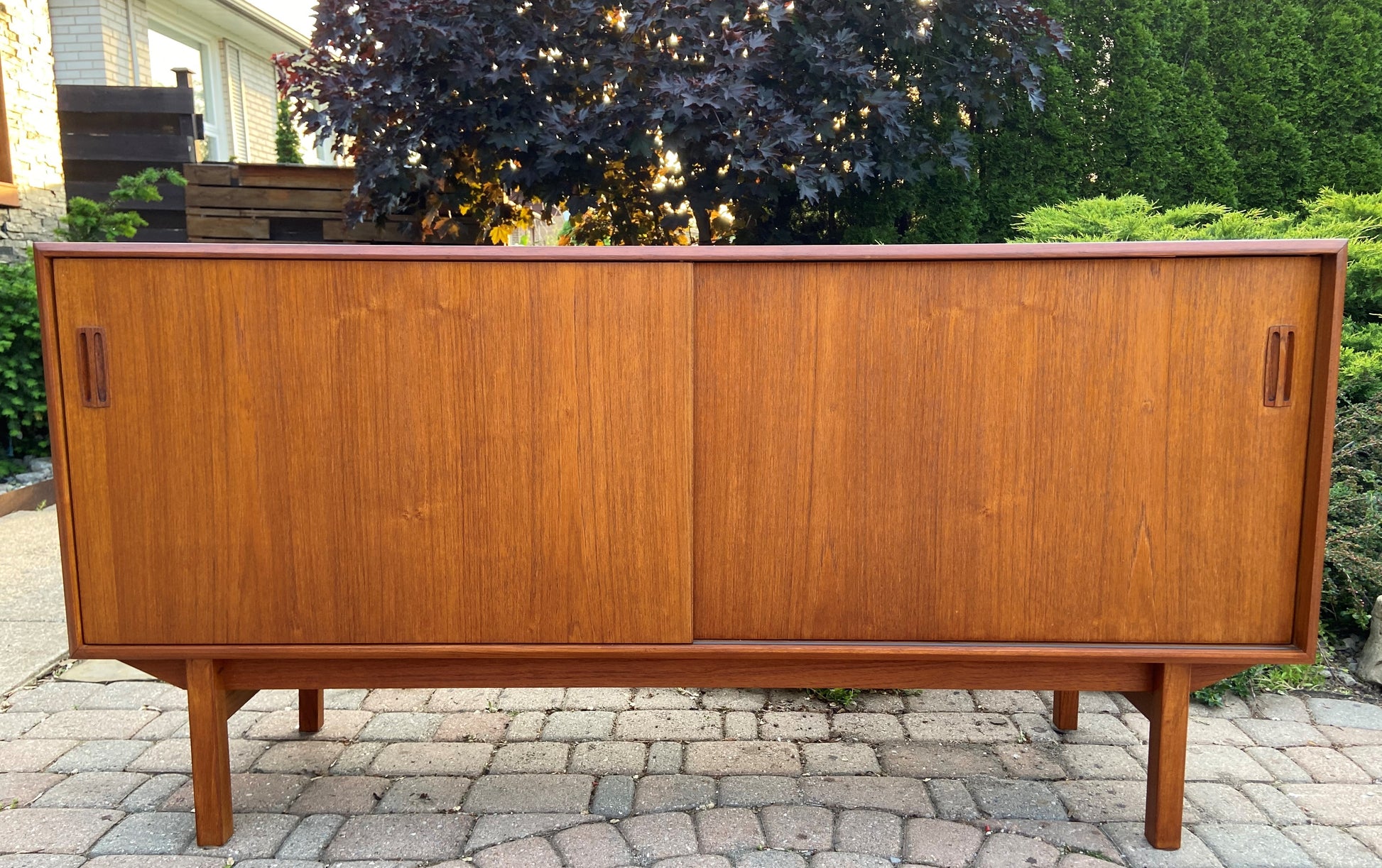 This beautiful Mid Century Modern teak sideboard / credenza/ buffet has been stripped, sanded and refinished with Danish oil to a magazine worthy new look, nothing to point out. This versatile storage piece features simple sleek lines with its teak wood grain and inset handles being the only ornamentation.