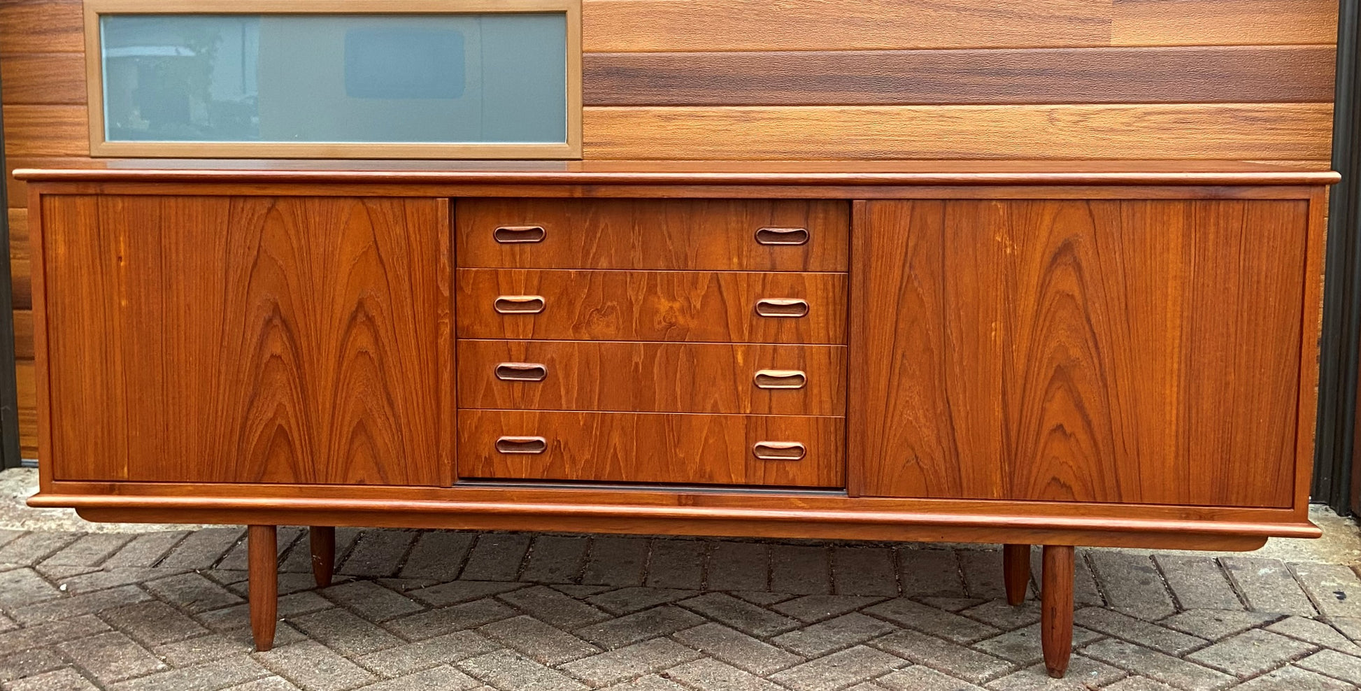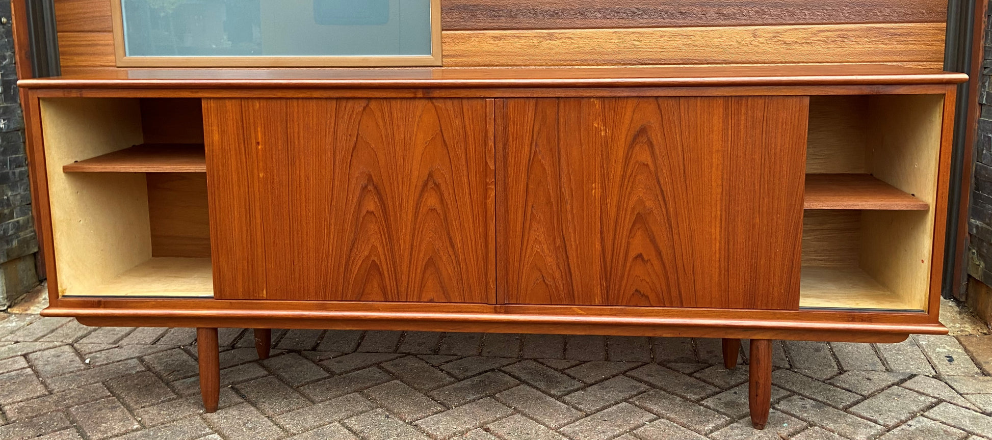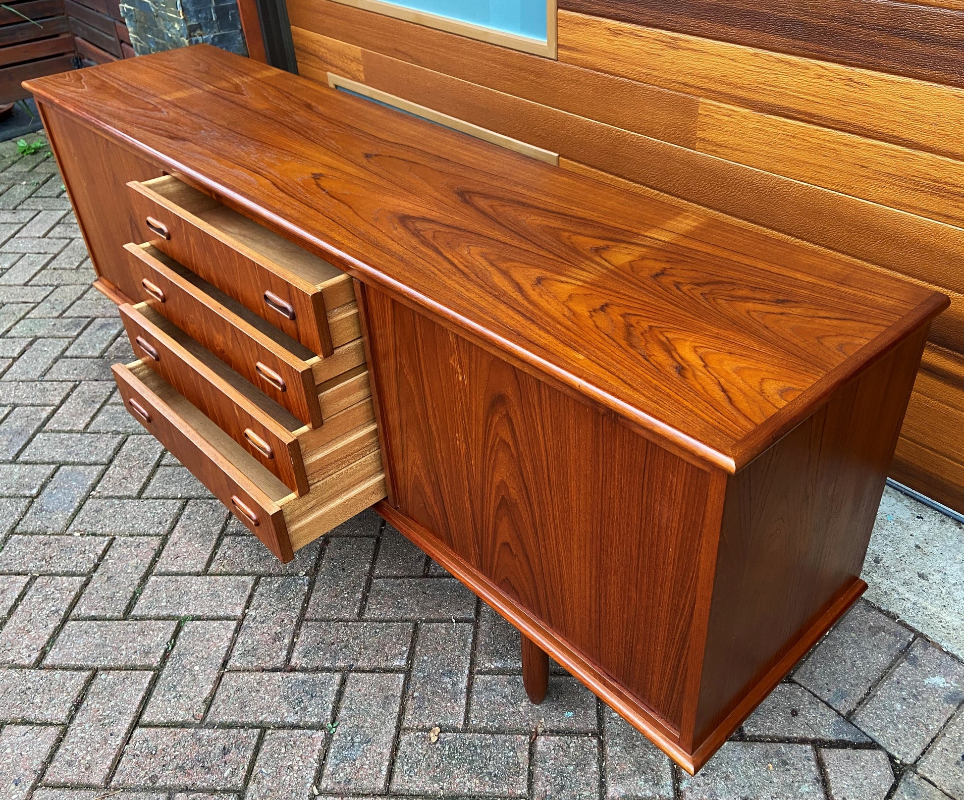 This beautiful Mid Century Modern teak sideboard / buffet/ TV media console has been restored to almost like new condition (1 tiny scratch, not visible in the room) with light shading on top where the hutch was kept for a long time.