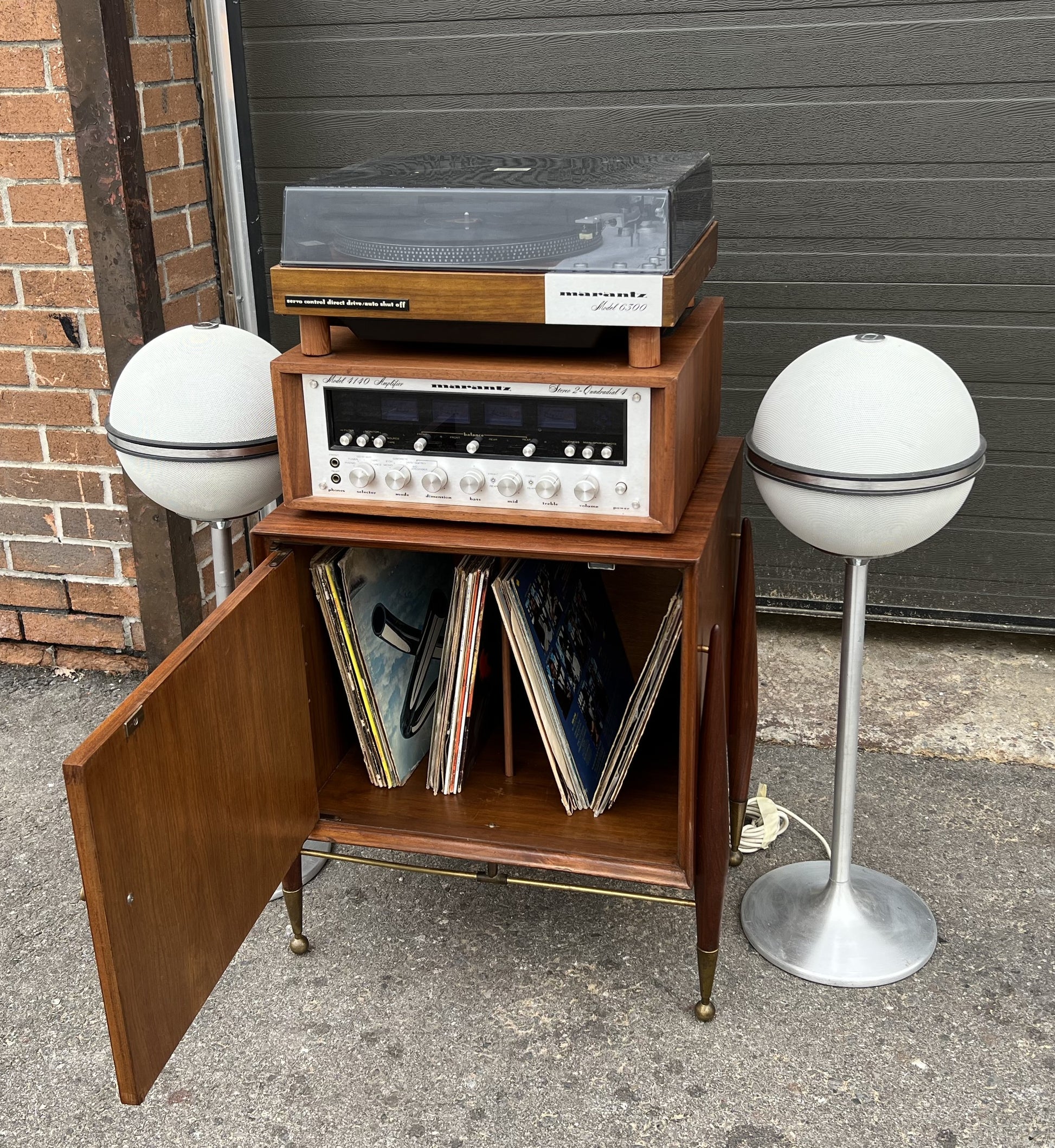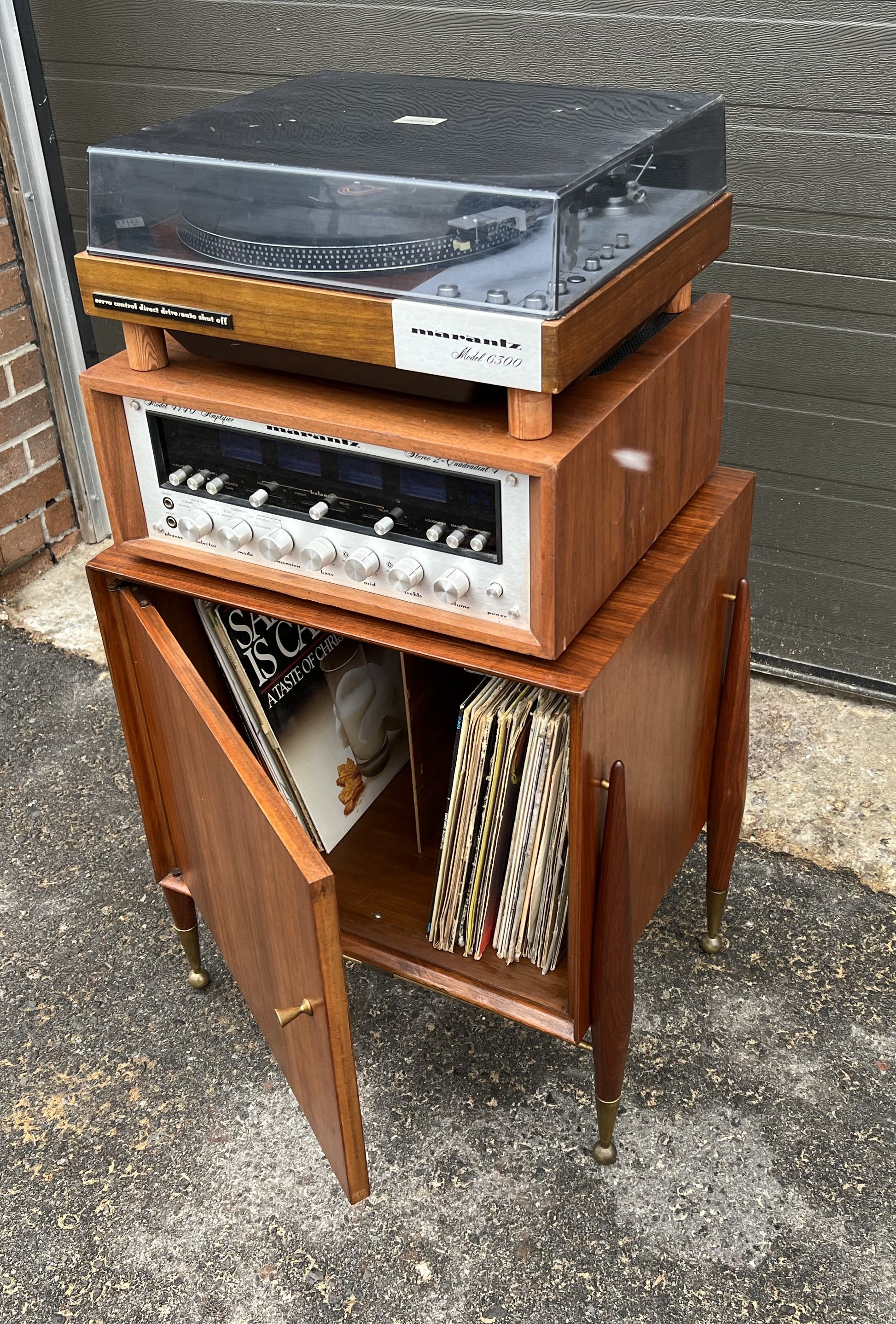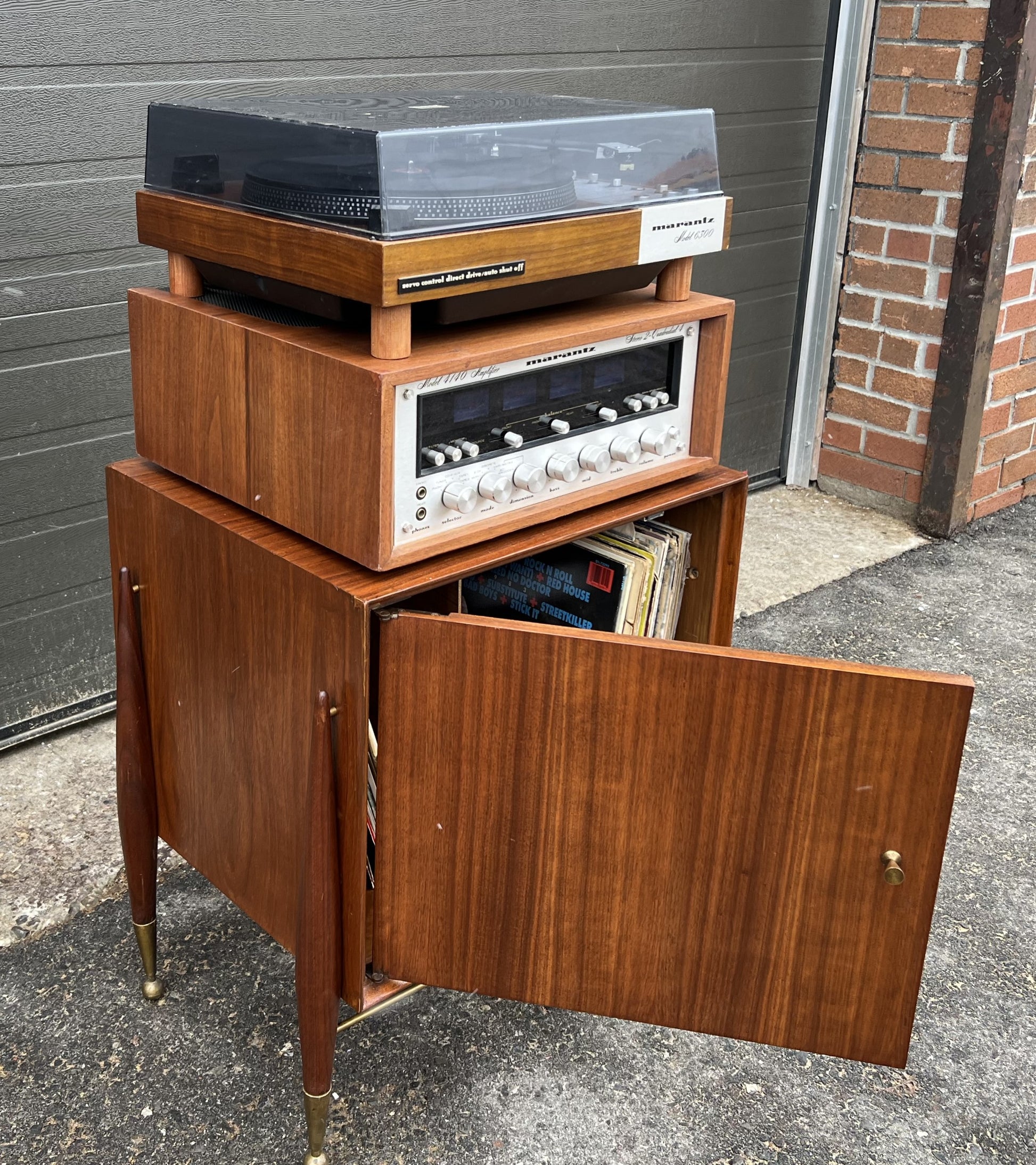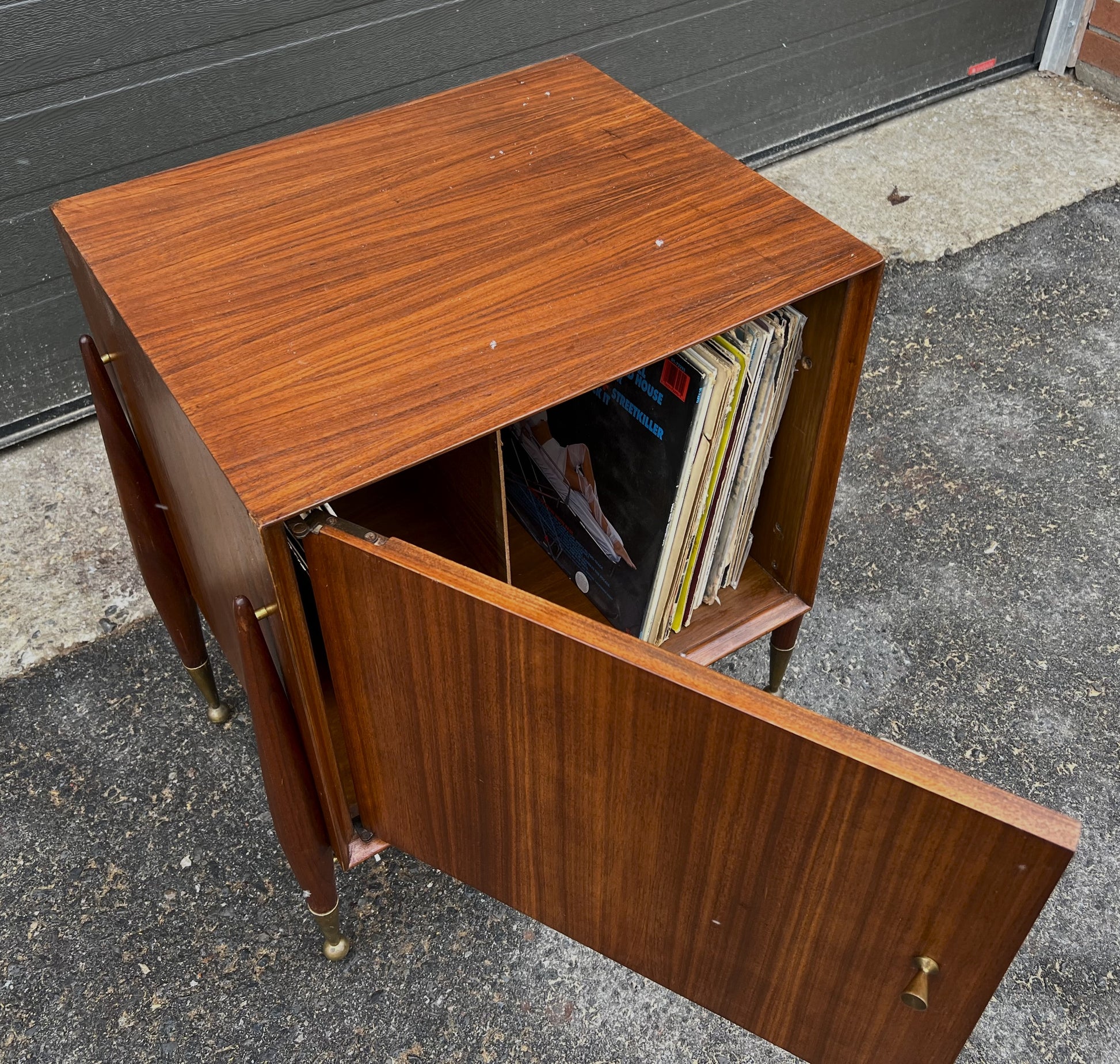 REFINISHED Mid Century Modern walnut accent cabinet w brass hardware, small 20β