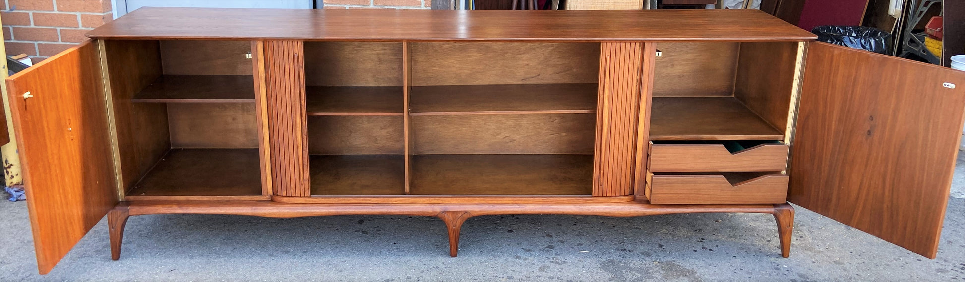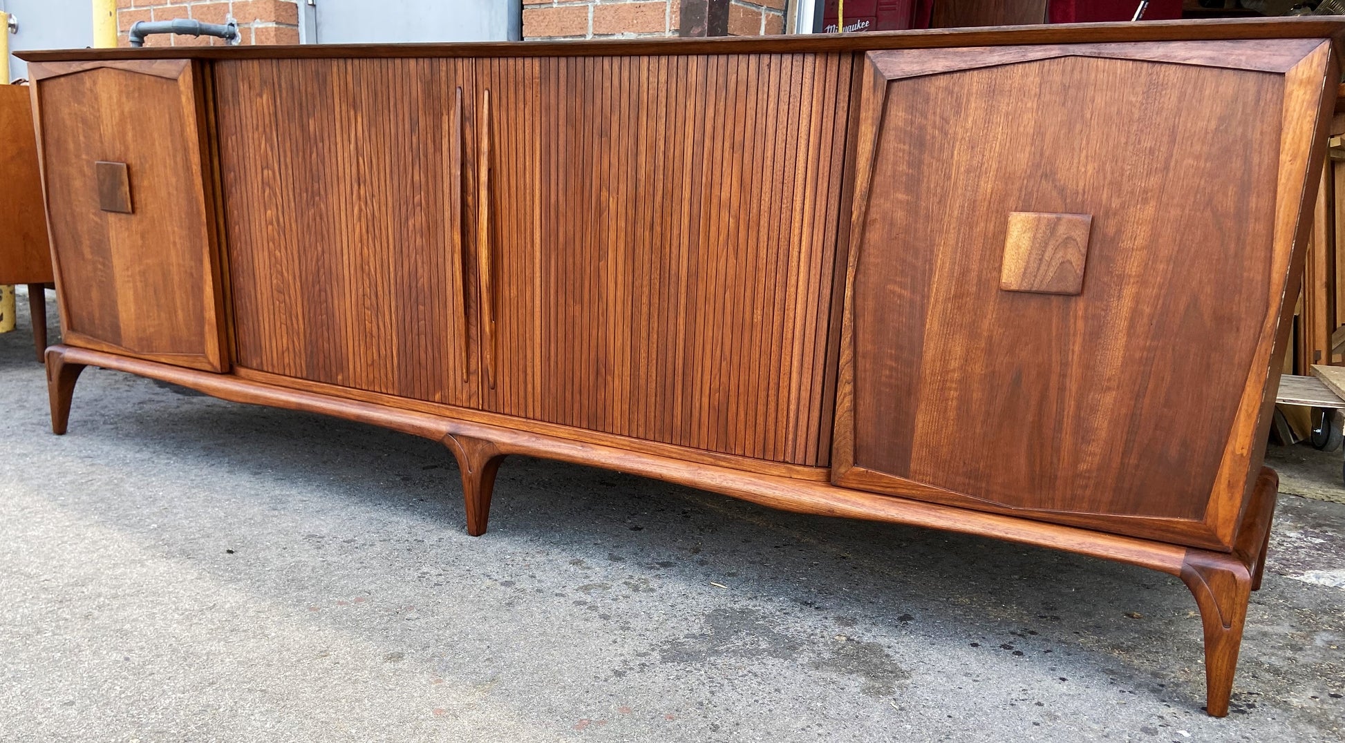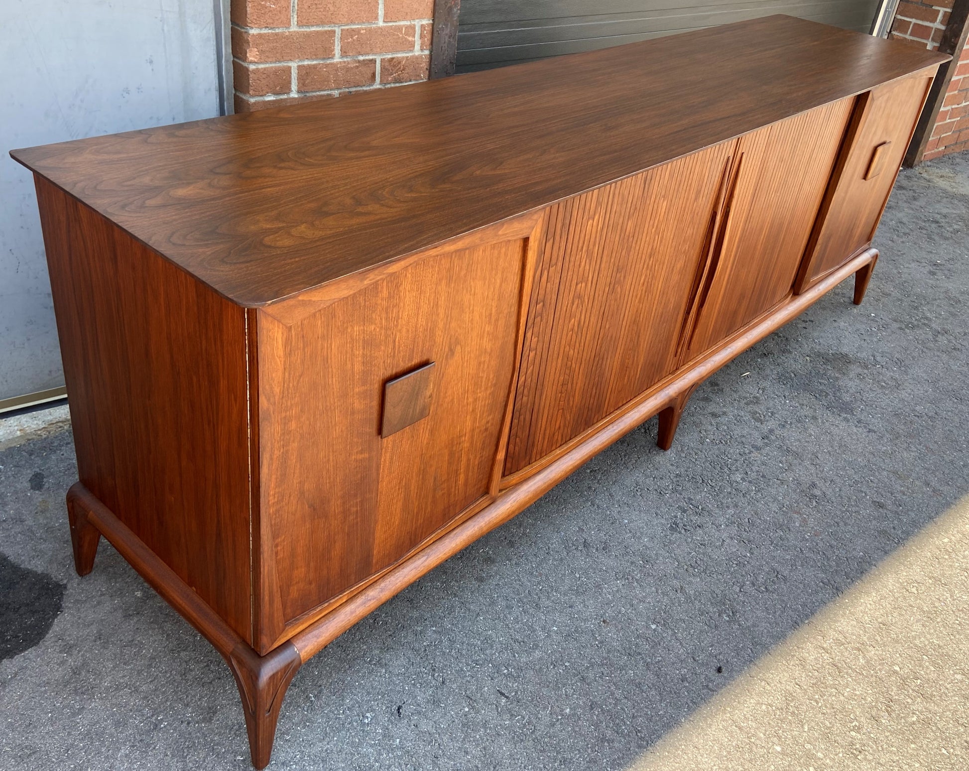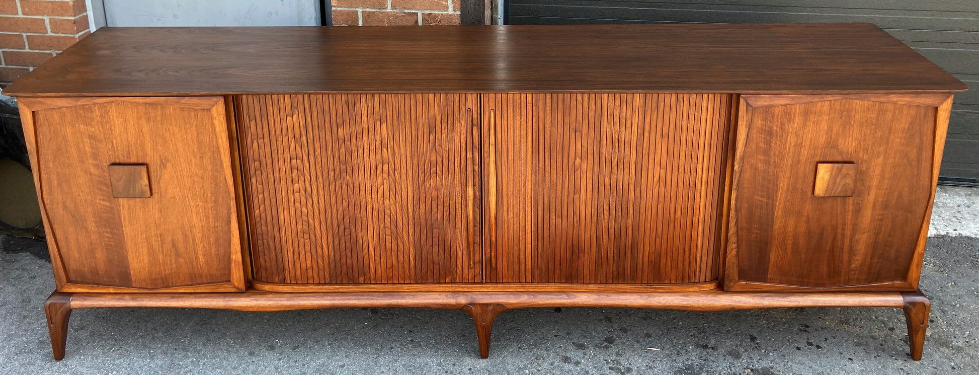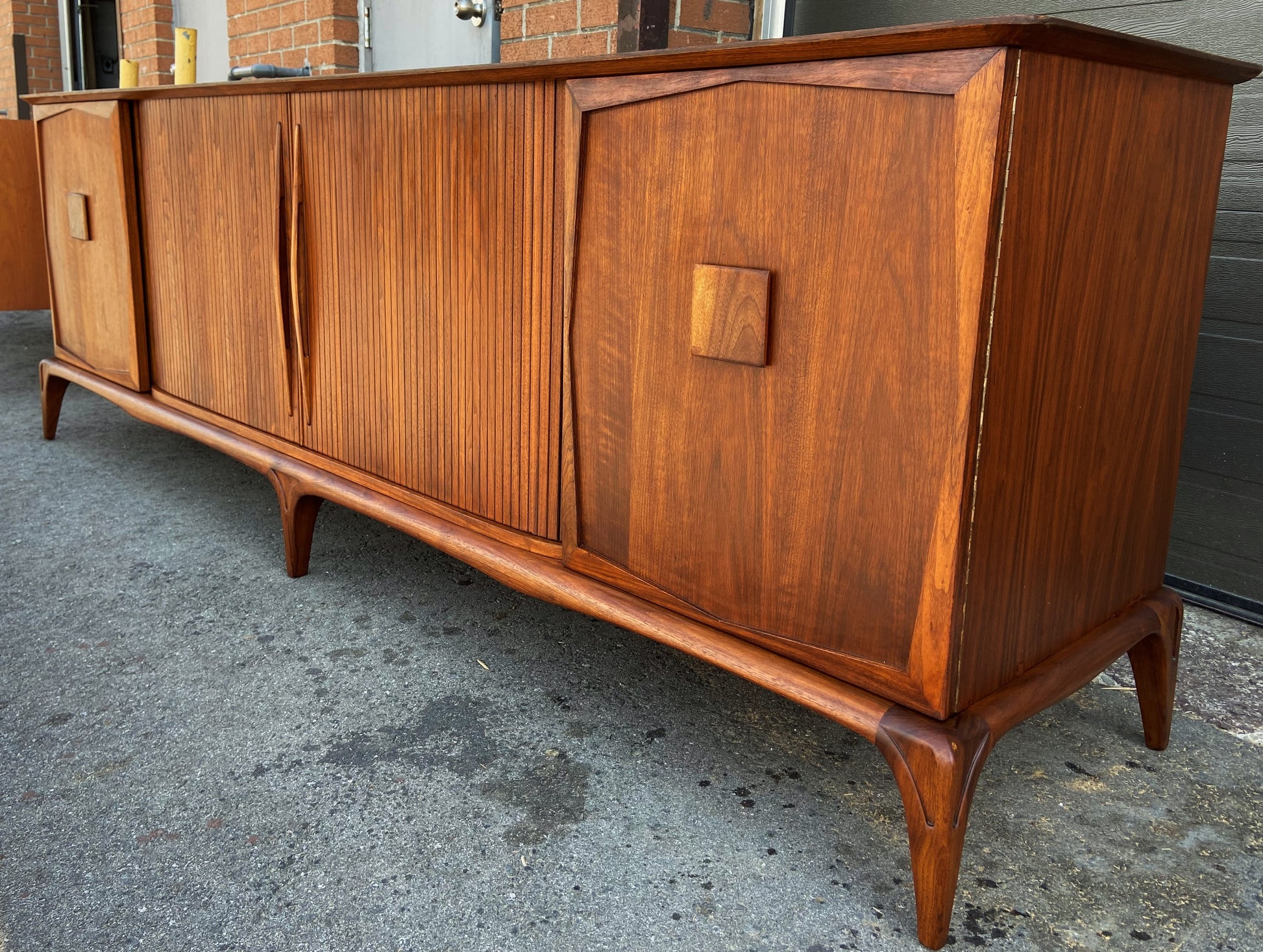 REFINISHED Mid Century Modern Walnut Credenza with Tambour doors, 8 ft