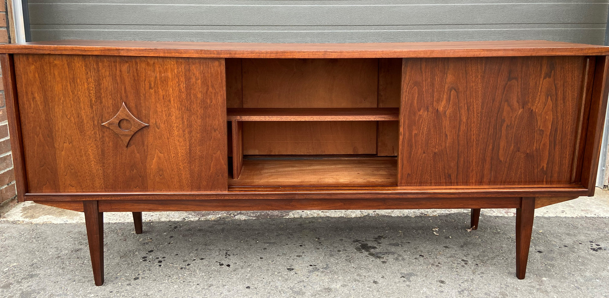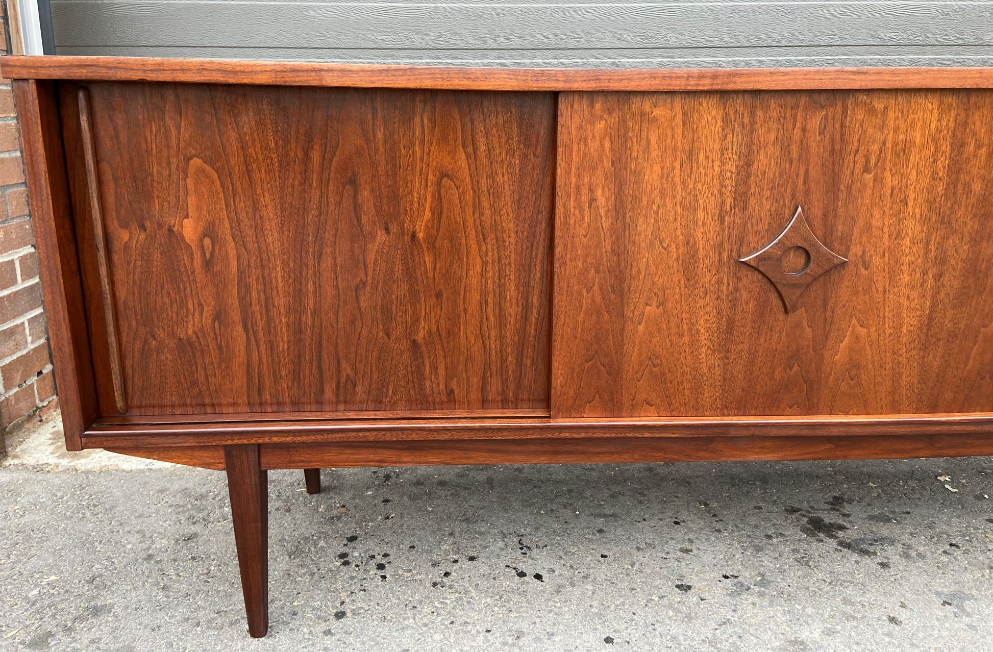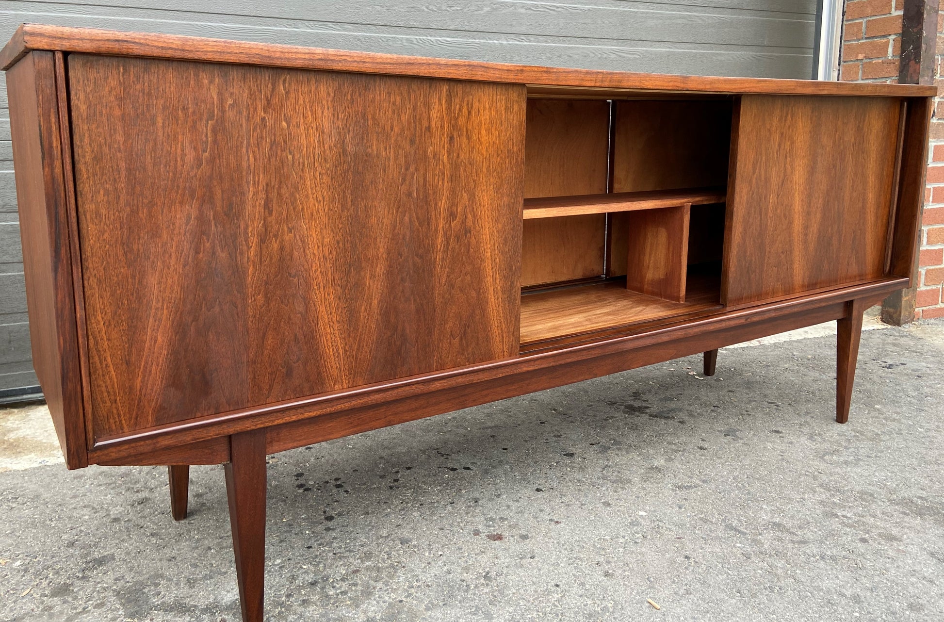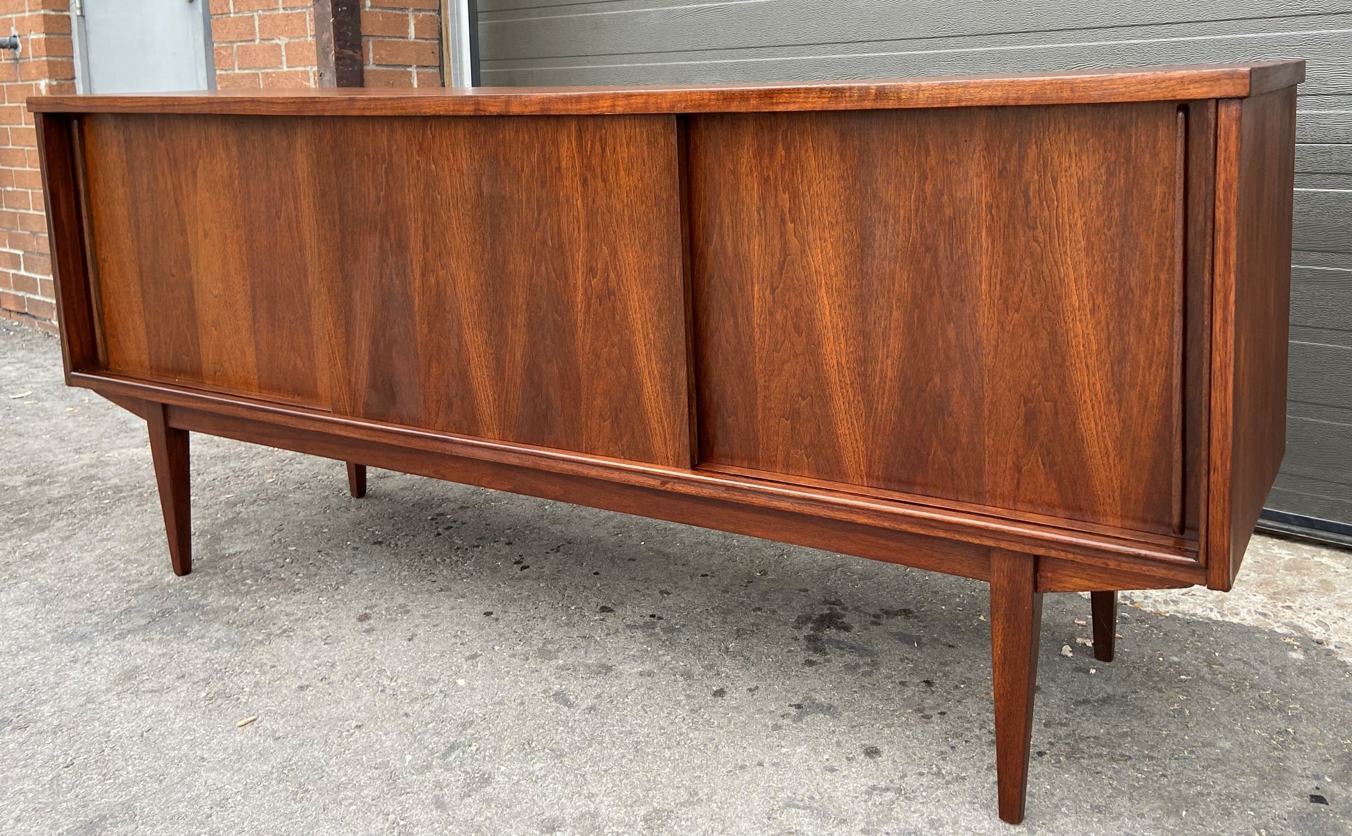 This unique elegant Mid Century Modern walnut sideboard/ credenza/ buffet has been stripped, sanded and refinished with Danish oil to magazine worthy new look.