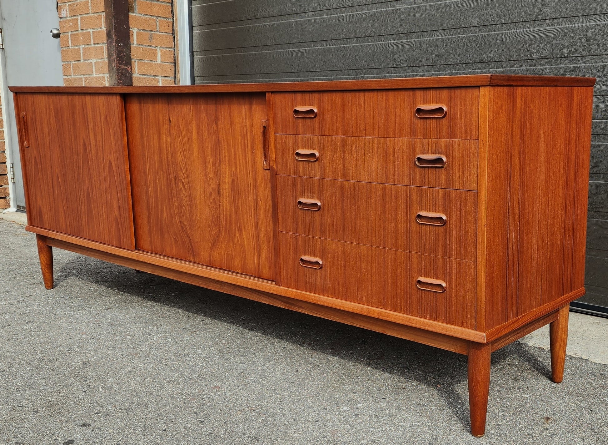 The sideboard has been completely stripped, sanded, and refinished with Danish oil to like-new condition with just minimal blemishes (the bottom of one door has a few chips filled).