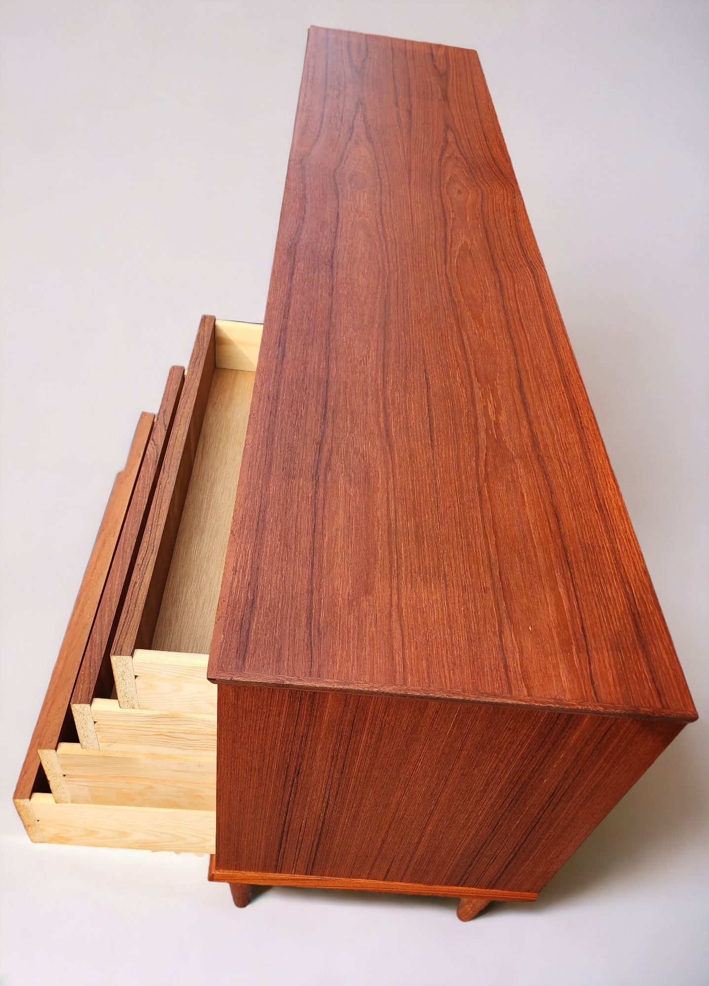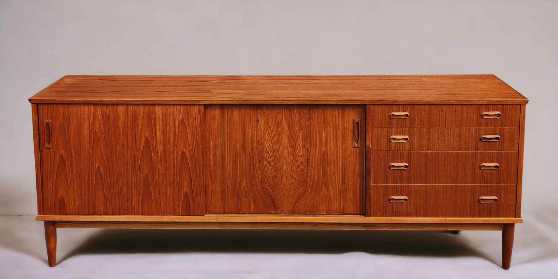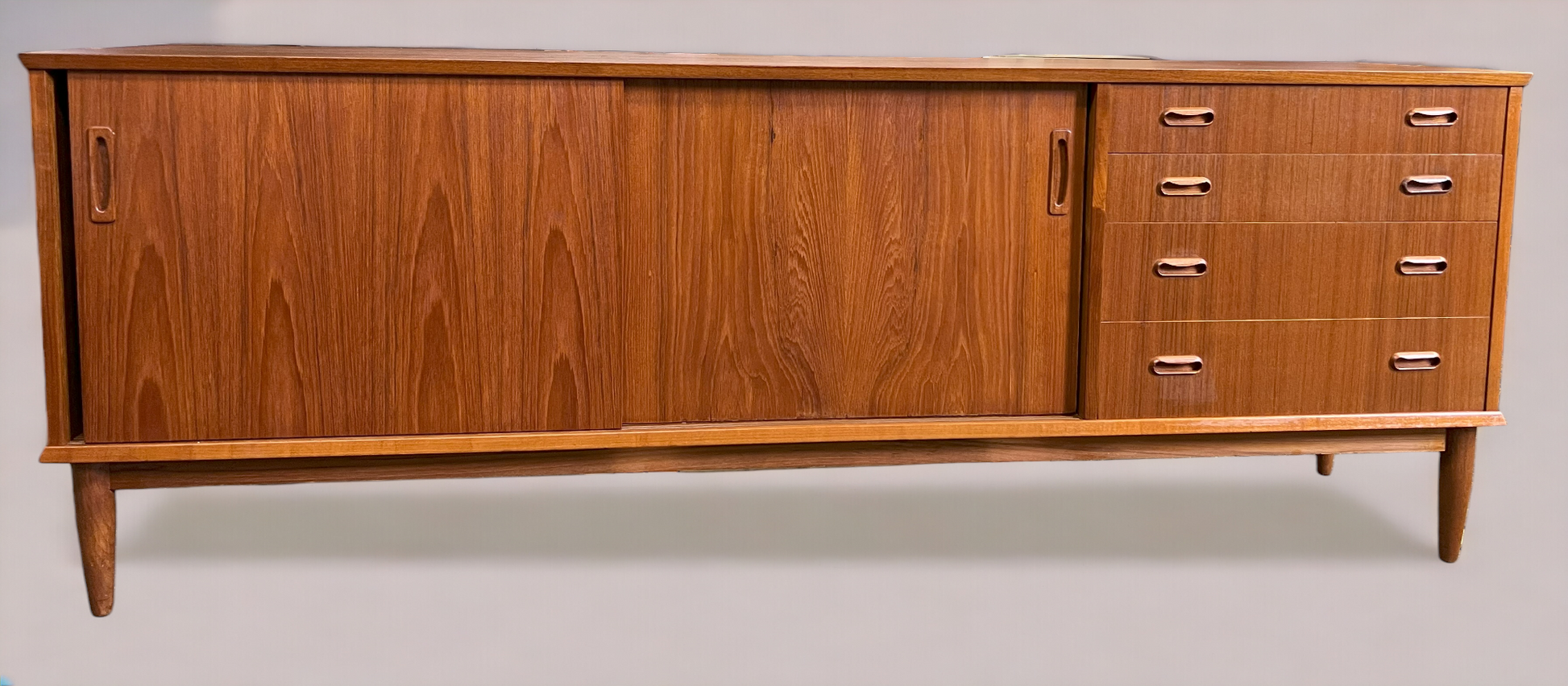 The sideboard has been stripped, sanded and refinished with Danish oil to almost like new condition with just a few minor blemishes on top.