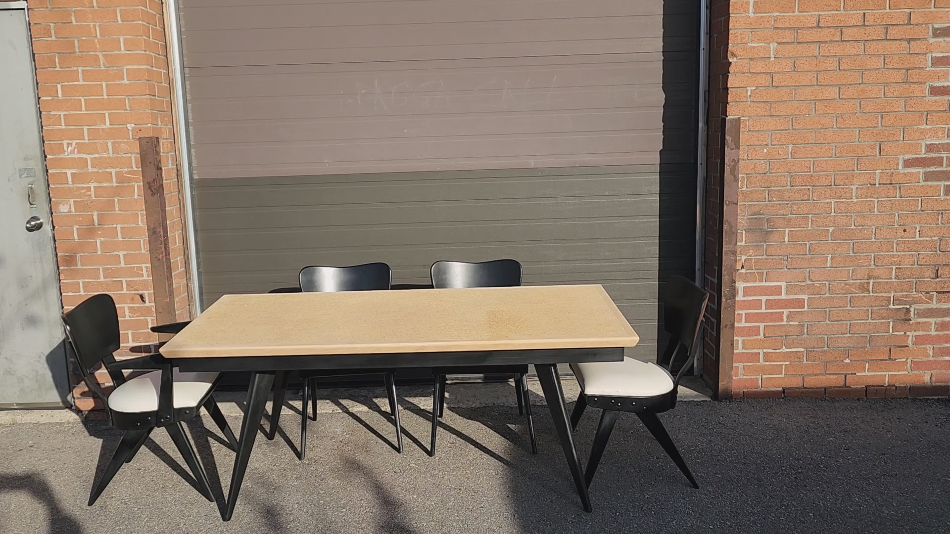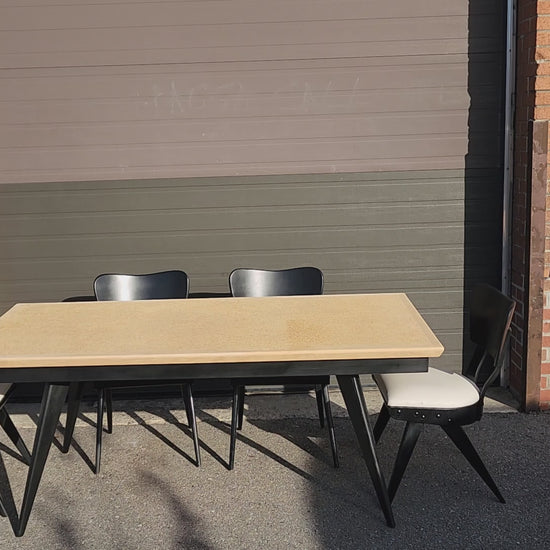 We are currently working on the set, and just stripped the aged cork tops on the table and buffets, and decided to offer our customers a choice to customize the set to best suit their homes. One option is as per the original design - ivory cork tops, black bodies, white vinyl seats. The second option is natural cork tops, black bodies, and sand colored vinyl or fabric seats.