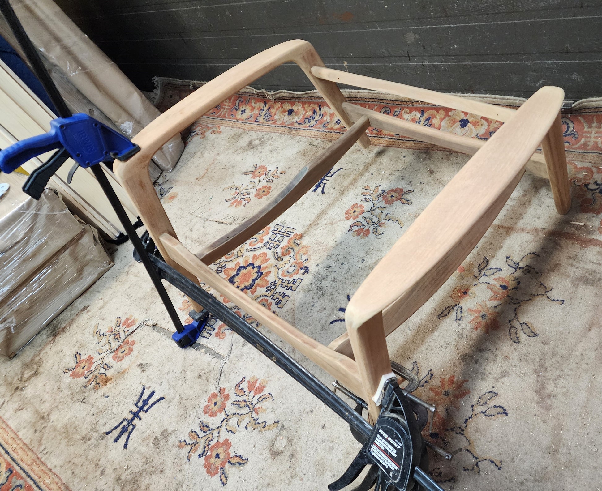 A gorgeous teak frame made of solid teak (teak lumber in this quality is no longer available), has been completely stripped, sanded, and refinished with Danish oil to perfection.