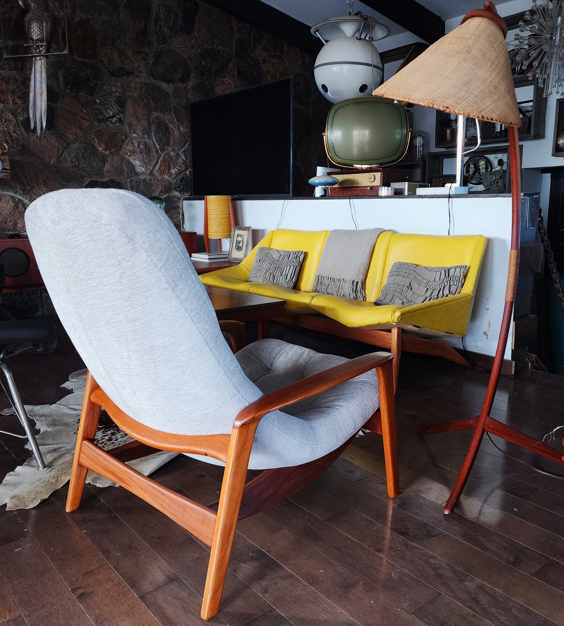 For sale, we have an iconic Mid Century Modern teak lounge chair known as Scoop, designed by a Danish designer and manufactured by R. Huber & Co. in the late 1960s. It is one of the most comfortable chairs we sat on.