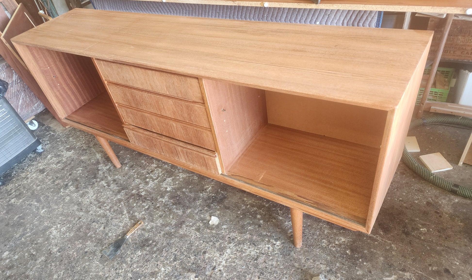 The sideboard has been stripped, sanded and refinished with Danish oil to almost like new condition with just a few minor blemishes on top.