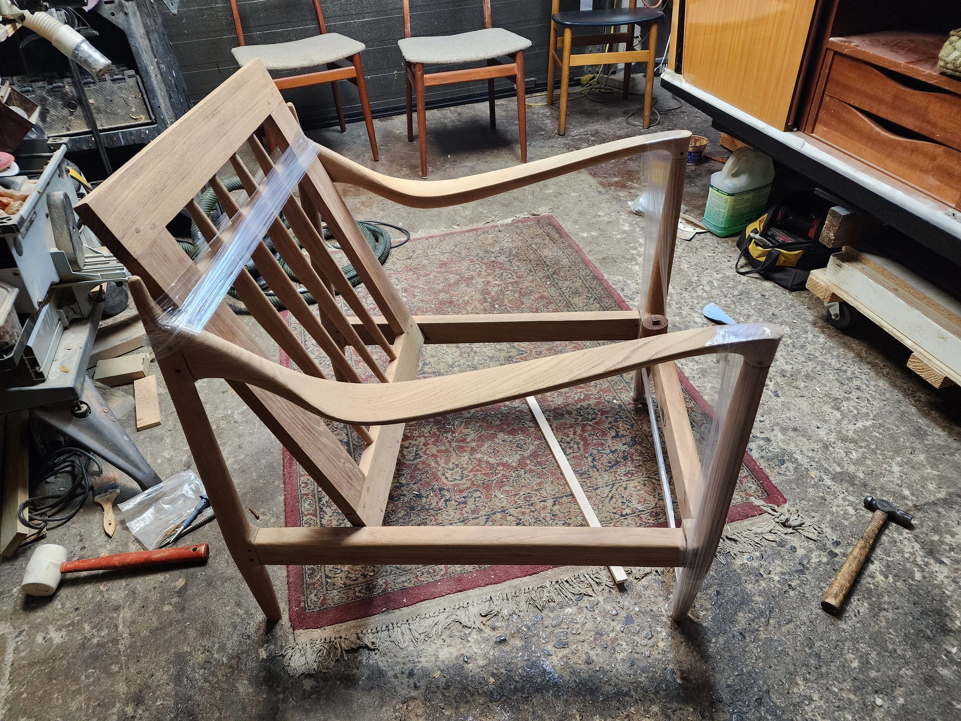 The chair has been completely dismantled, stripped, sanded, and oiled multiple times with Danish oil, assembled again, and reglued, and it is essentially like new with just very minimal blemishes.