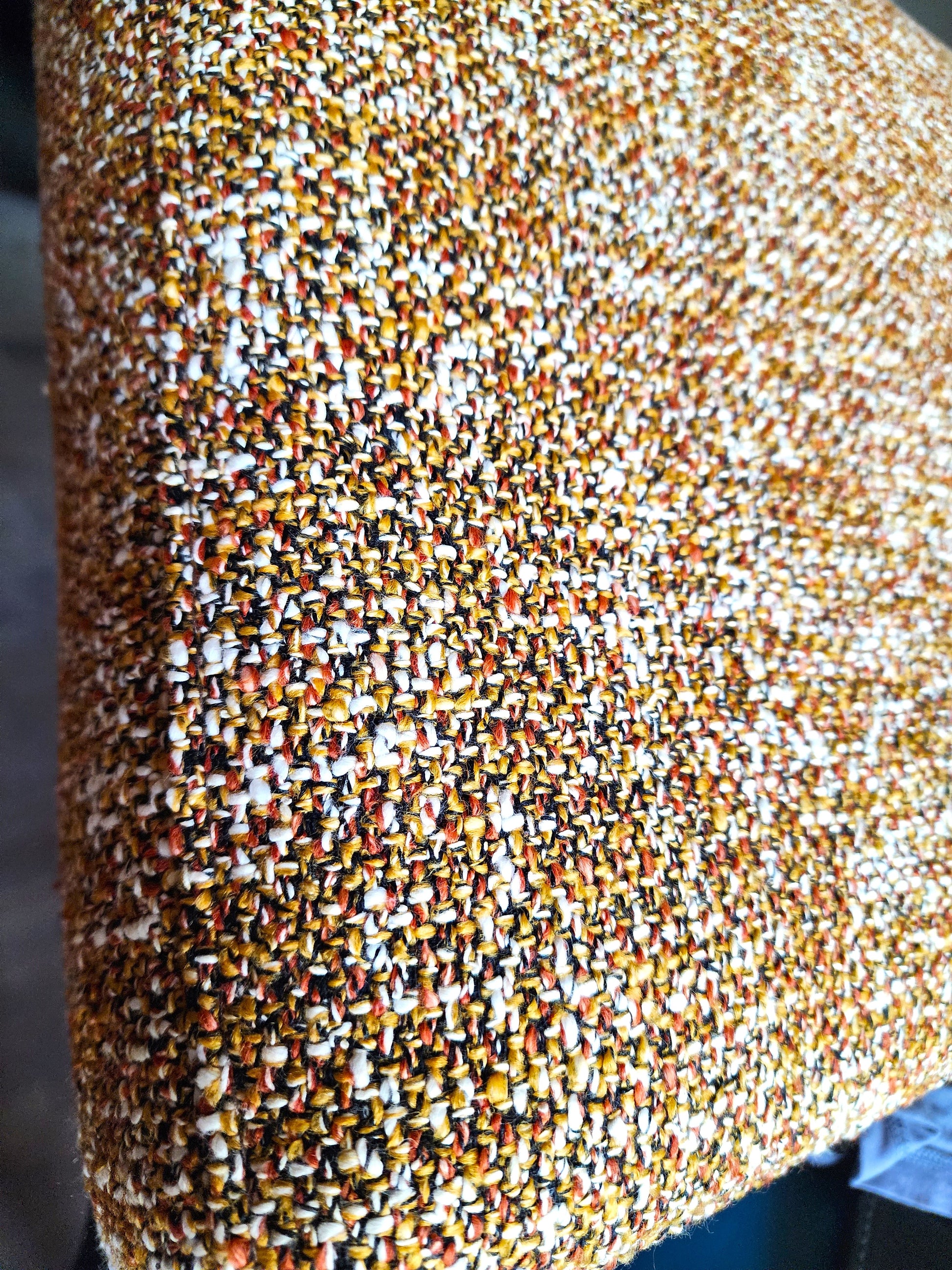 The chair also got new webbing and new pillows done in gorgeous multicolored (yellow, rust, white, black, orange) performance fabric with a vapor barrier.