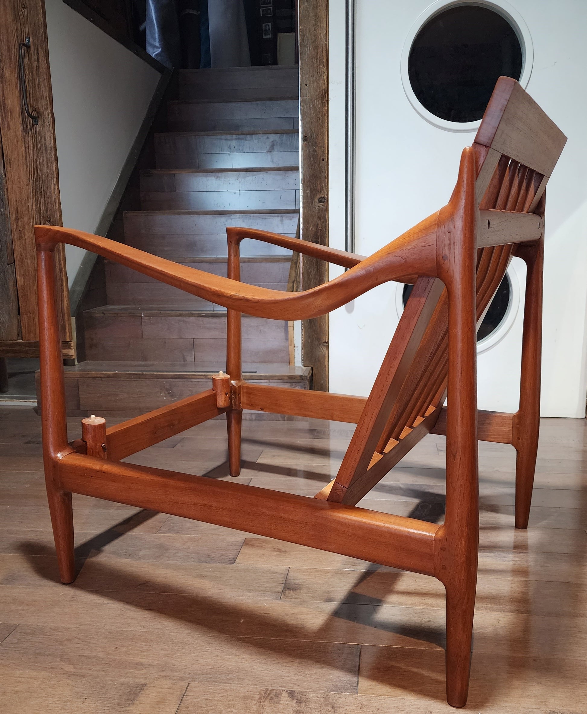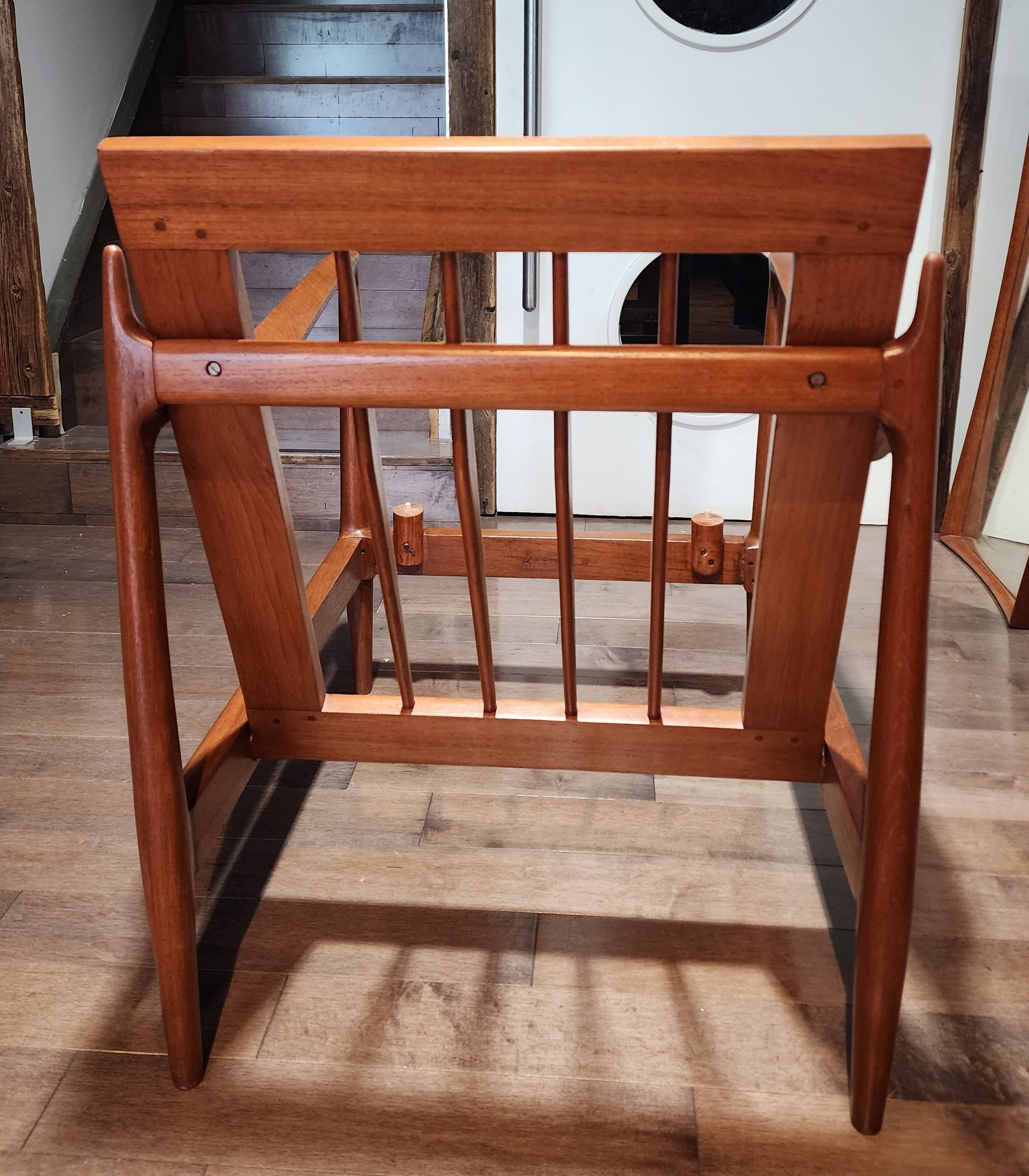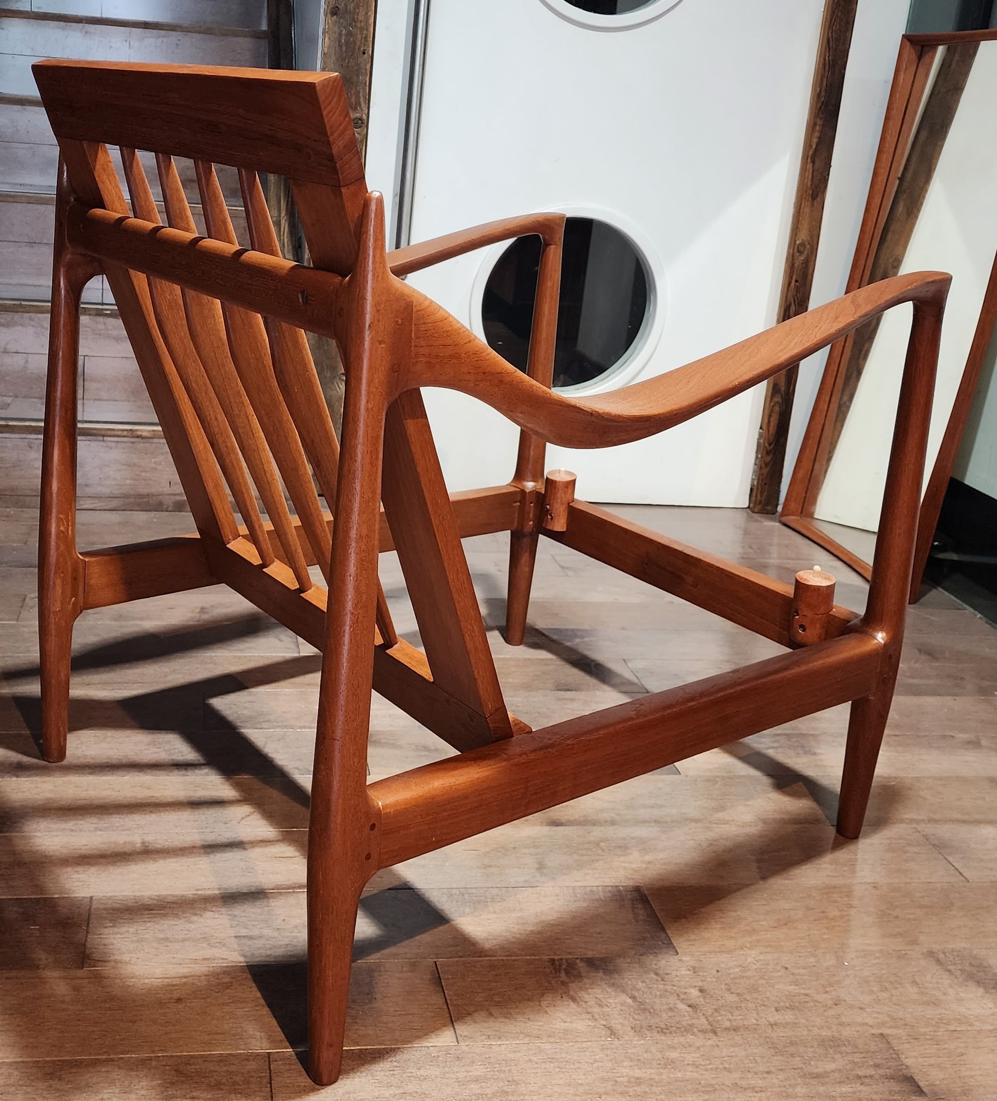 For sale, we have this very distinctive Danish Mid Century Modern lounge chair. Sculptural solid teak frame with stunning profile, and curved arm supports and fin-like spindle back for comfortable seating and an equally beautiful look.