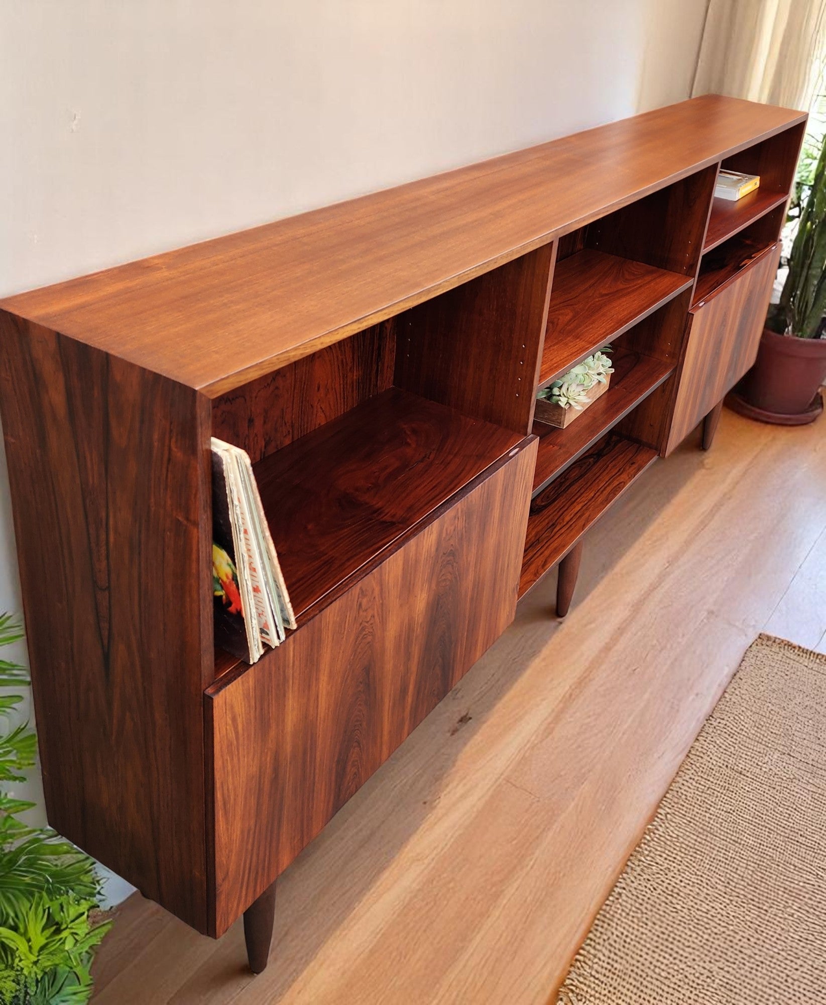 For sale, we have a vintage Danish Mid Century Modern rosewood cabinet with open and closed storage areas, standing on 6 tapered legs.