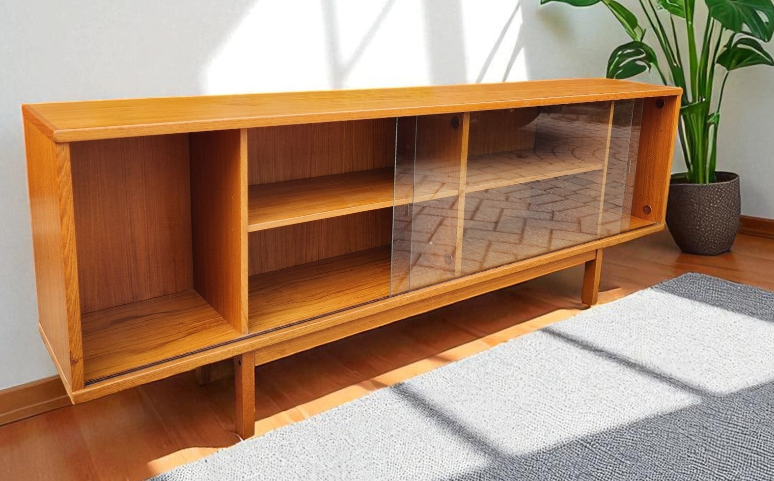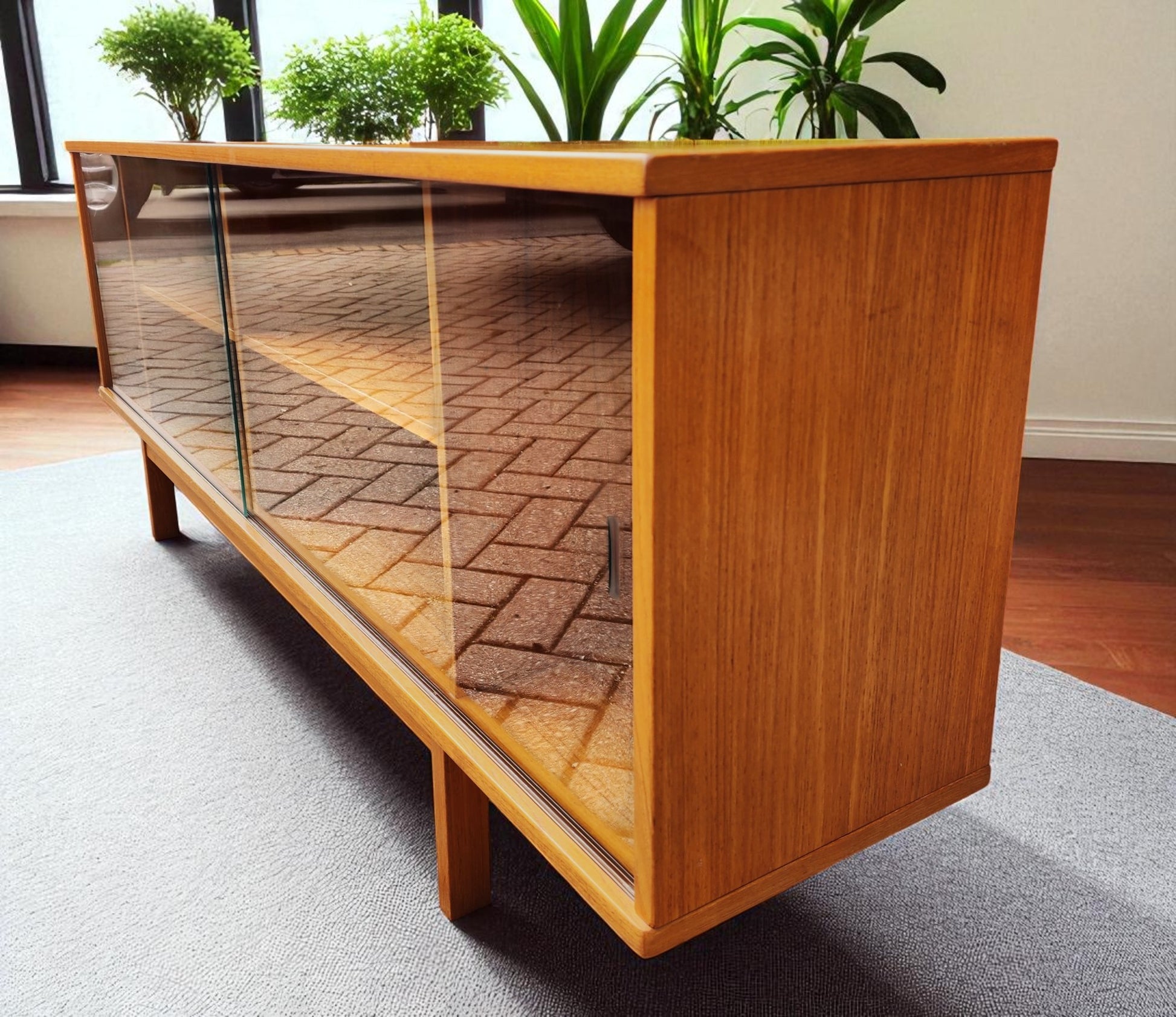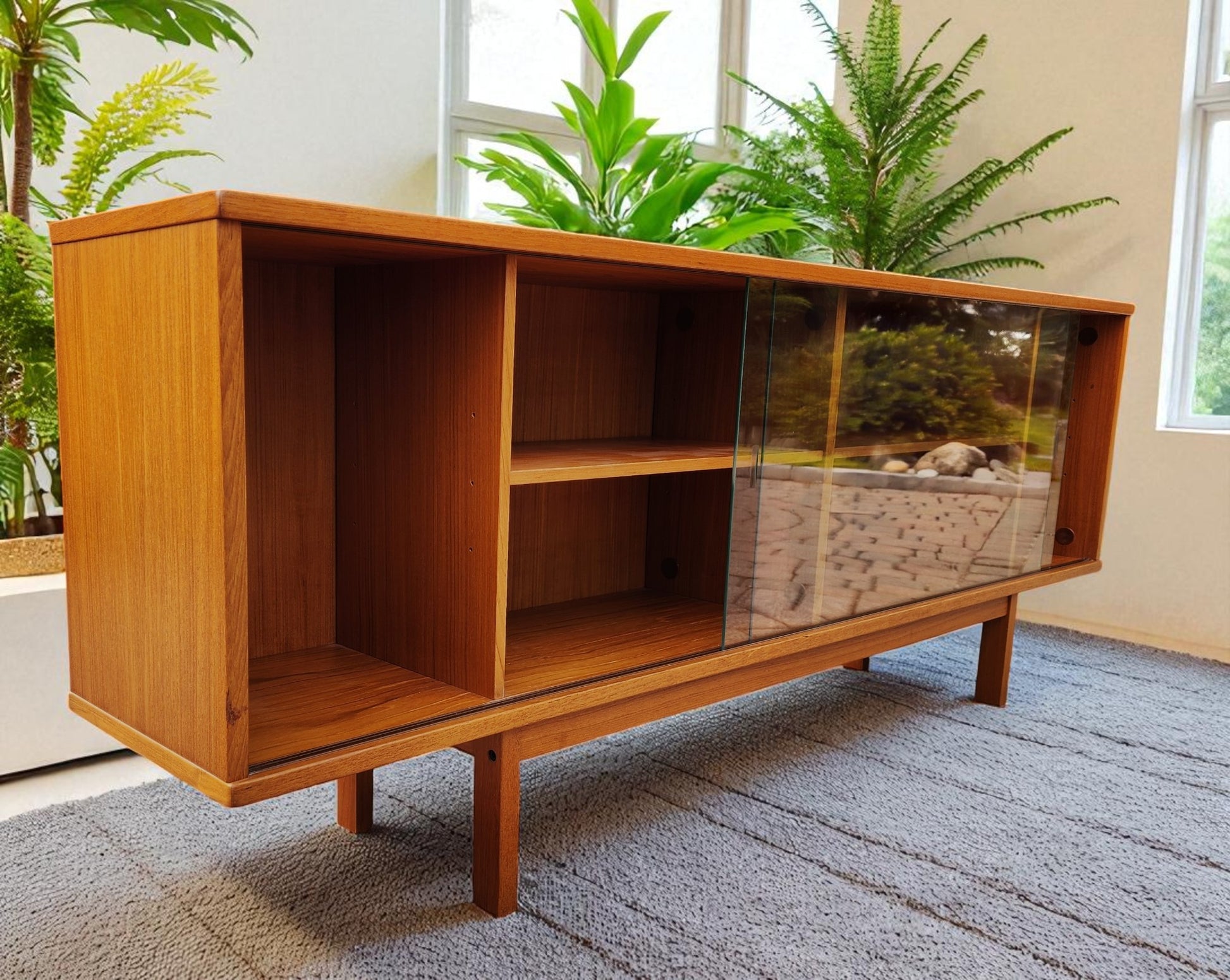 The piece is in excellent vintage condition, cleaned and polished, but retains the original factory finish. The glass doors can be taken off when needed. The original solid teak legs are part of the frame.