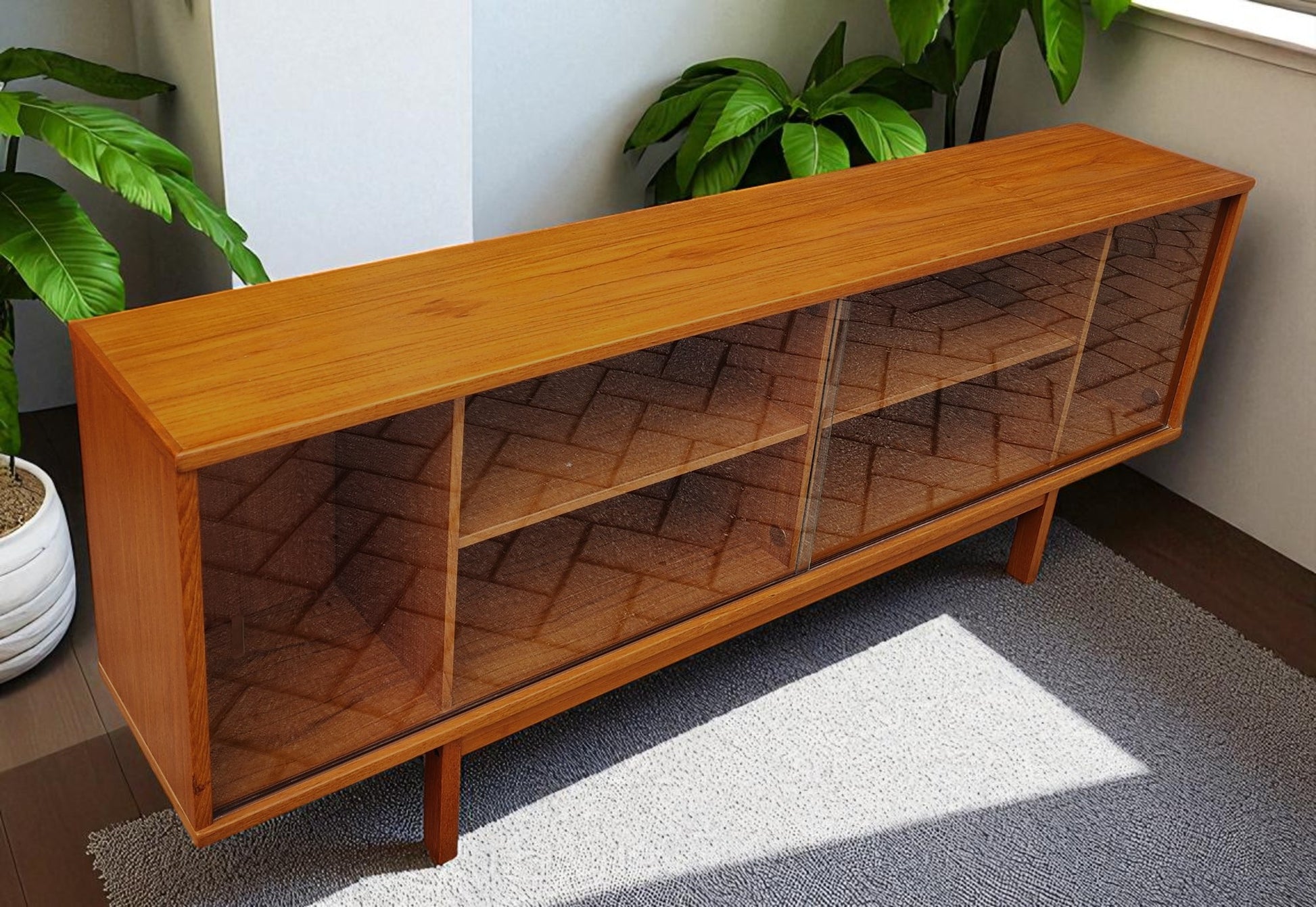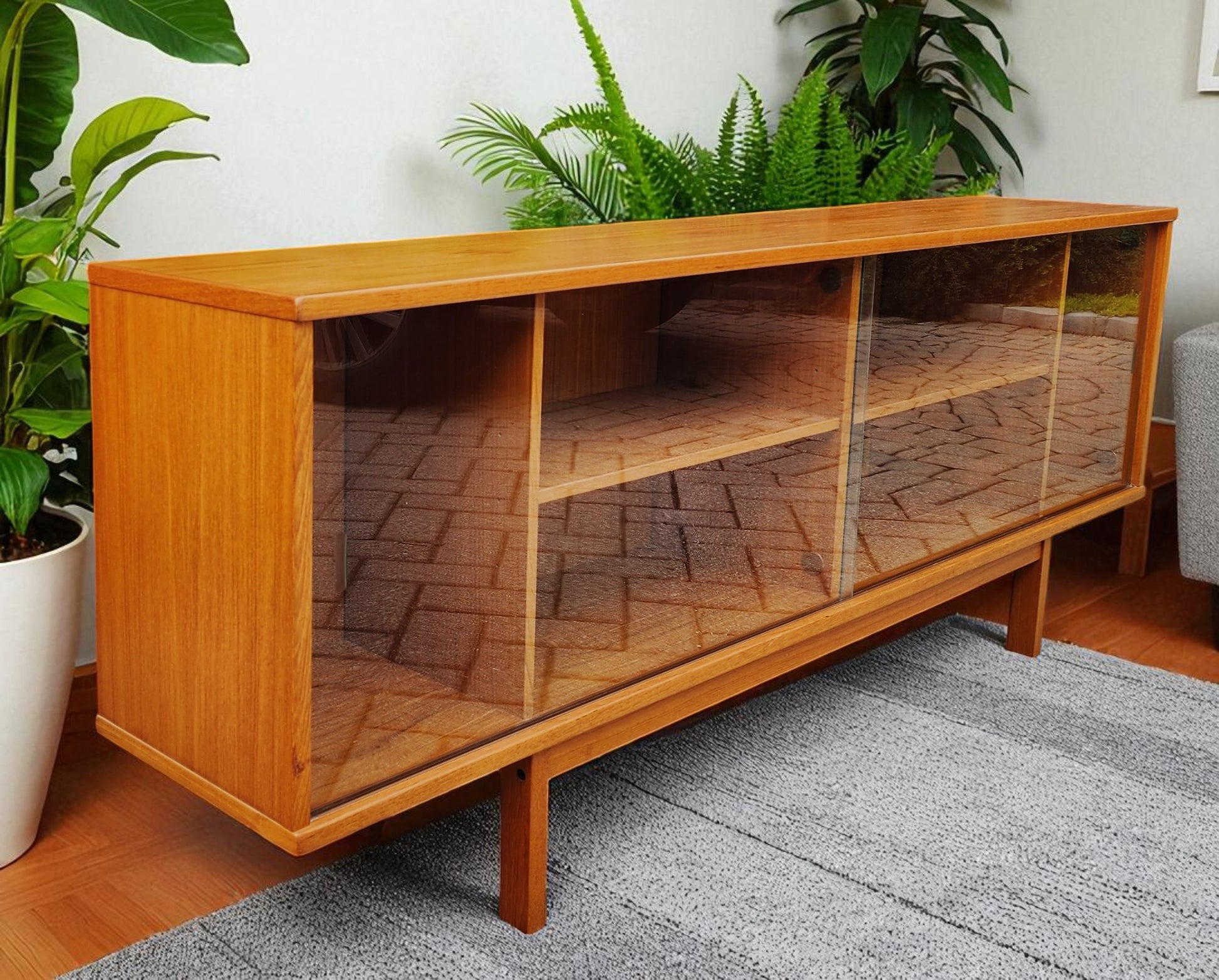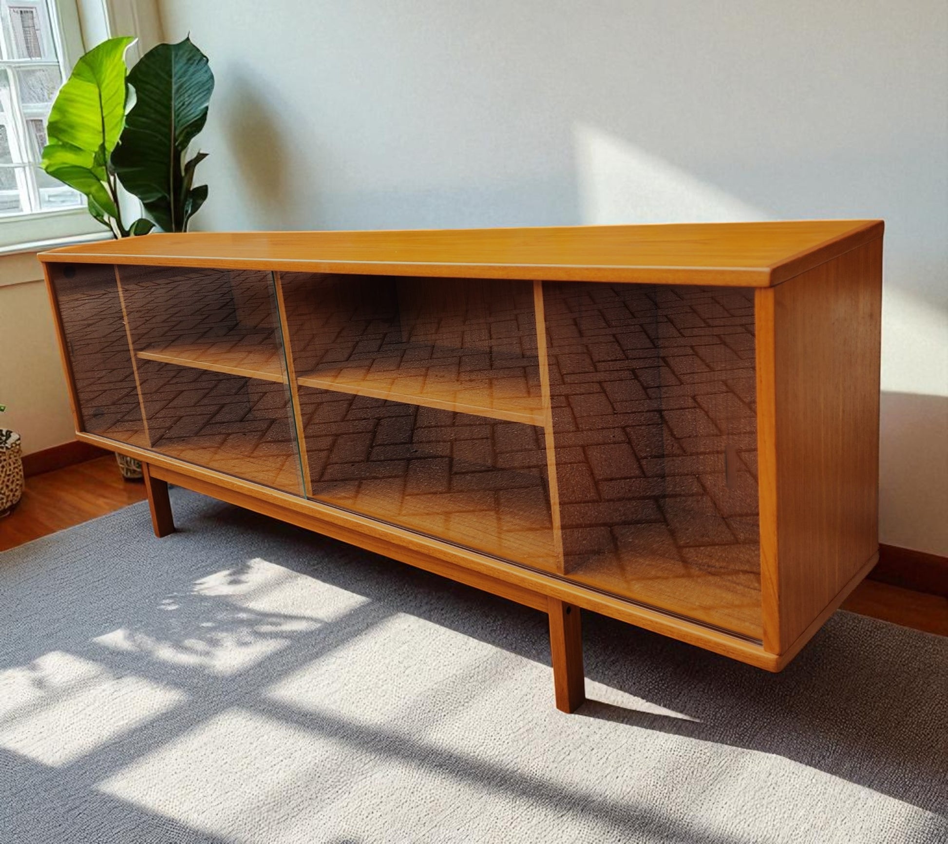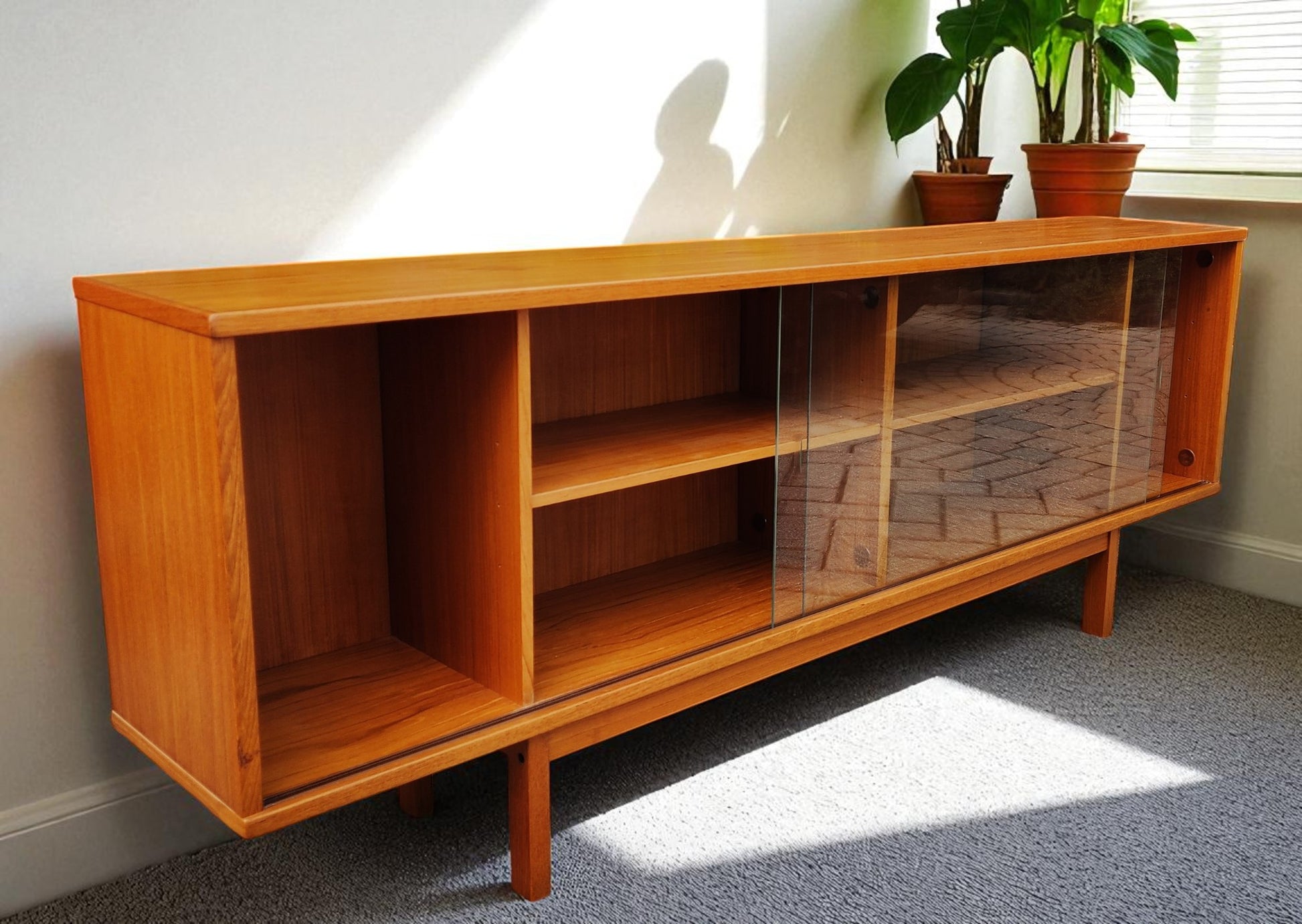 The piece is in excellent vintage condition, cleaned and polished, but retains the original factory finish. The glass doors can be taken off when needed. The original solid teak legs are part of the frame.