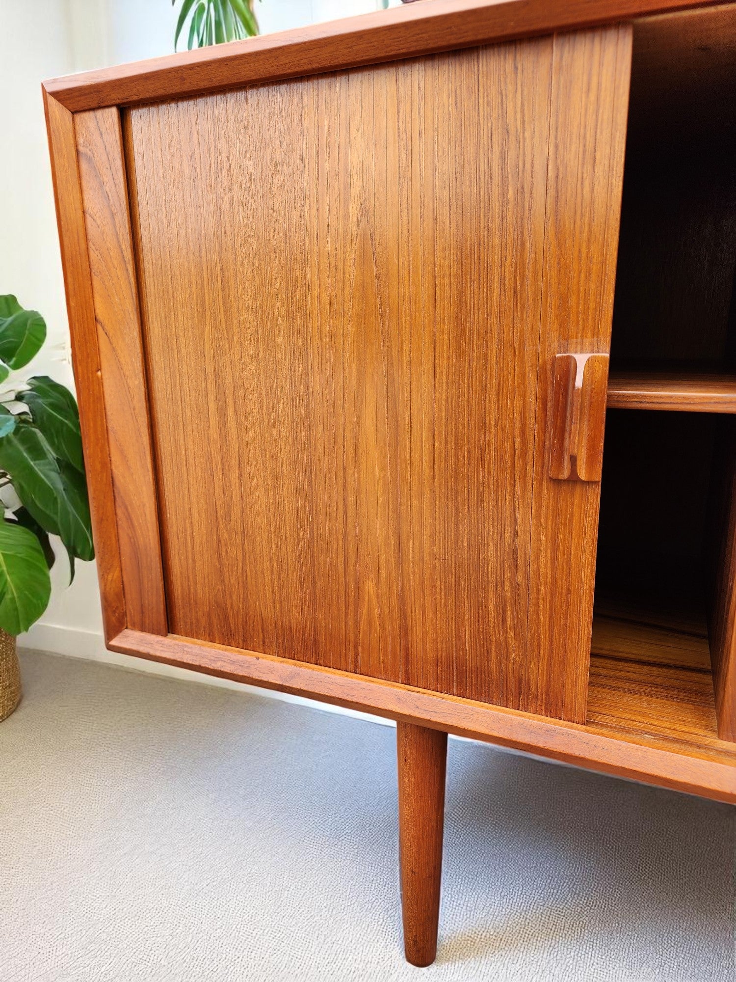 A gorgeous example of this iconic Danish design. Long and lean in glowing teak with elegantly tapered legs and lots of shelf and drawer space for storage. The wonderful tambour doors roll away out of sight when opened.
