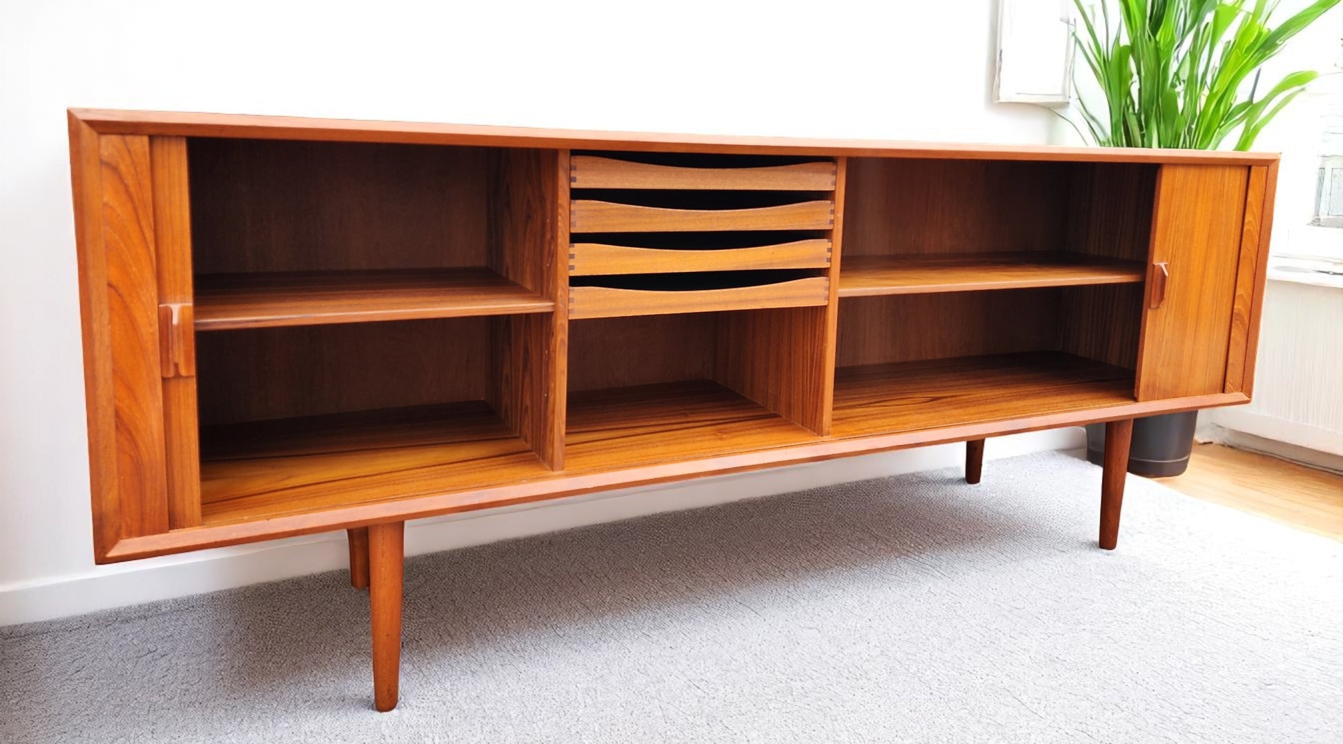 The sideboard has been stripped, sanded and refinished with Danish oil to almost like new condition with just a few minor blemishes on top.