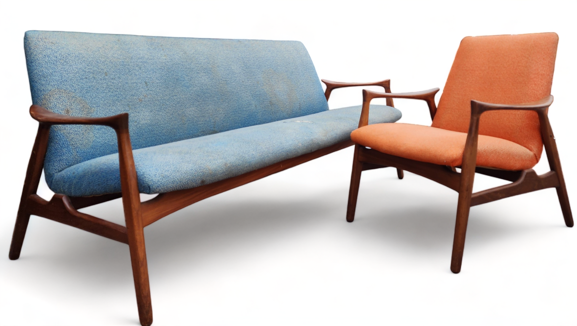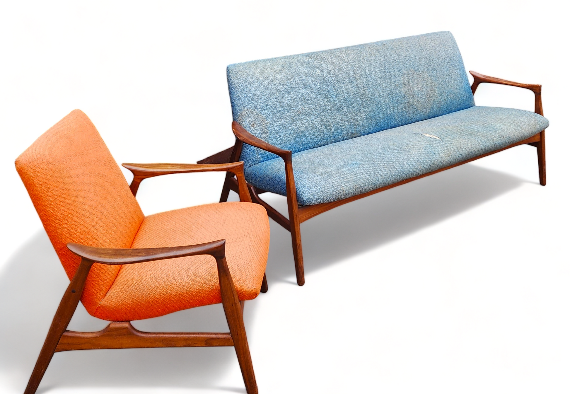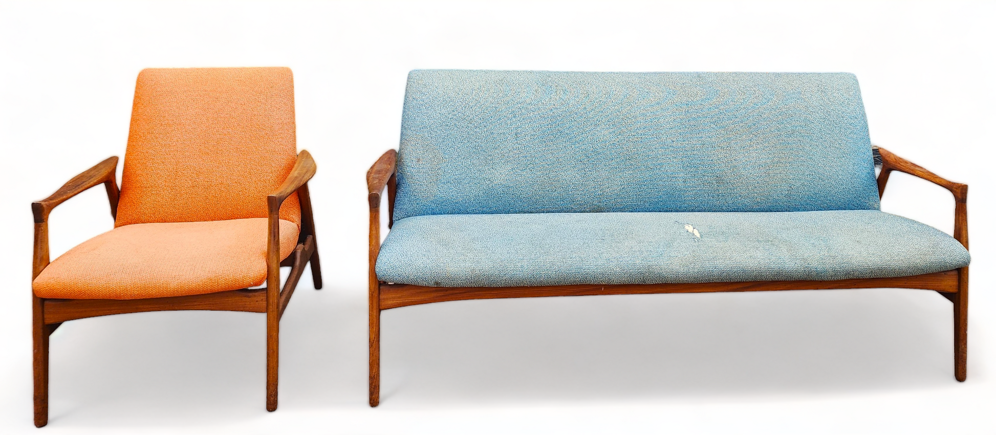 Both sofa and chair will be dismantled to the bare wood frame, springs checked, and then will be rebuilt again using high-quality foam and fabric of your choice. The teak parts will be stripped, sanded, and refinished with Danish oil to brand-new condition.